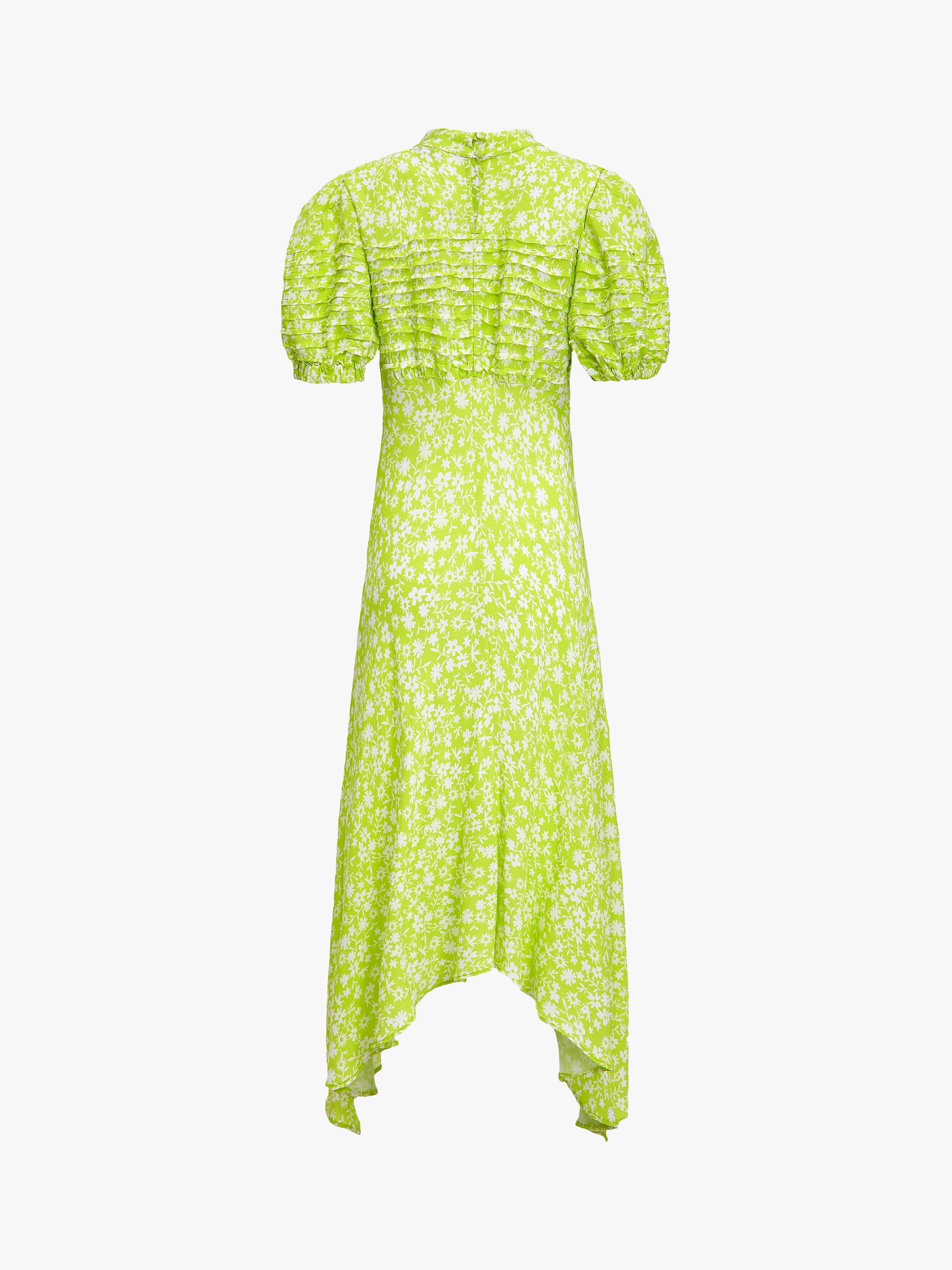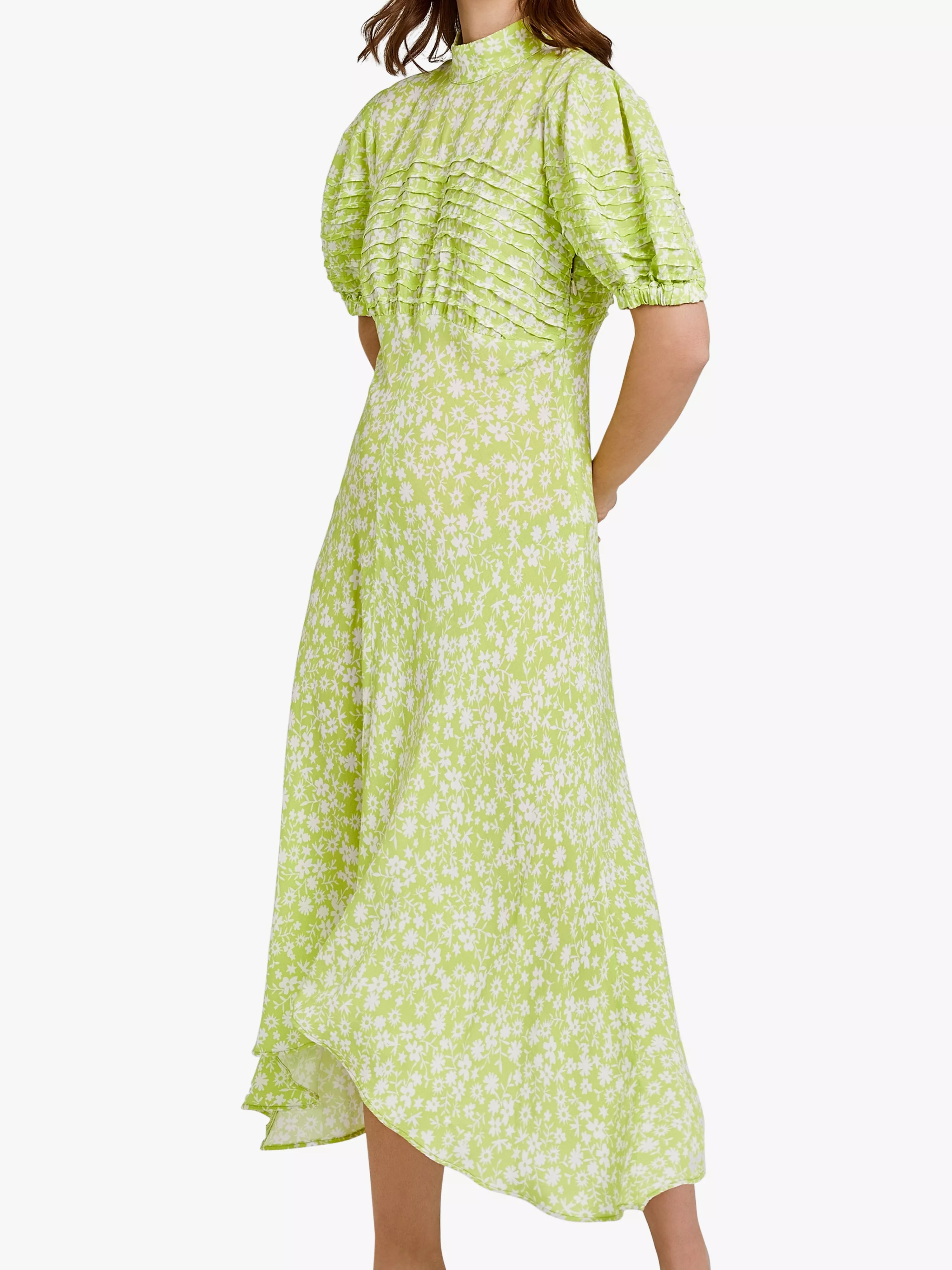 Crafted in a lightweight crepe fabric, this piece is cut with a loose shape that drapes over the body elegantly. It features a high neckline, pin-tuck detailing on the front and back bodice and short puffed sleeves. There's a slight flare to the skirt which falls to a floaty asymmetric hemline.