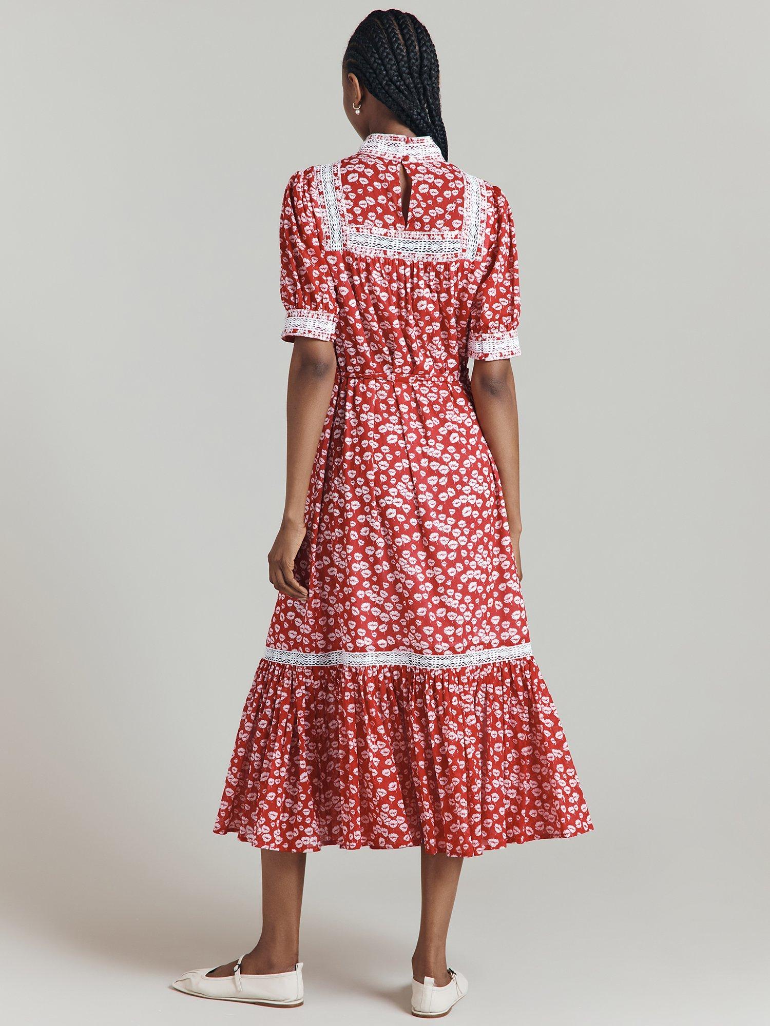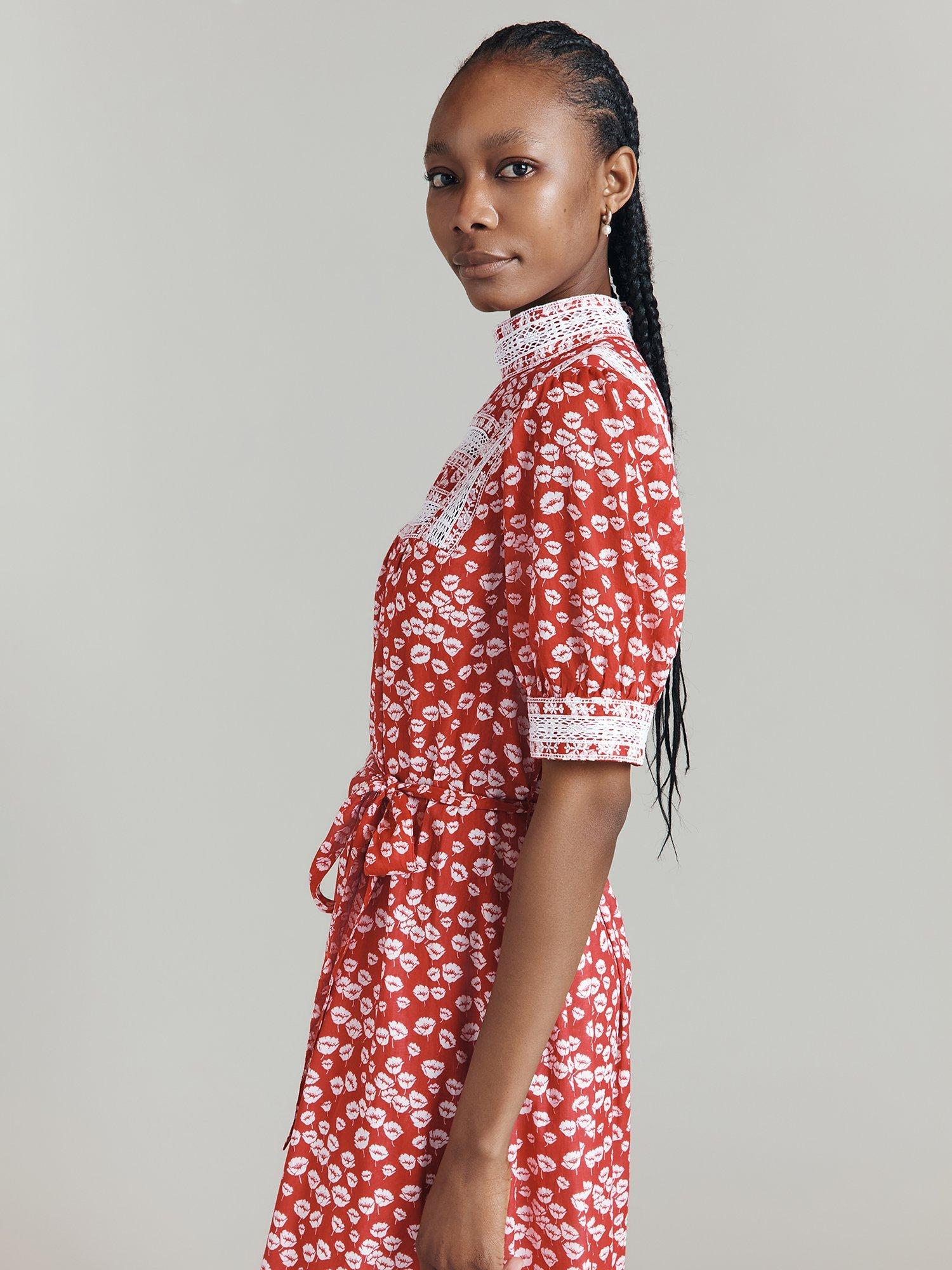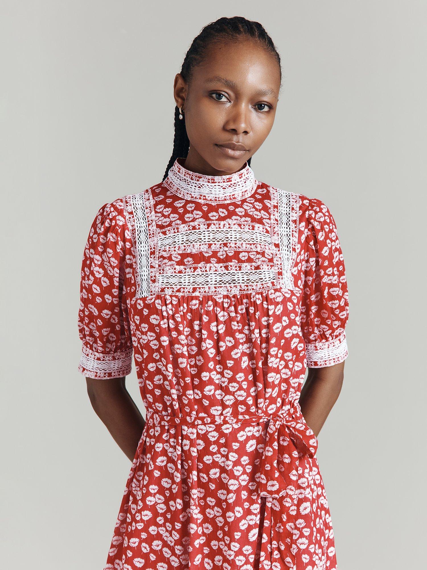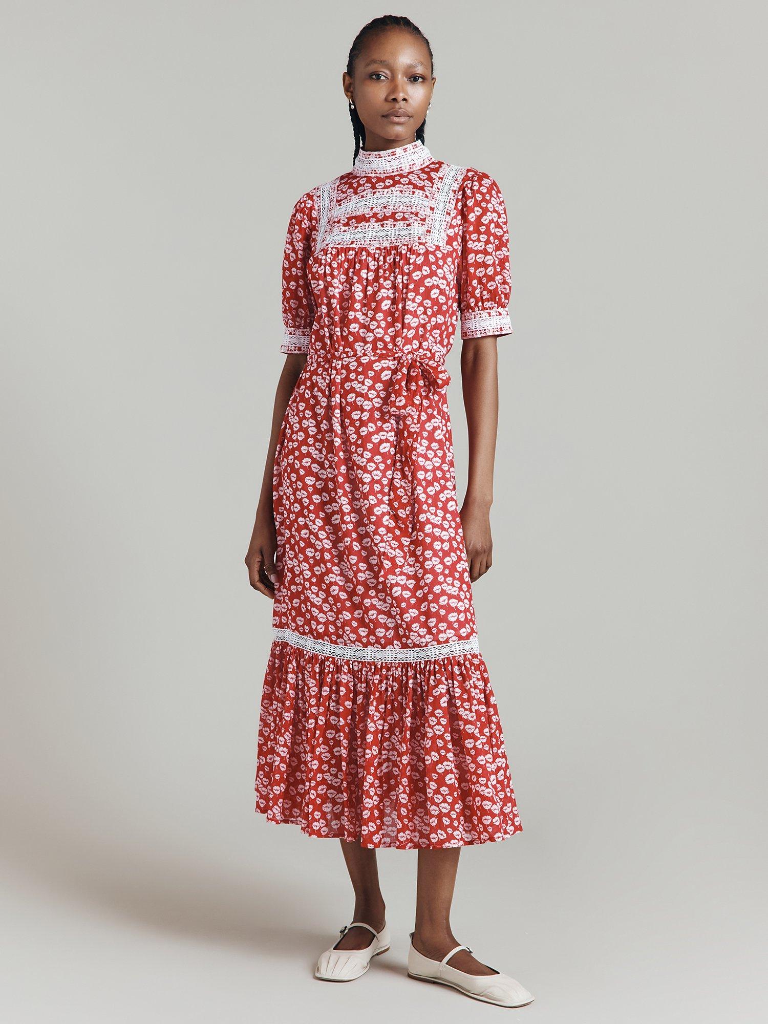 Ghost's Josephine dress takes all the style signatures of a classic prairie dress and makes them feel thoroughly modern. Her defining feature is the embroidery and lace detailing at the cuff, yoke, neck and along the skirt tier, while gathers in the bodice continue into the skirt to create fullness, with a self-tie belt that can cinch the waist.