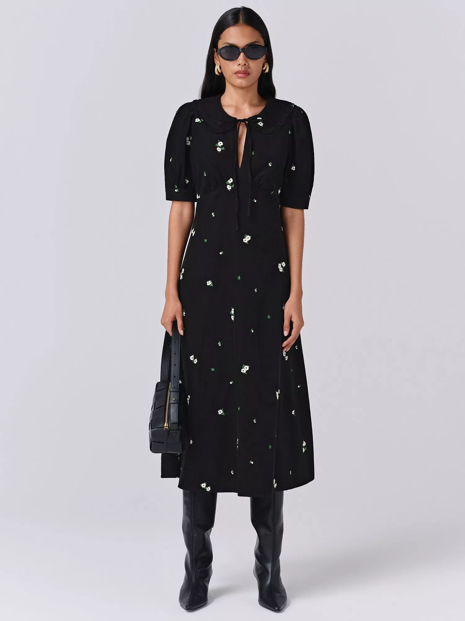 Welcome autumn with Juniper, a midi dress that makes the turning of the seasons all the more appealing. Made from corduroy for comforting weight, warmth and durability, there are countless reasons to love her. From the statement collar and neck tie to the peekaboo keyhole neckline, puff sleeves and floral embroidery dappled throughout, Juniper is a timeless piece that you’ll revisit year after year. Side seam zip fastening.