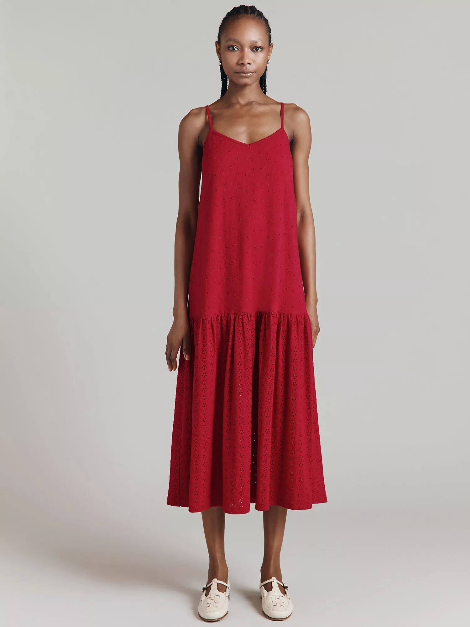 Bring on the sun with Kaylee, a midi-length slip dress in soft jersey. This elegant drop-waist style features two different cutwork embroidery designs and fine spaghetti straps with a horizontal tie detail at the back. Loose-fit for optimum comfort and a relaxed feel, she ll fast become your holiday wardrobe essential.