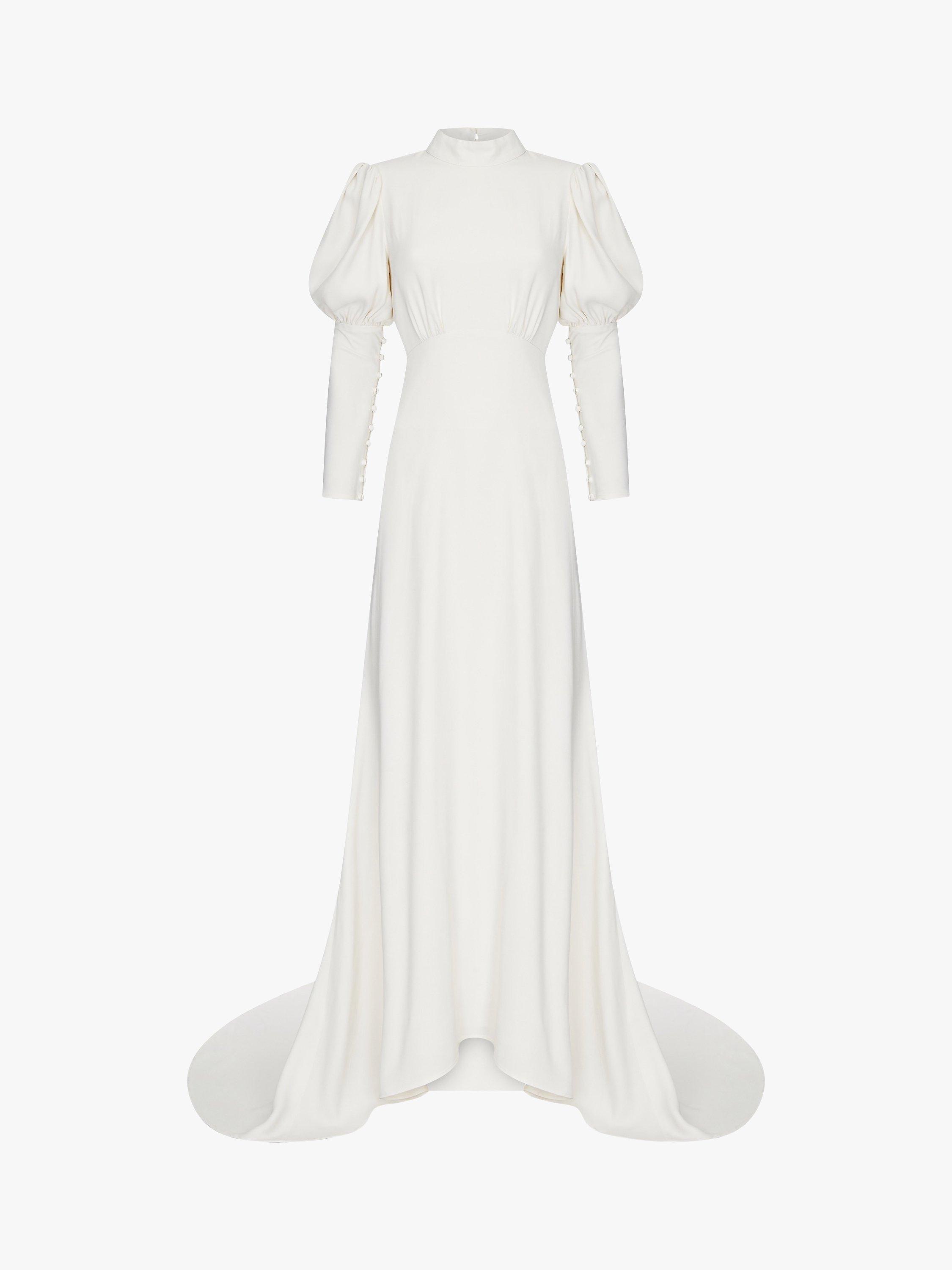 The simple high-neck collar is offset with a dramatic, diamond-shaped cut-out and keyhole detail to the back while its puffed sleeves are beautifully bohemian, cinched from the elbow down into deep cuffs with delicate fabric-covered buttons on each side.