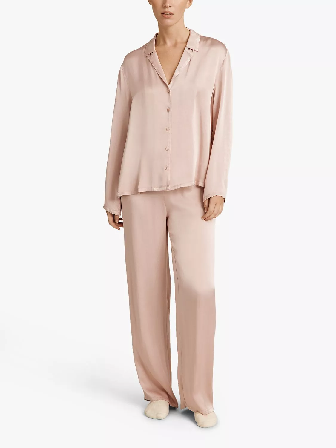 Lightweight and soft against the skin, the Liberty nightwear set is made from smooth filament satin. Long-sleeves and matching straight cut trousers with an elasticated waist ensure warmth and comfort perfect for snuggling on the sofa to watch your favourite box set. The button-up shirt and loose collar provide a stylish yet easy to wear look. Staying in your PJ’s all day never looked so good.