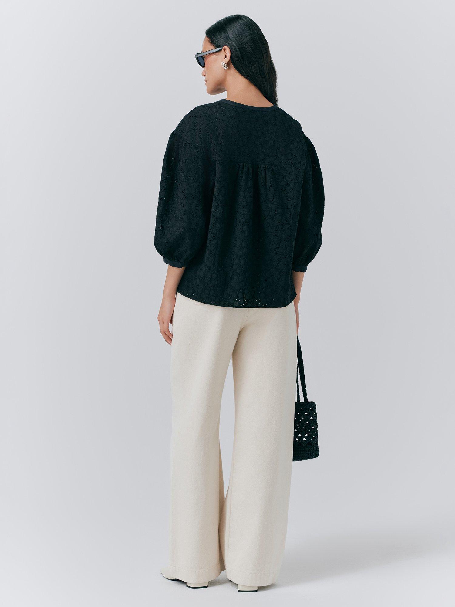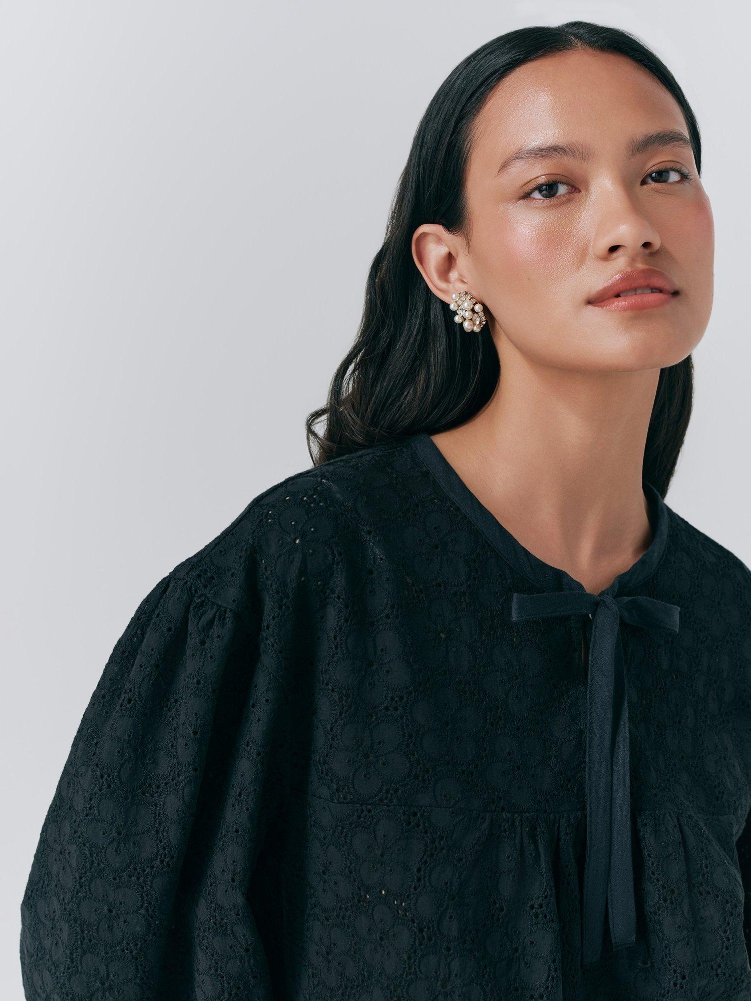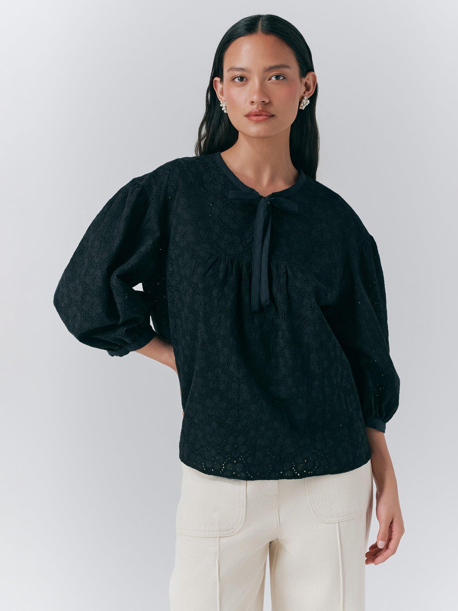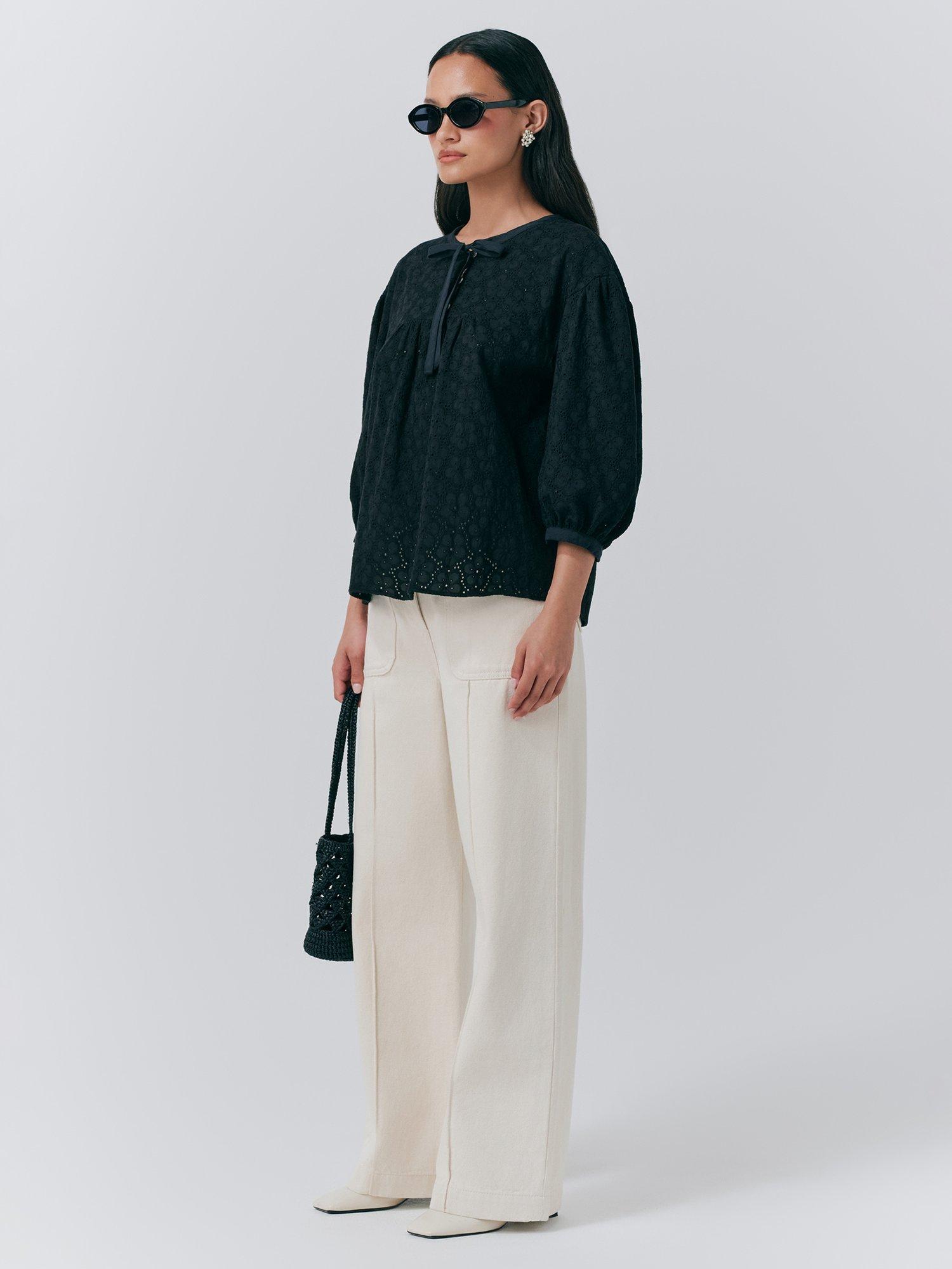 This cotton blouse from Ghost features a tie neck, three-quarter length sleeves and is detailed with broderie anglaise.