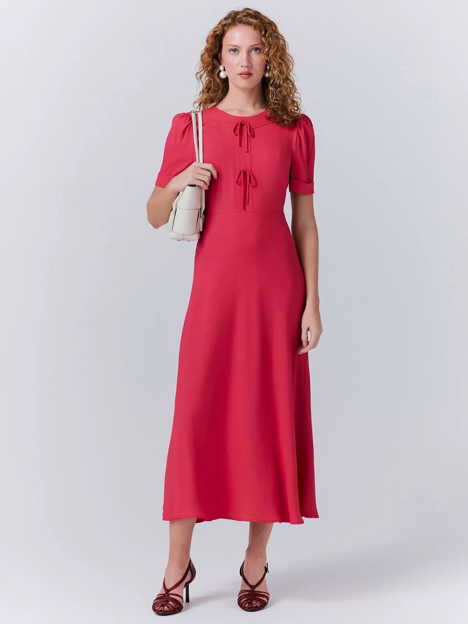 Fall in love with Louisa, the epitome of refined elegance with details to die for. Two delicate bows atop bold seam detailing on the bodice are the main feature, with gently gathered short sleeves with a cuff and button fastening adding to the feminine feeling. Made from satin back crepe with a bias cut skirt for a voluminous sweep.
