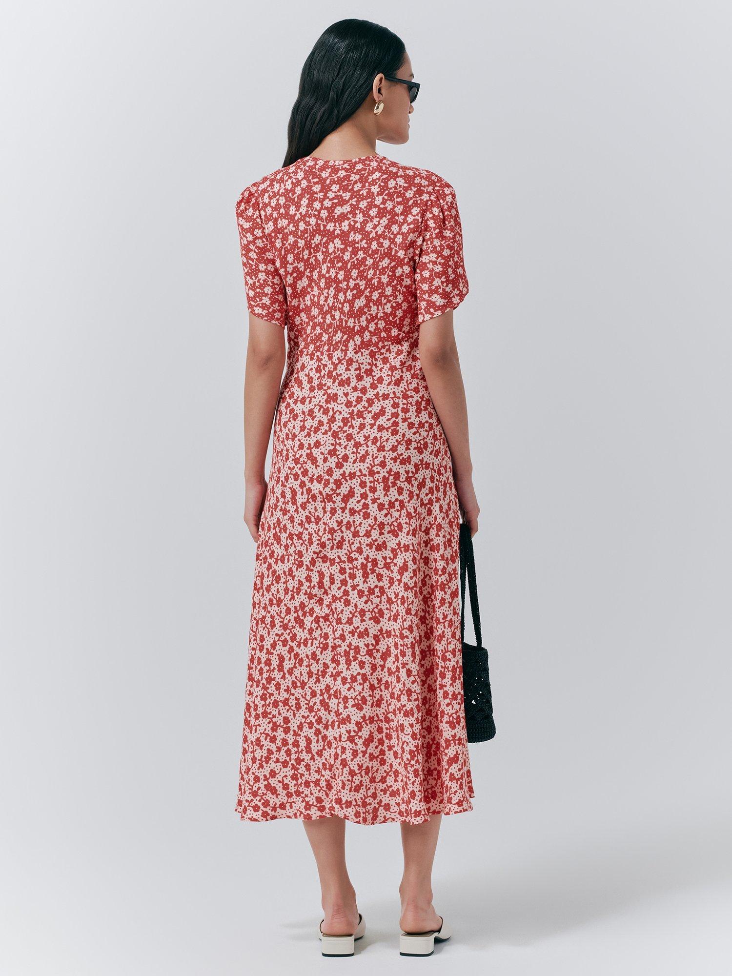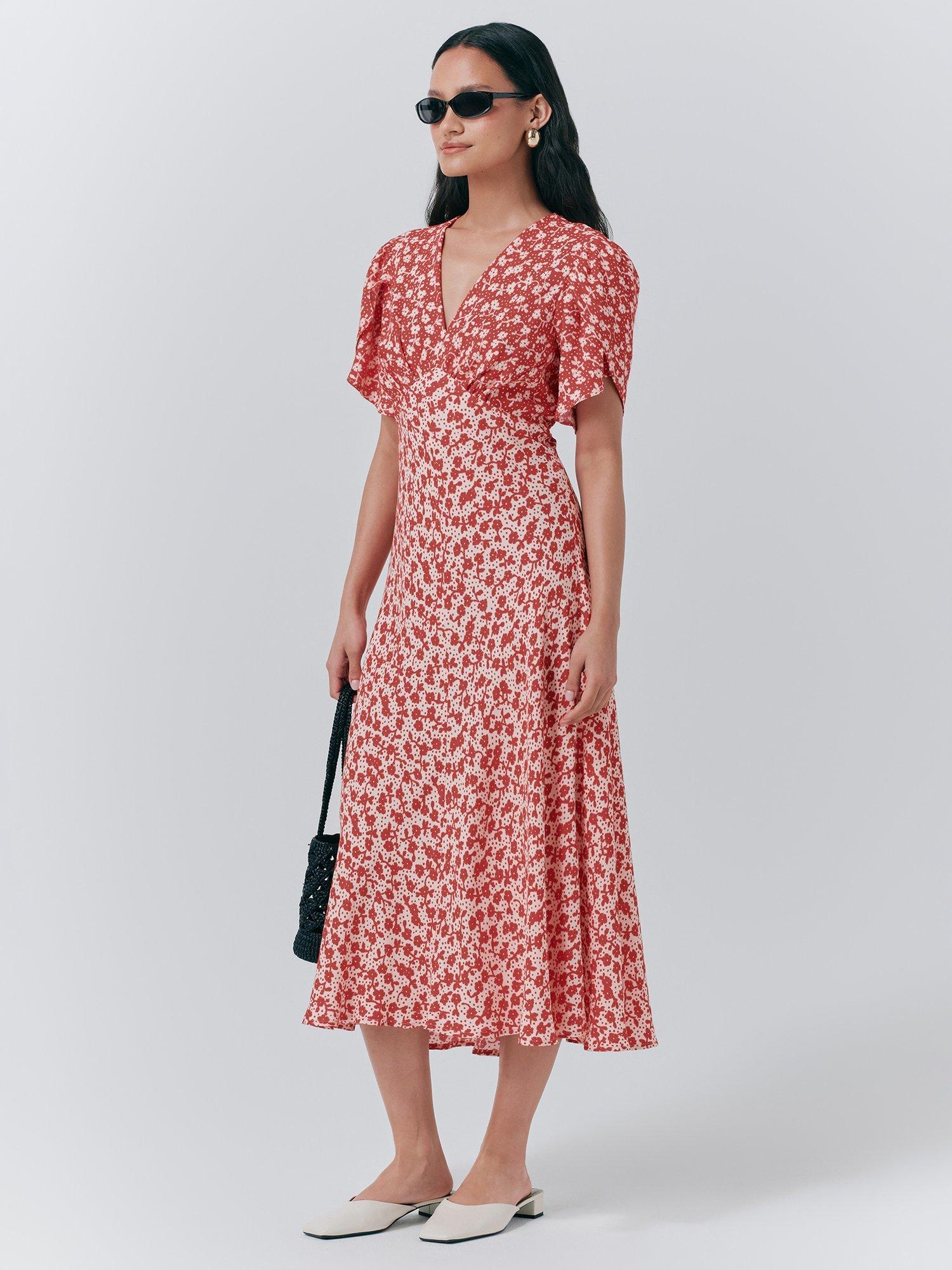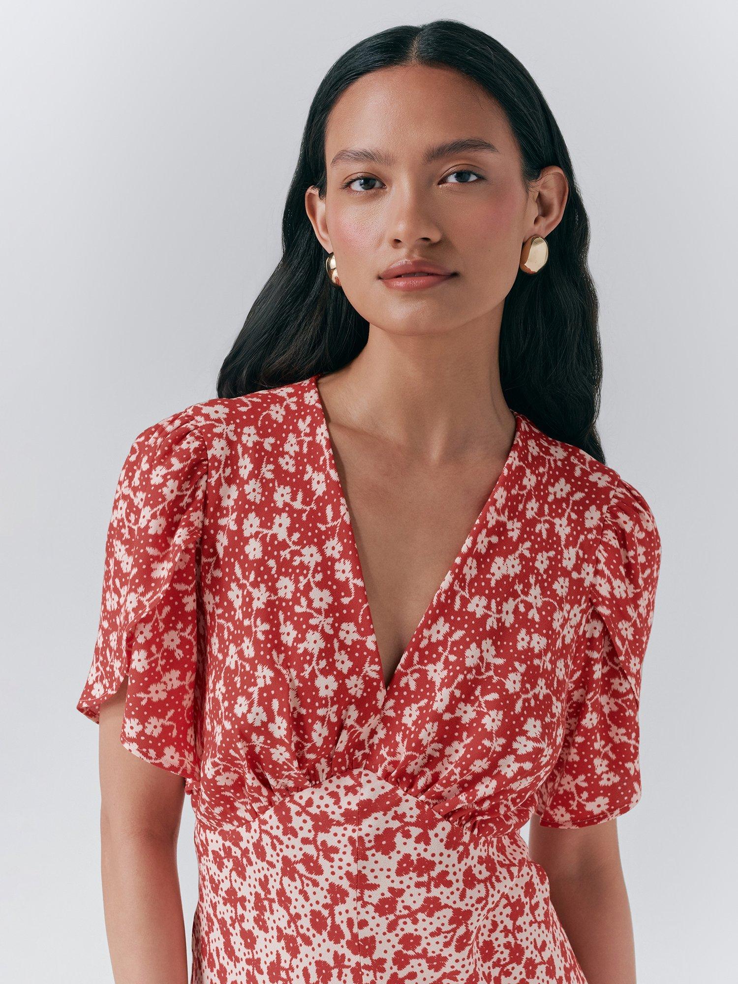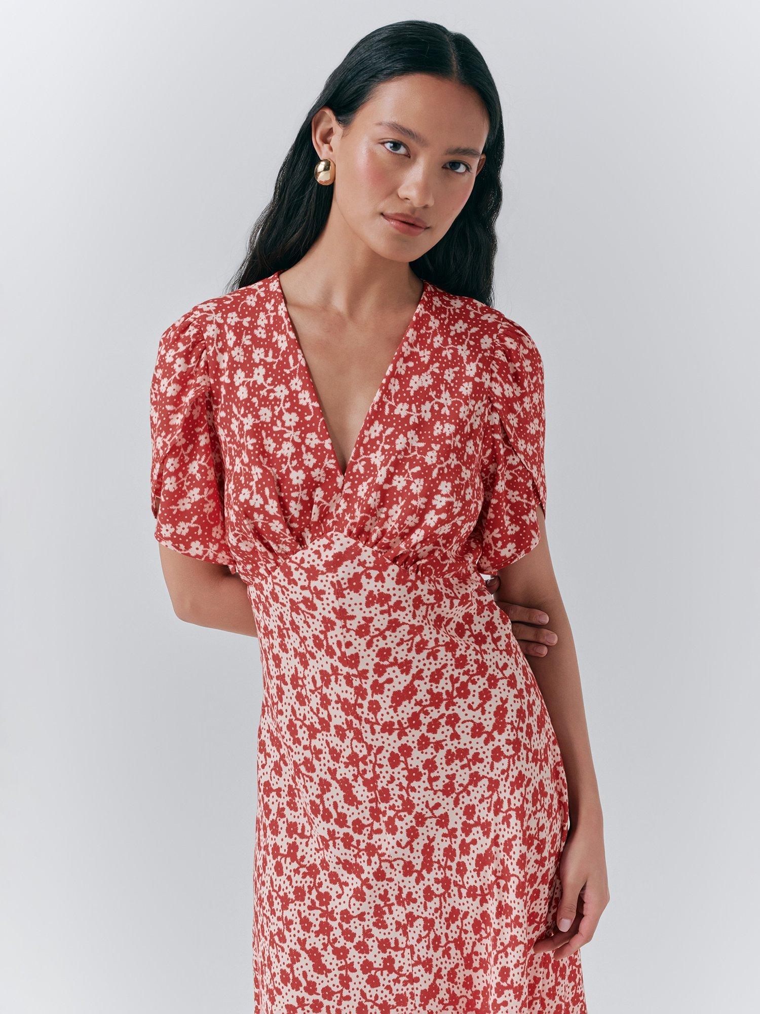 Pretty florals encapsulate this dress with its short sleeves with gathered cuffs, v neck and under-bust seams for a fitted look.