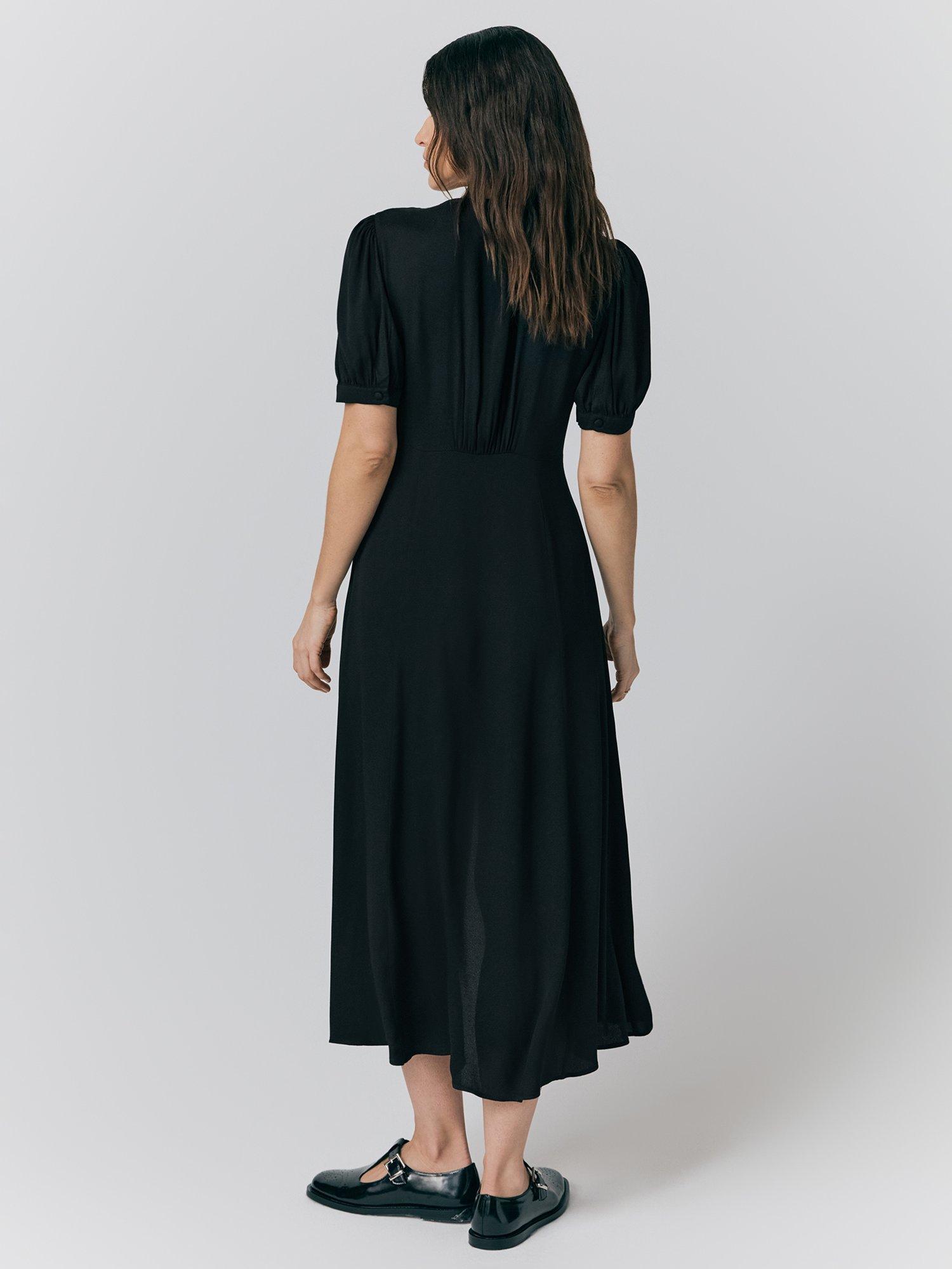 A dress with short puffed sleeve with gathered cuffs, button detailing at front, v-neck, and seam at waist for a fitted look.