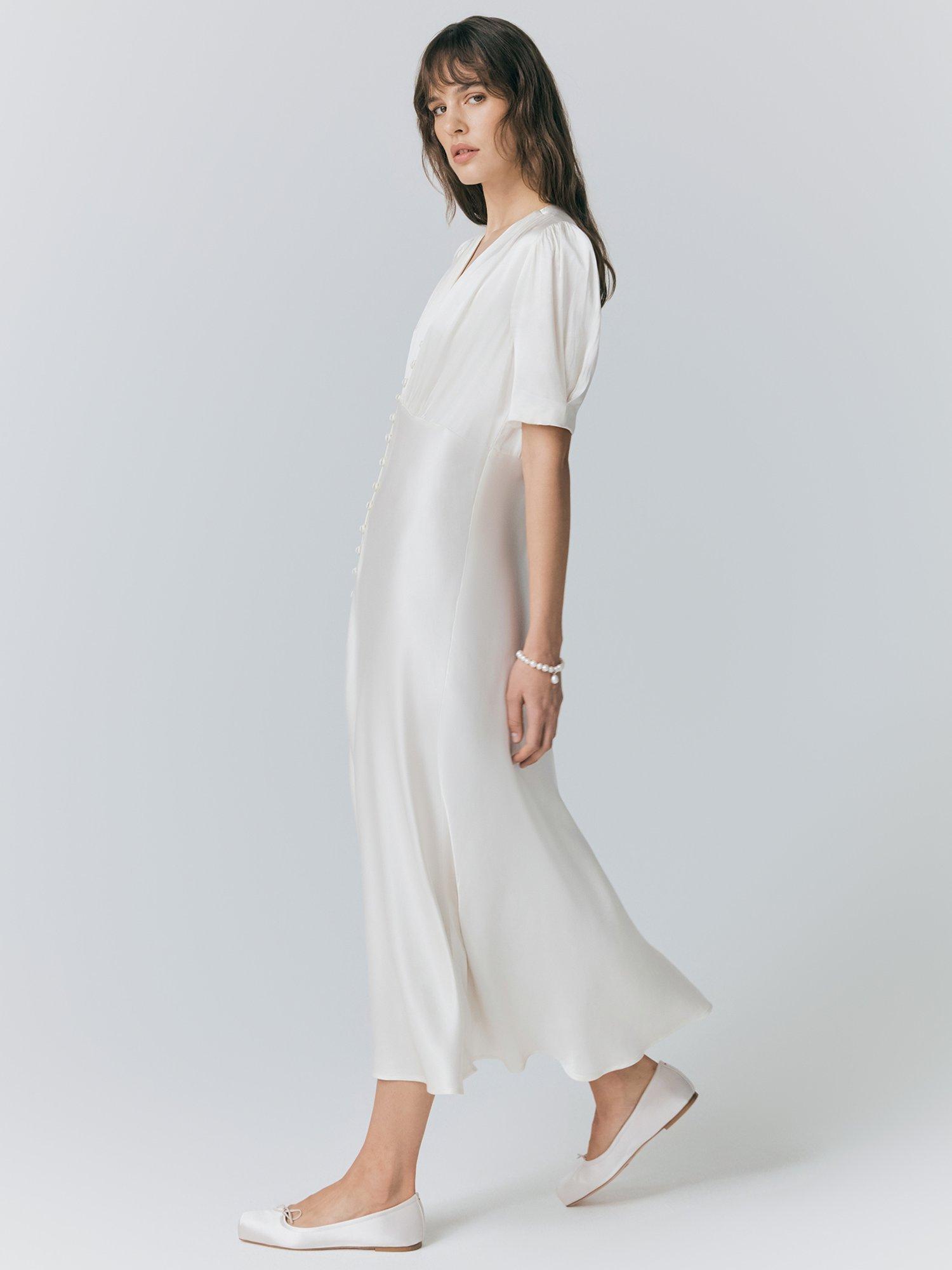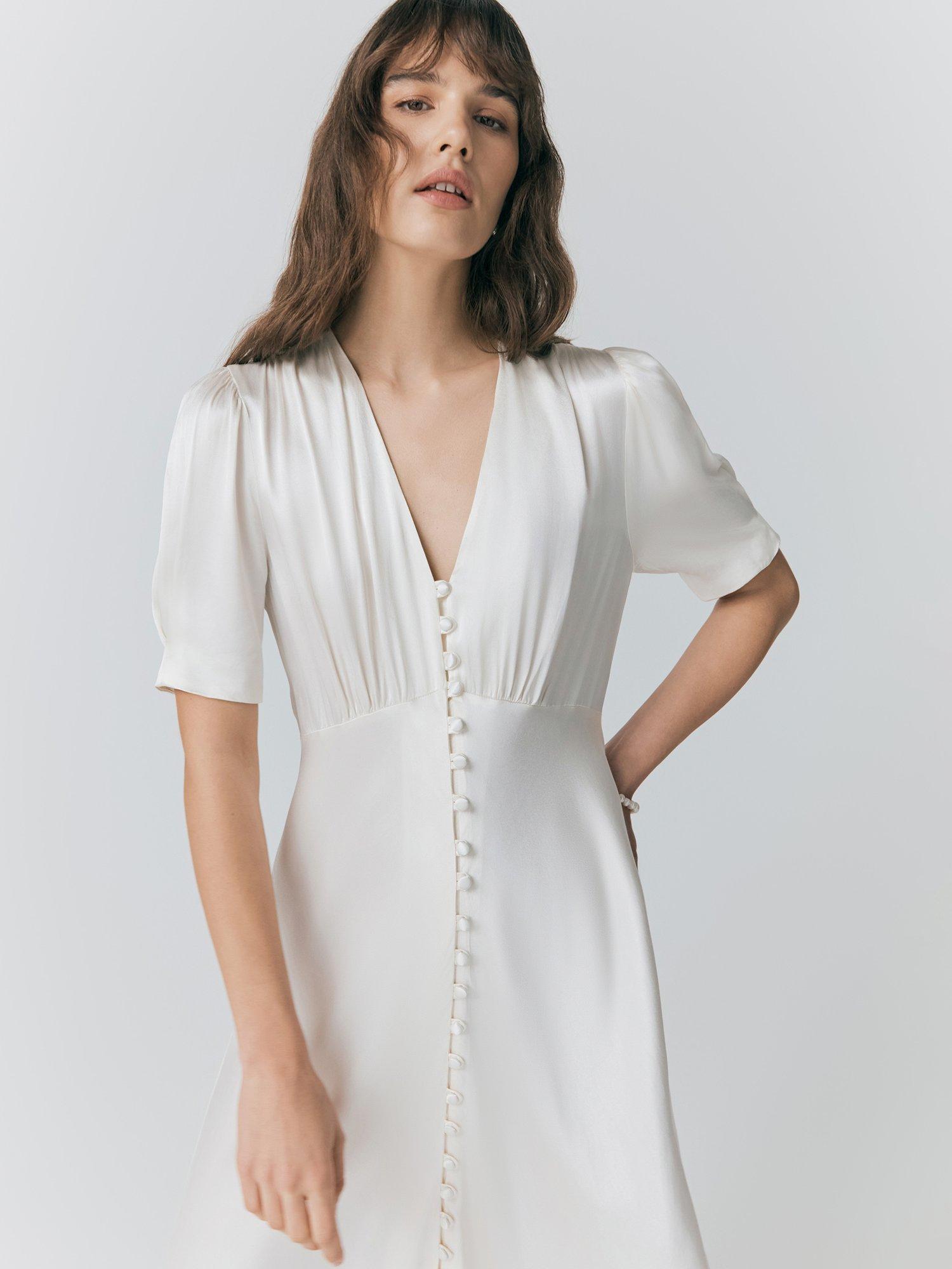 If you need a simple yet striking showstopper outfit, look no further than the Madison dress. Cut from a lightweight filament satin, this vintage-inspired style features puffed shoulders, fabric covered buttons and three-quarter length sleeves. With a classic silhouette and front split detail, this ultra-feminine dress will endure season after season - plus, it would also make the perfect bridesmaid's dress.