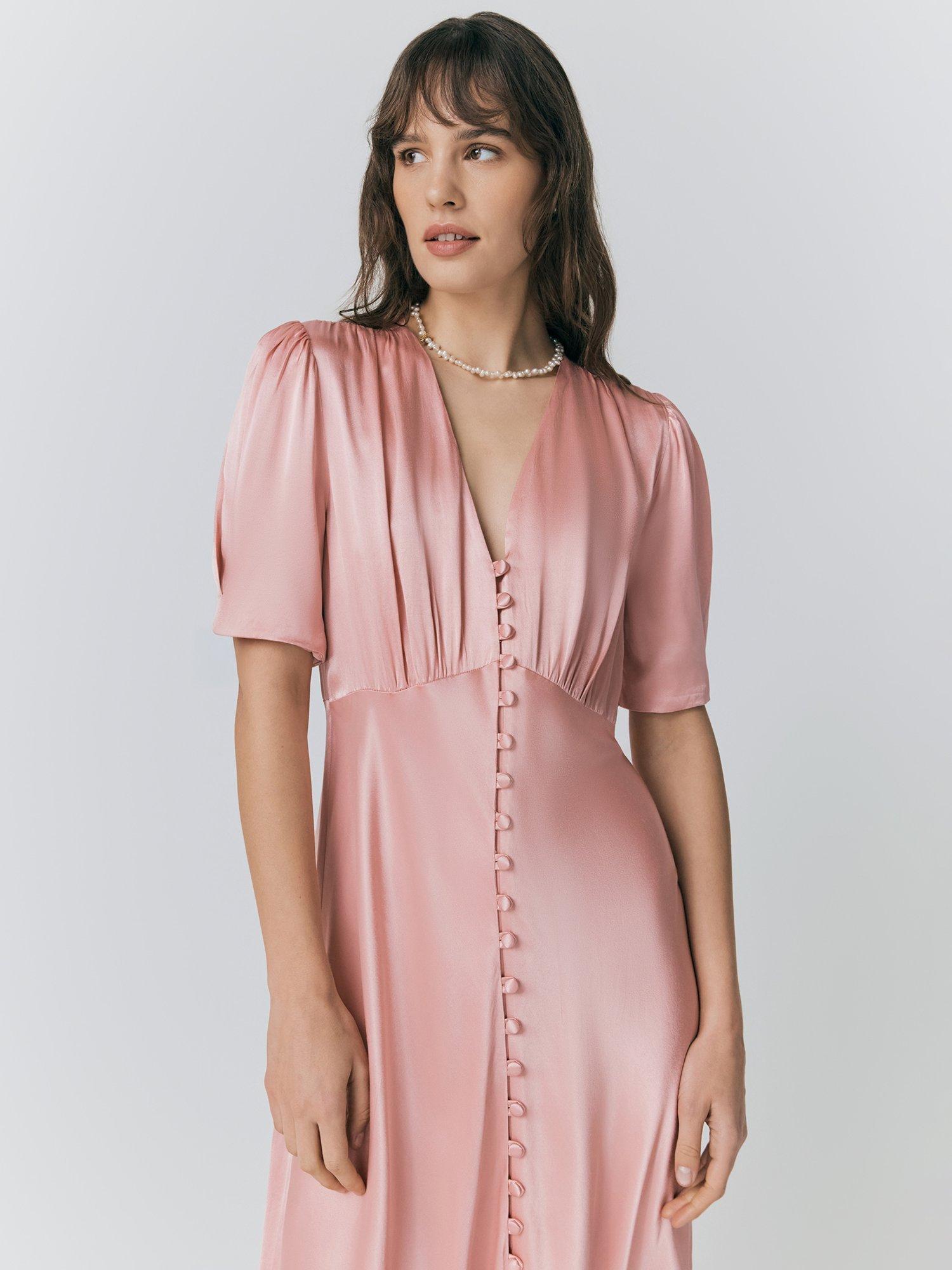 The classic tea dress silhouette is one we revisit season after season, and it's never looked better than Madison. A flattering bias cut style in a delicate satin, its beauty lies in its subtle detailing, from covered buttons running down the front to gently puffed sleeves and an elegant v neck. Add her to your wardrobe for a fail-safe piece you'll turn to time and time again.