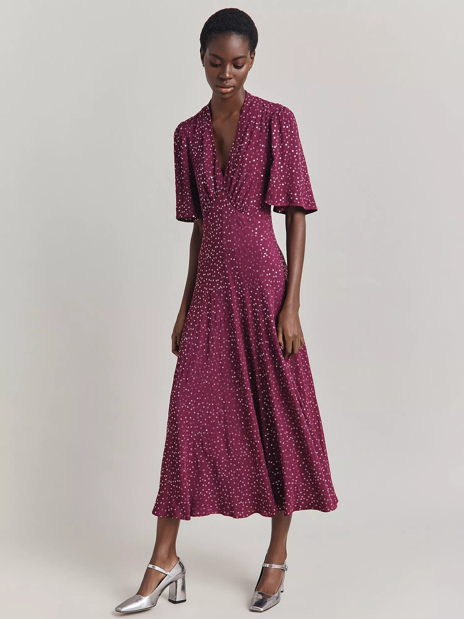 Designed in a fuss-free A-line style, this midi dress from Ghost is dreamt up from whisper-weight viscose. With a fuss-free but smart v-neckline and elbow length sleeves, it is drenched with season-less spots.