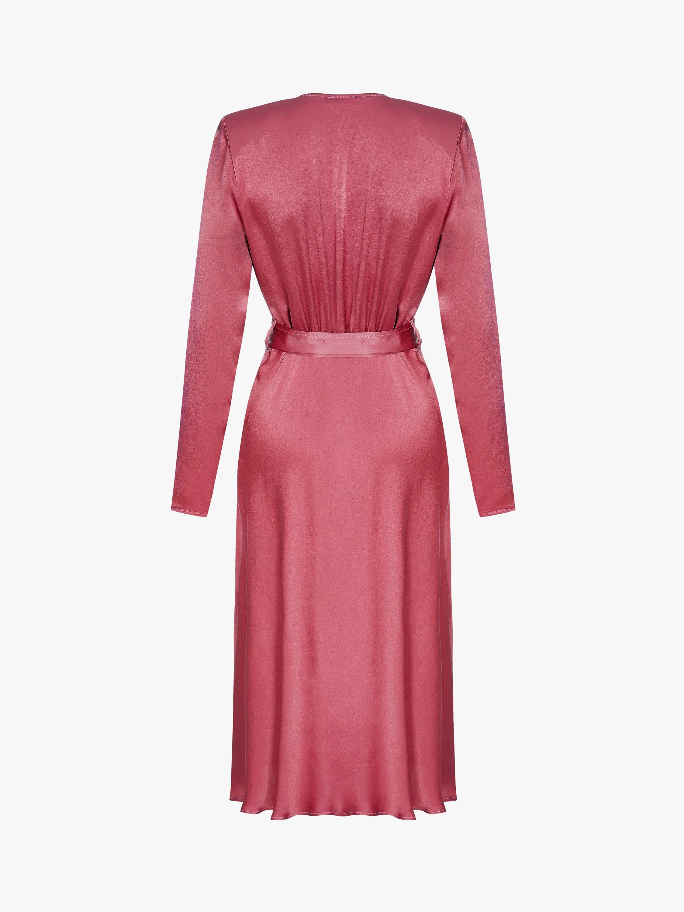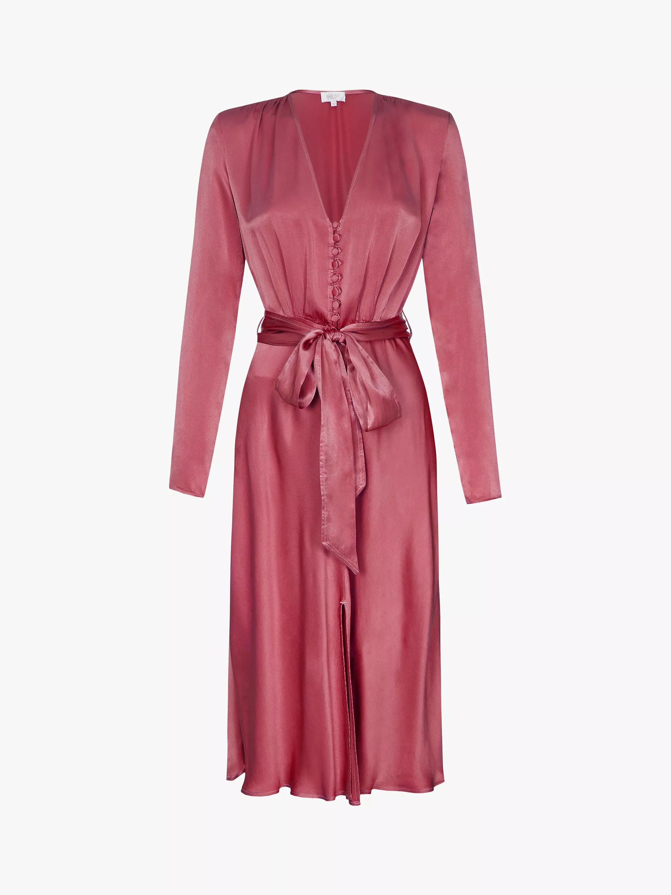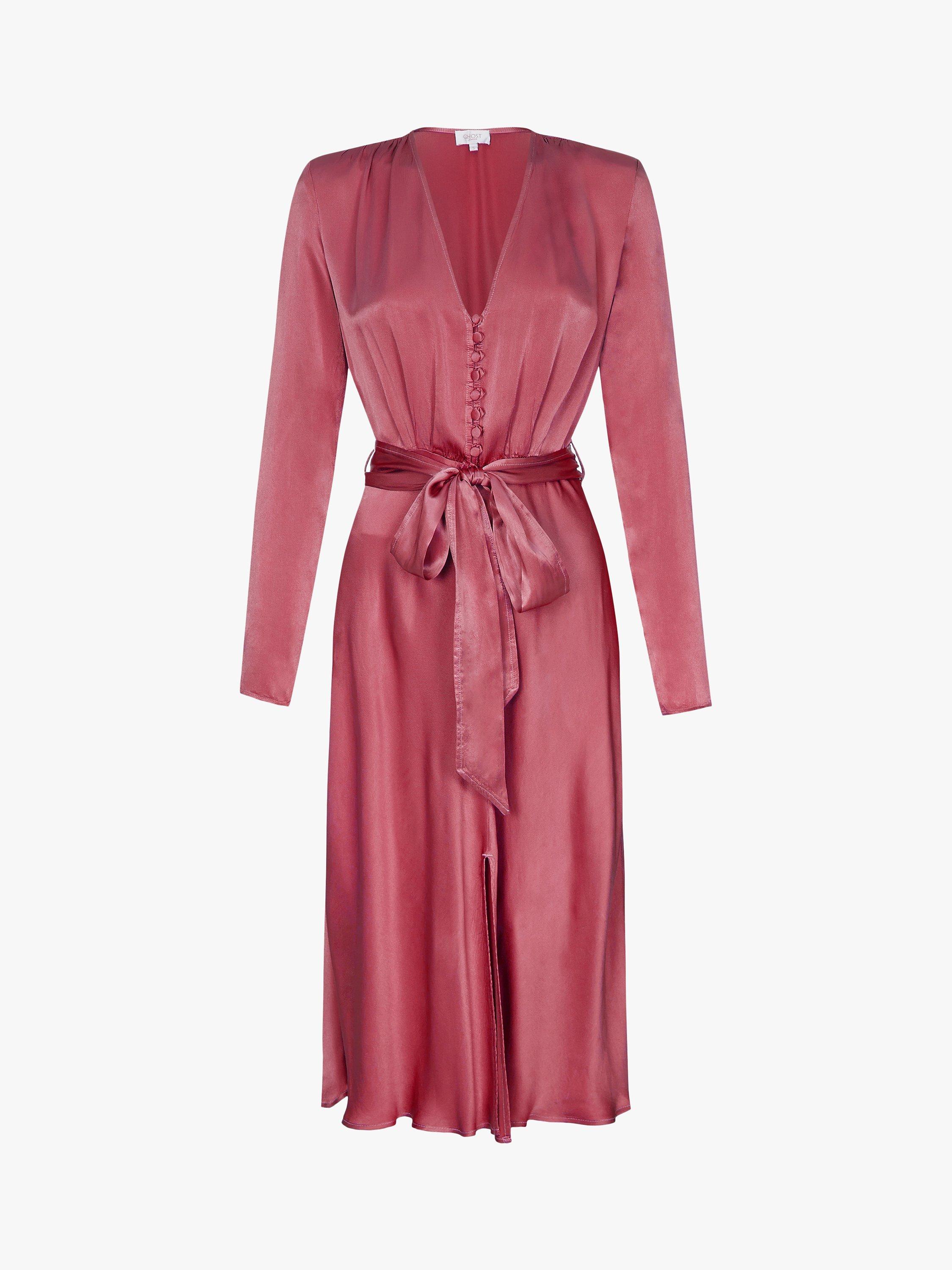 Designed in a stunning satin, the Meryl dress features pleats at the padded shoulders and seaming at the waist for a glamorous vintage silhouette. The bias cut skirt gives you a flattering fit, and front split adds movement whilst you walk. Featuring a wrap tie at the waist to complete the elegant look.