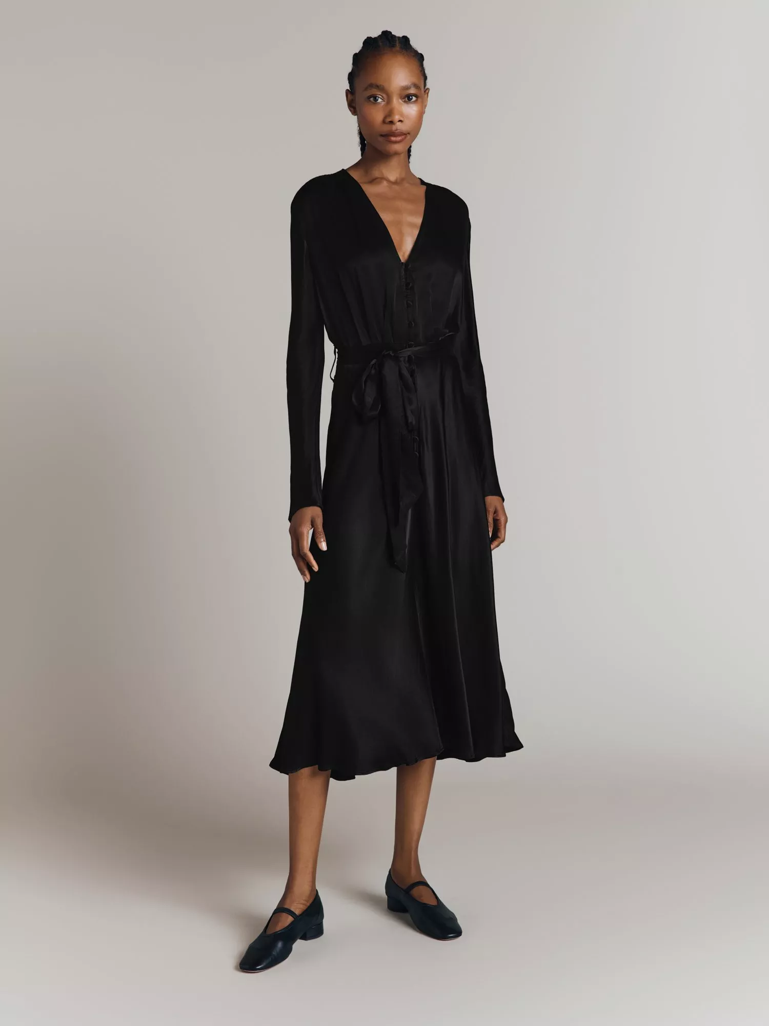 Designed in stunning satin, our knee-length Meryl dress is a pretty button-through style that features pleats at the padded shoulders, seaming at the waist for a glamorous silhouette and a wrap tie to complete the elegant look. The bias-cut skirt makes for a flattering fit, while the front split adds a touch of femininity showcasing just the right amount of leg. Wear yours with stylish heels for a cocktail party or dinner date - plus it would also make the perfect bridesmaid's dress.