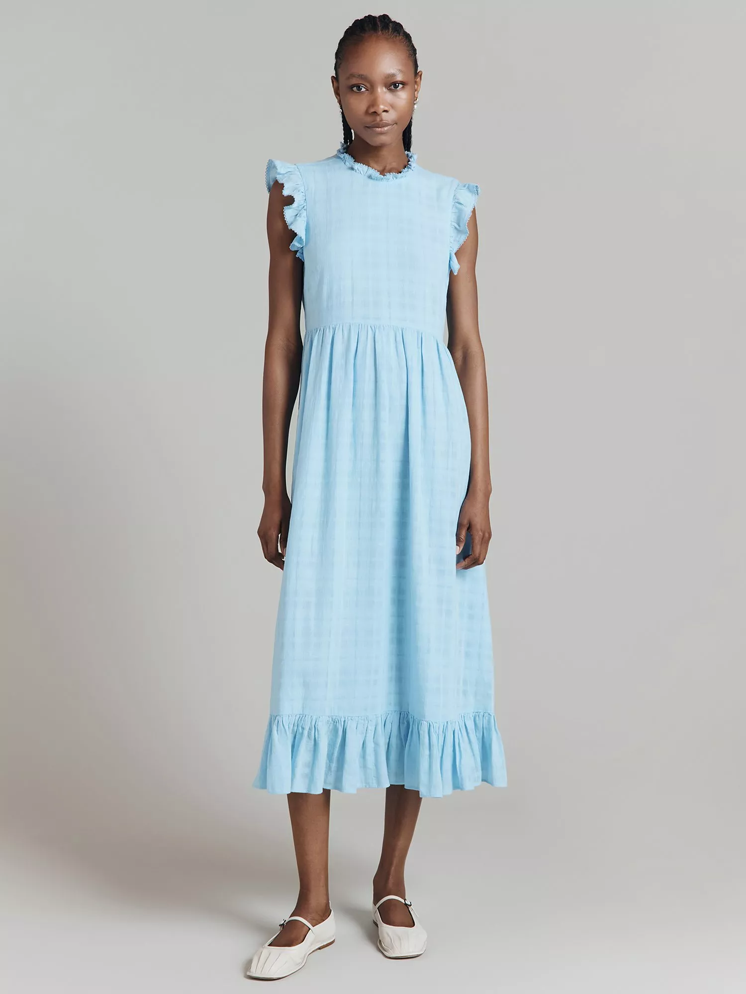 You can never underestimate the impact of a frill, as Monique proves. A midi dress in a subtle check-textured cotton, this sleeveless style is made with a relaxed fit that is beautifully juxtaposed with delicate frills at the shoulders and neck, where they are edged with lace, and hem. Fully lined. Concealed side-zip fastening.