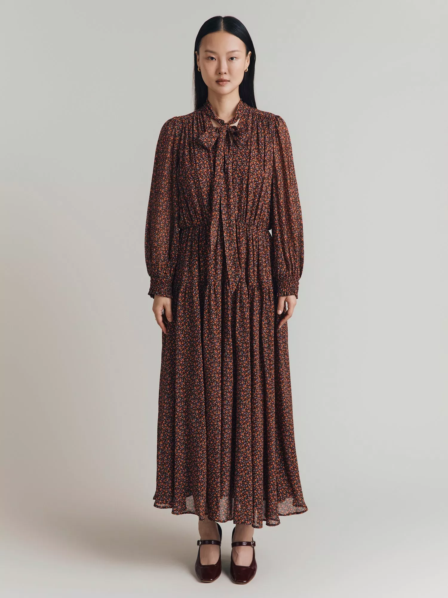 Long sleeve poppy georgette floral printed midi dress with tie detail at neck and shirred cuffs.