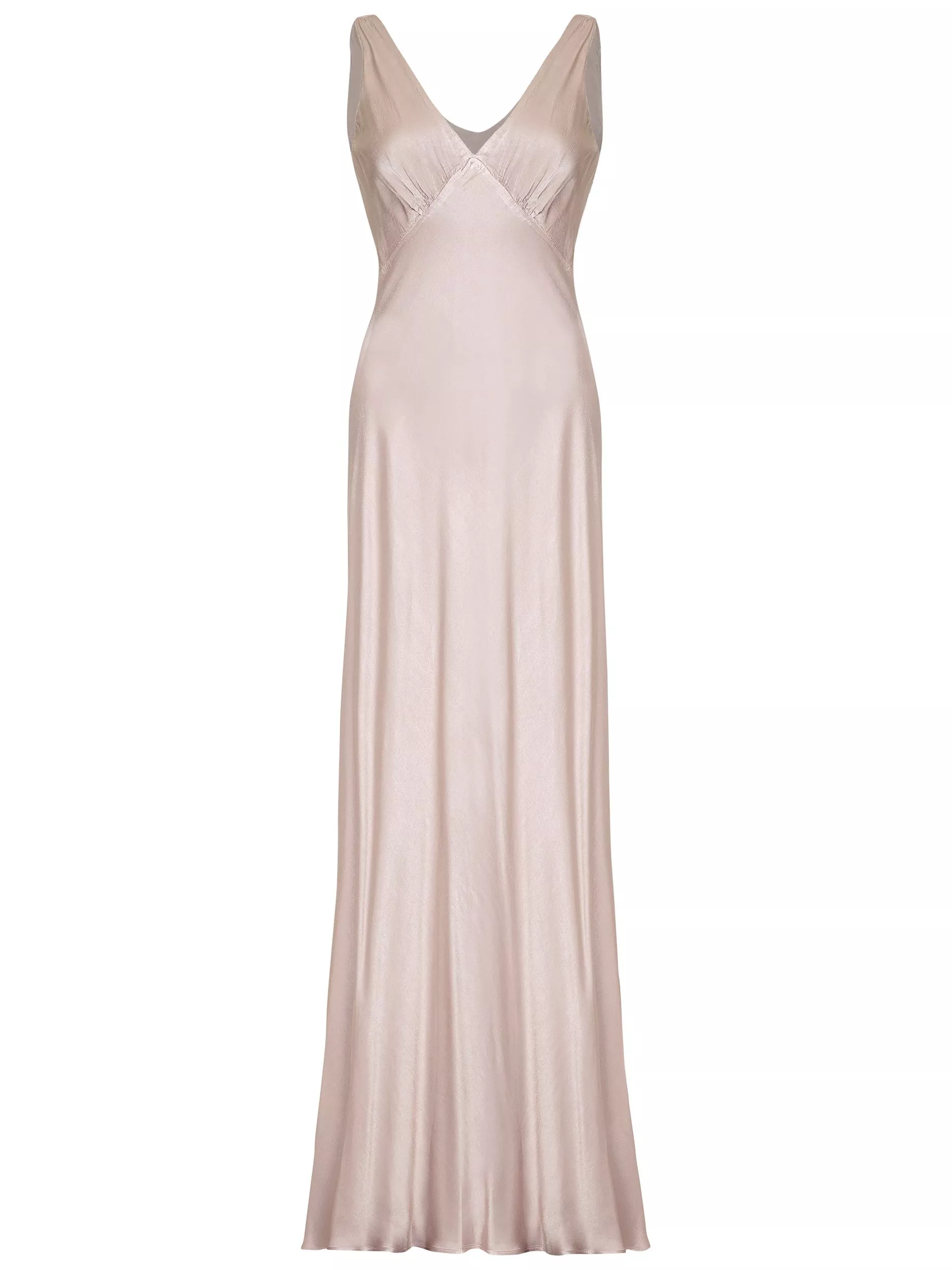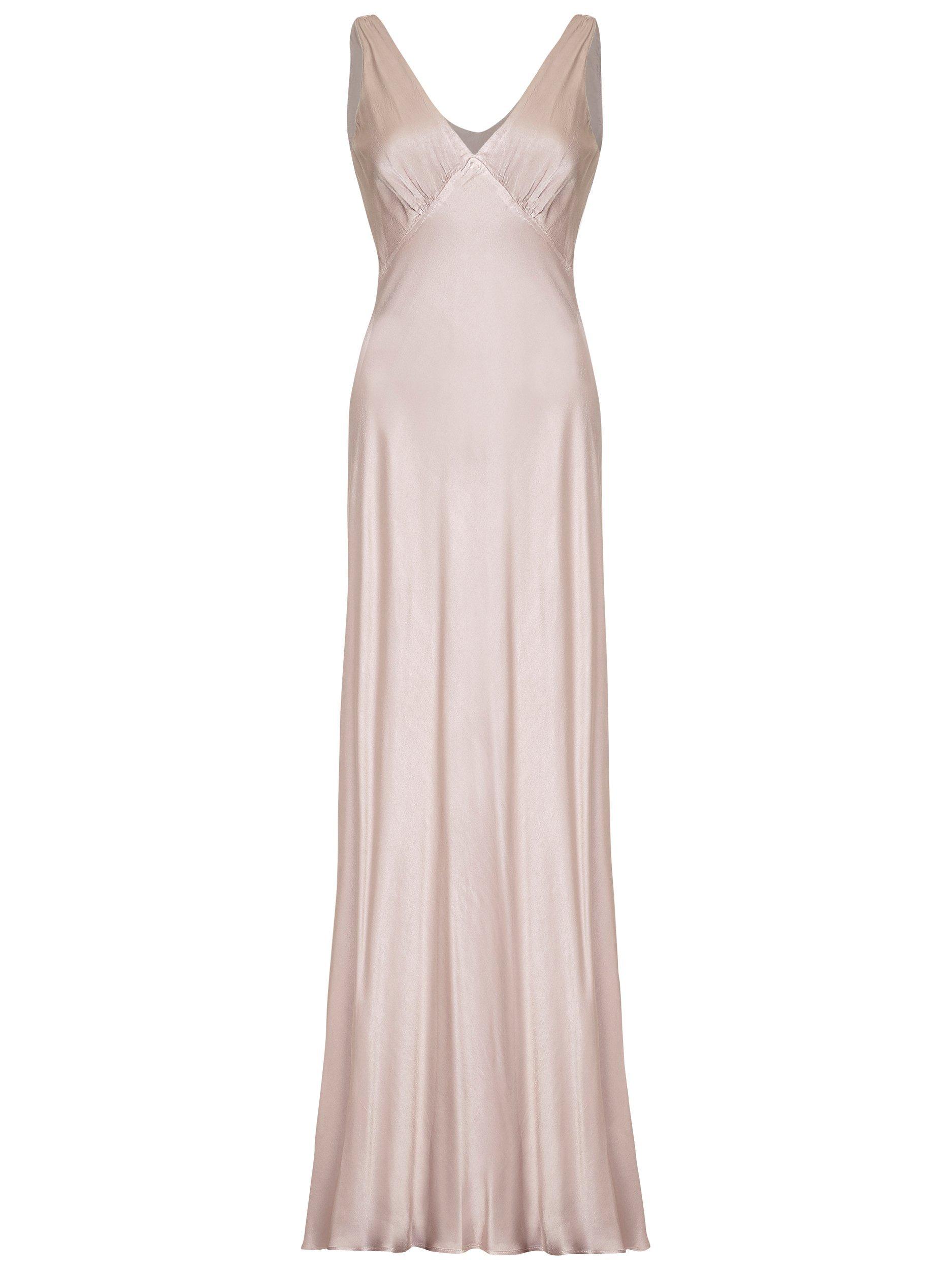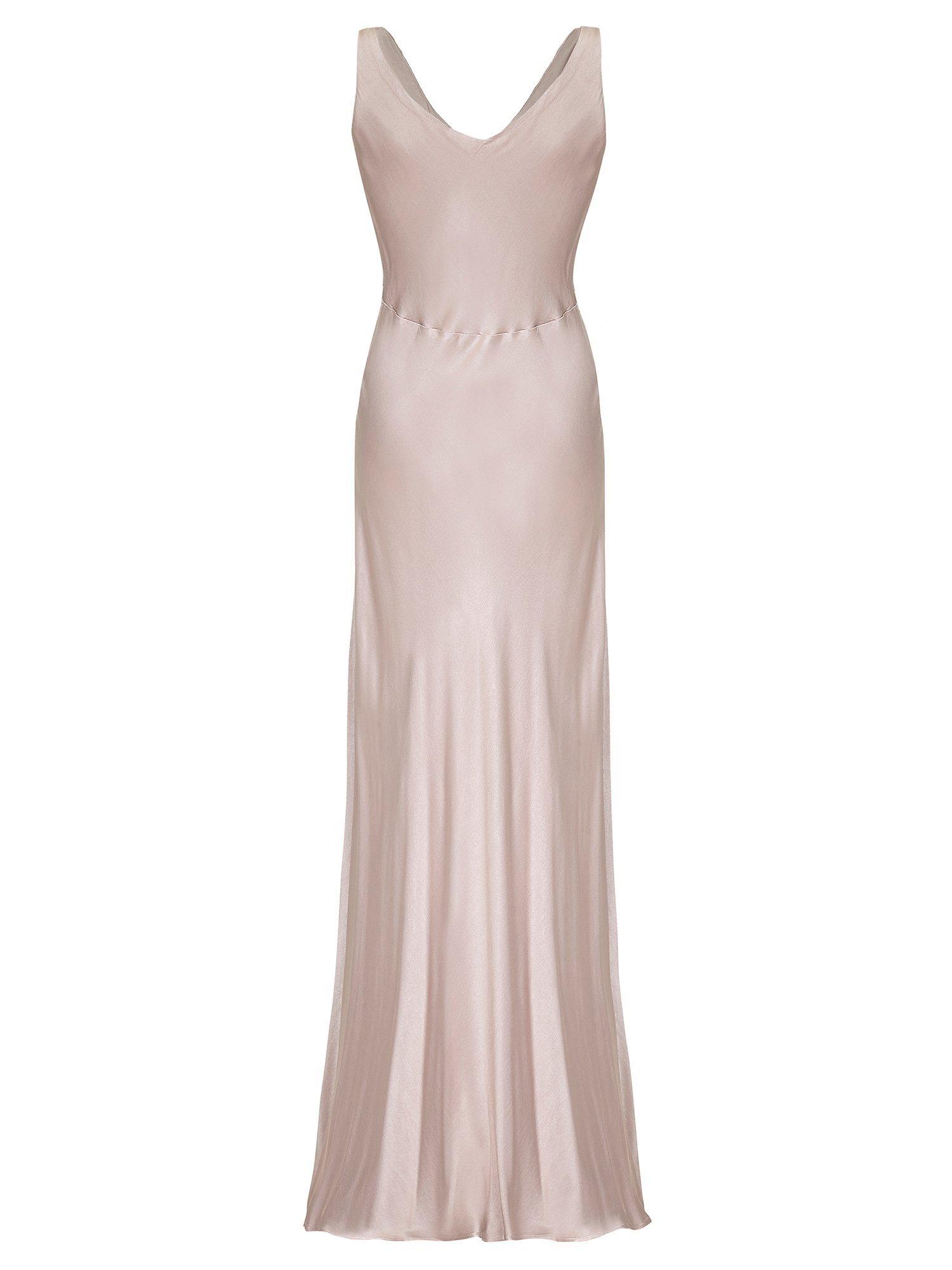 With vintage inspired appeal, this piece features a gentle v neckline at the front and back and an empire line design with gathering at the bust. Simple yet beautiful, it falls to a floor sweeping length and is fully lined.