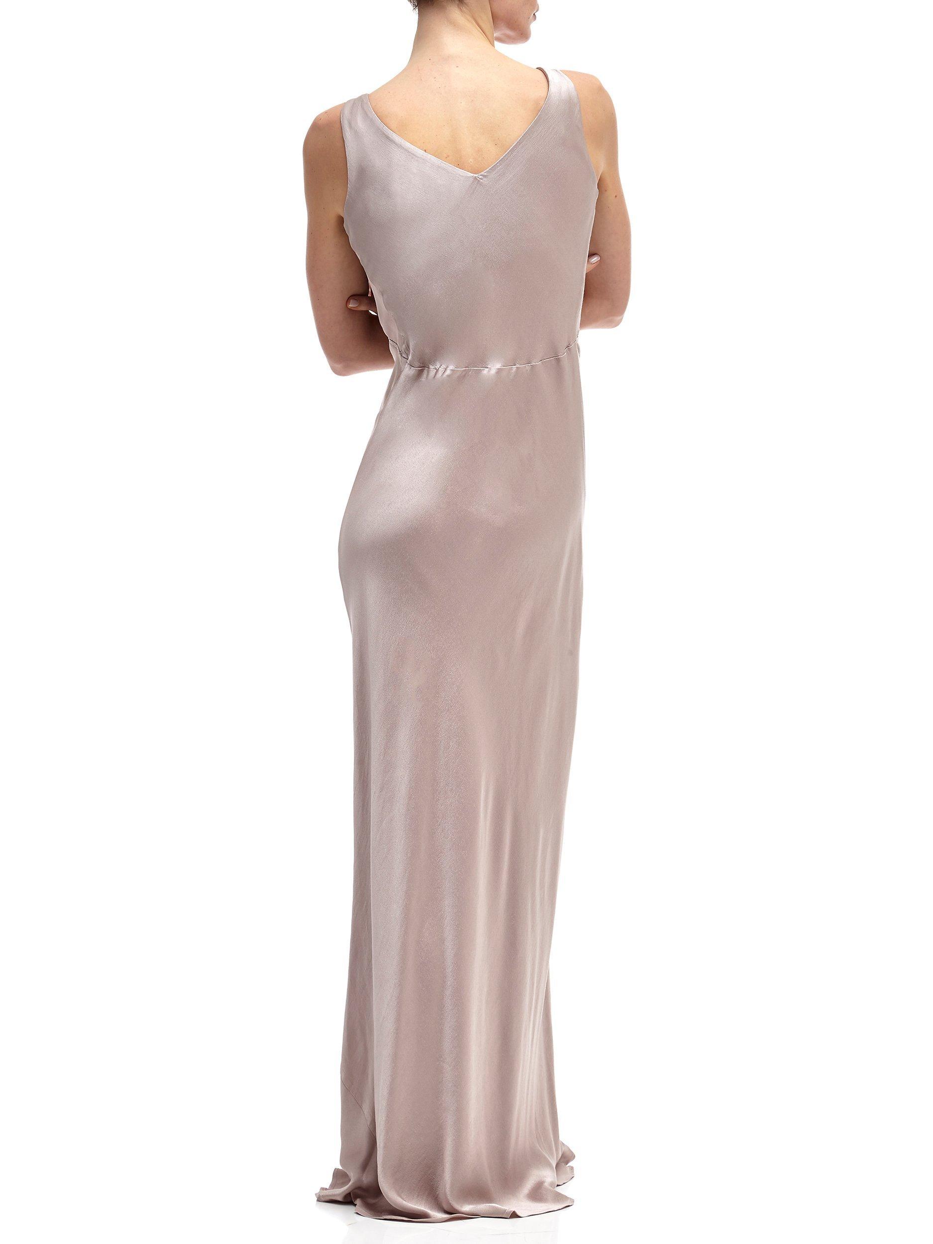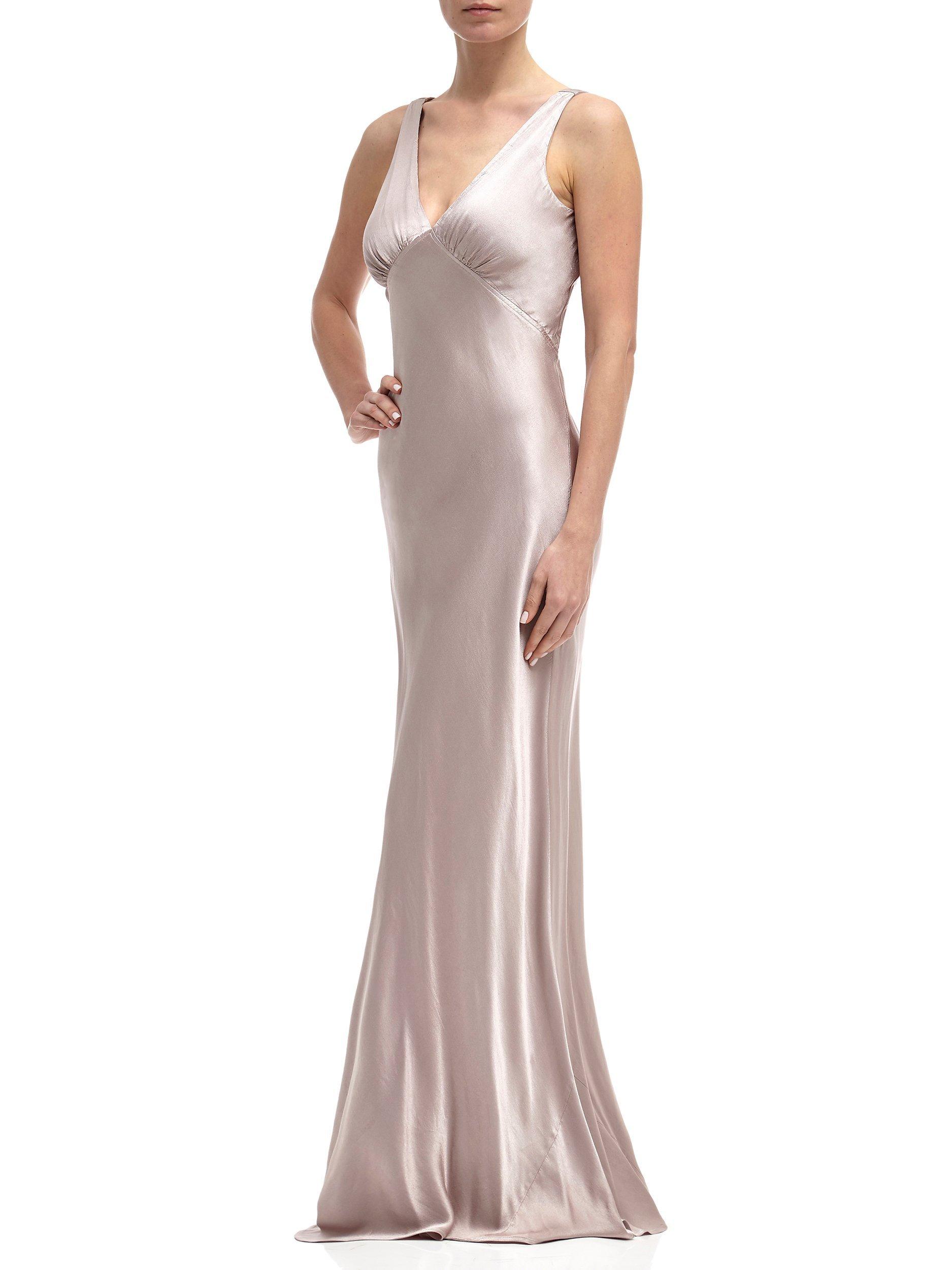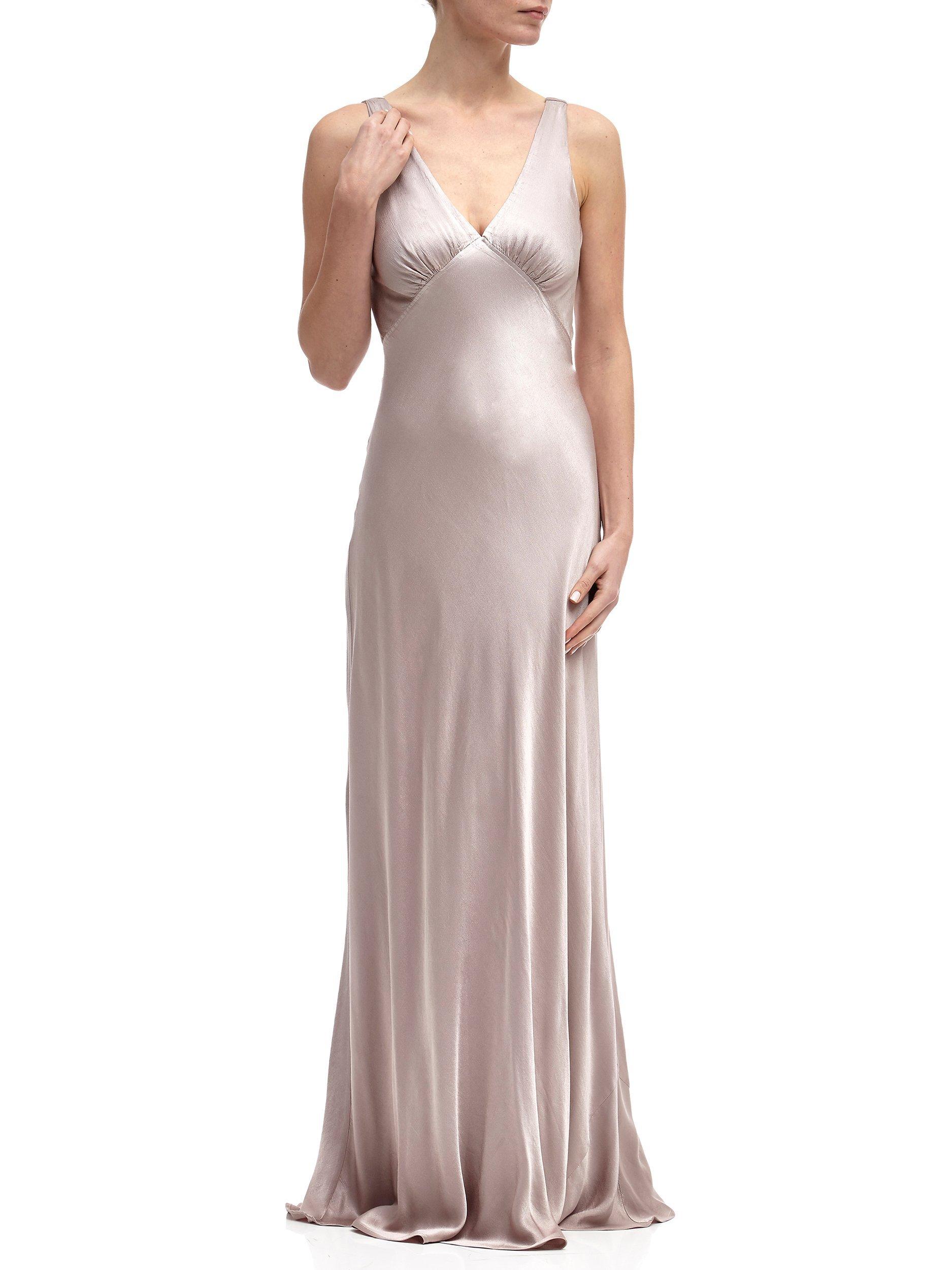 With vintage inspired appeal, this piece features a gentle v neckline at the front and back and an empire line design with gathering at the bust. Simple yet beautiful, it falls to a floor sweeping length and is fully lined.