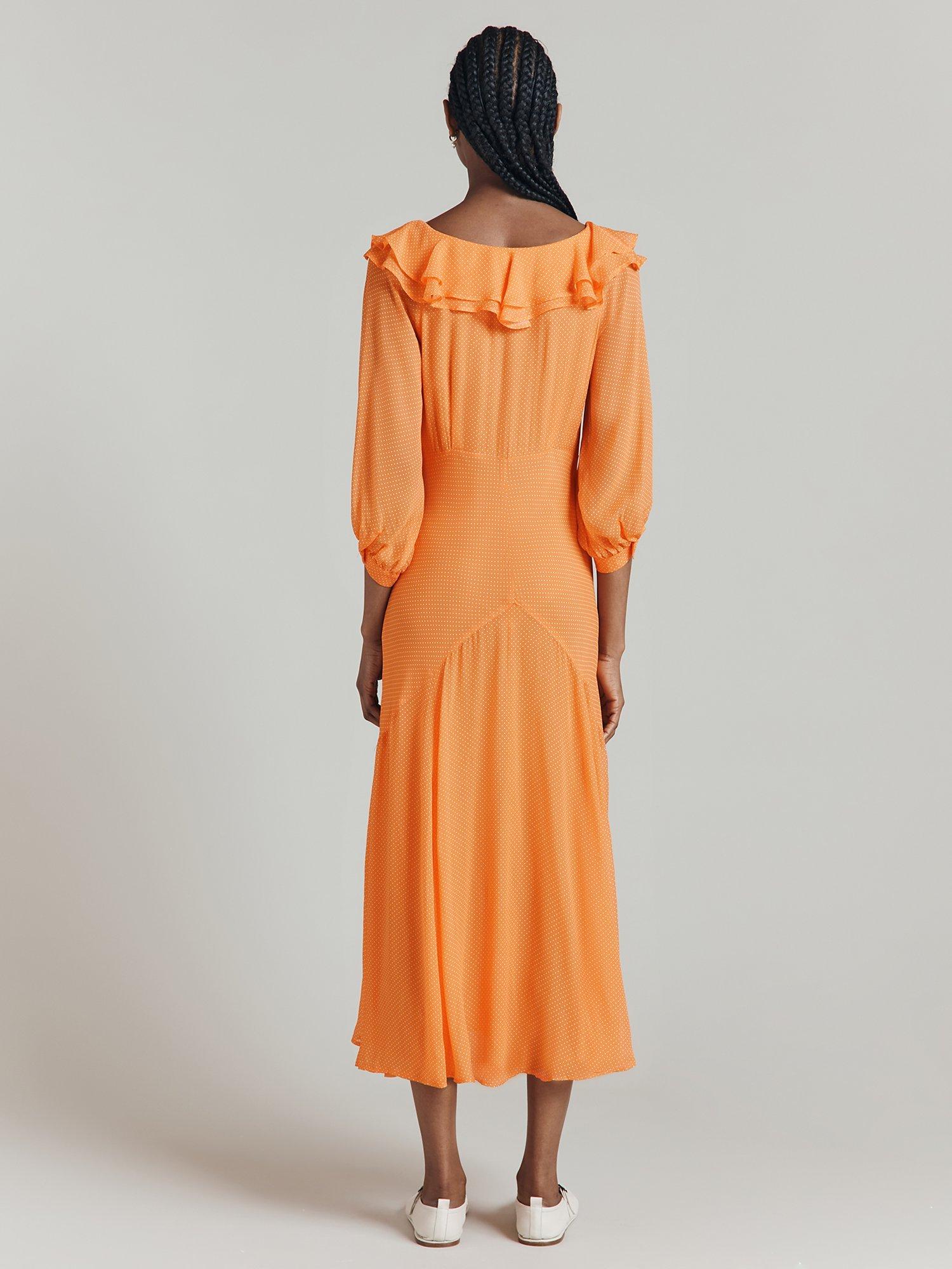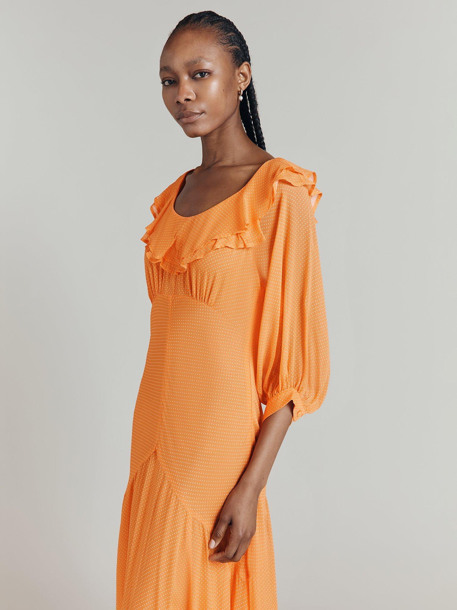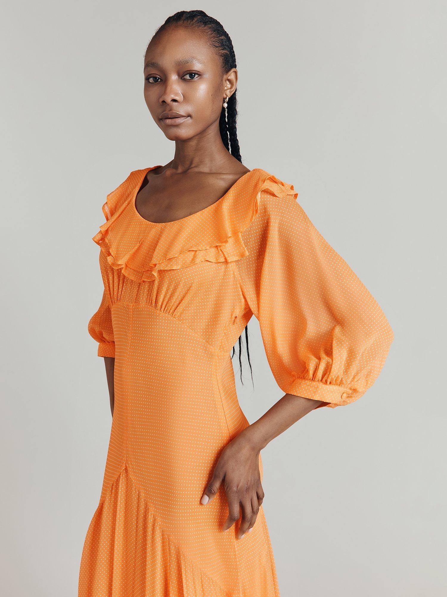 A true showstopper, Poppy is one of our favourite dresses of the season. From the flattering bias cut to the subtle spot print, there's a multitude of reasons to add her to your collection of wear-forever dresses. Featuring a scoop neckline edged with a wide double frill, a curved empire-line seam under the bust and three quarter blouson sleeves. Made from and lined with garment-washed viscose for a soft handle, it's finished with a concealed side-zip fastening.