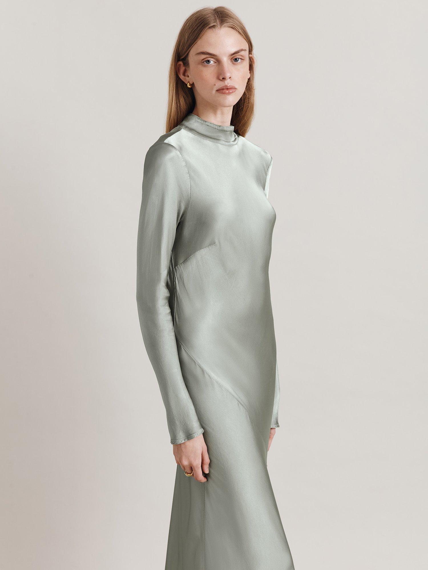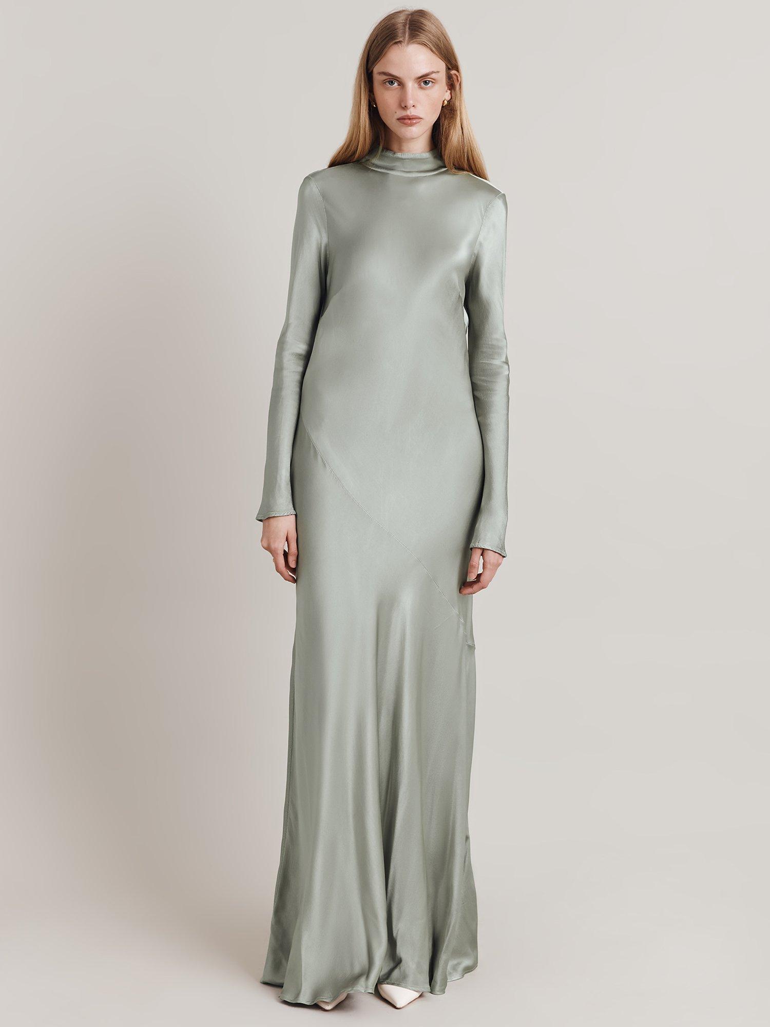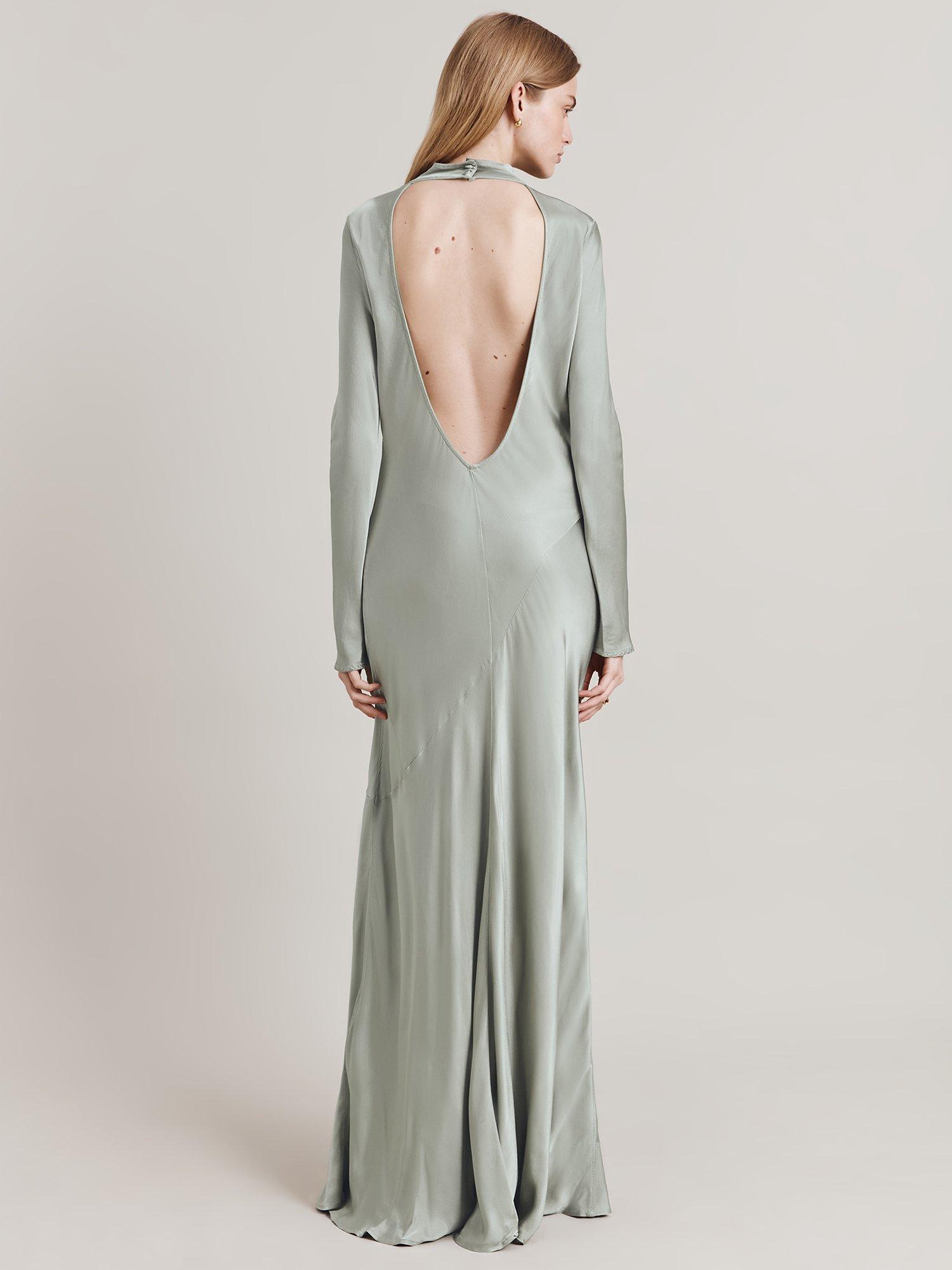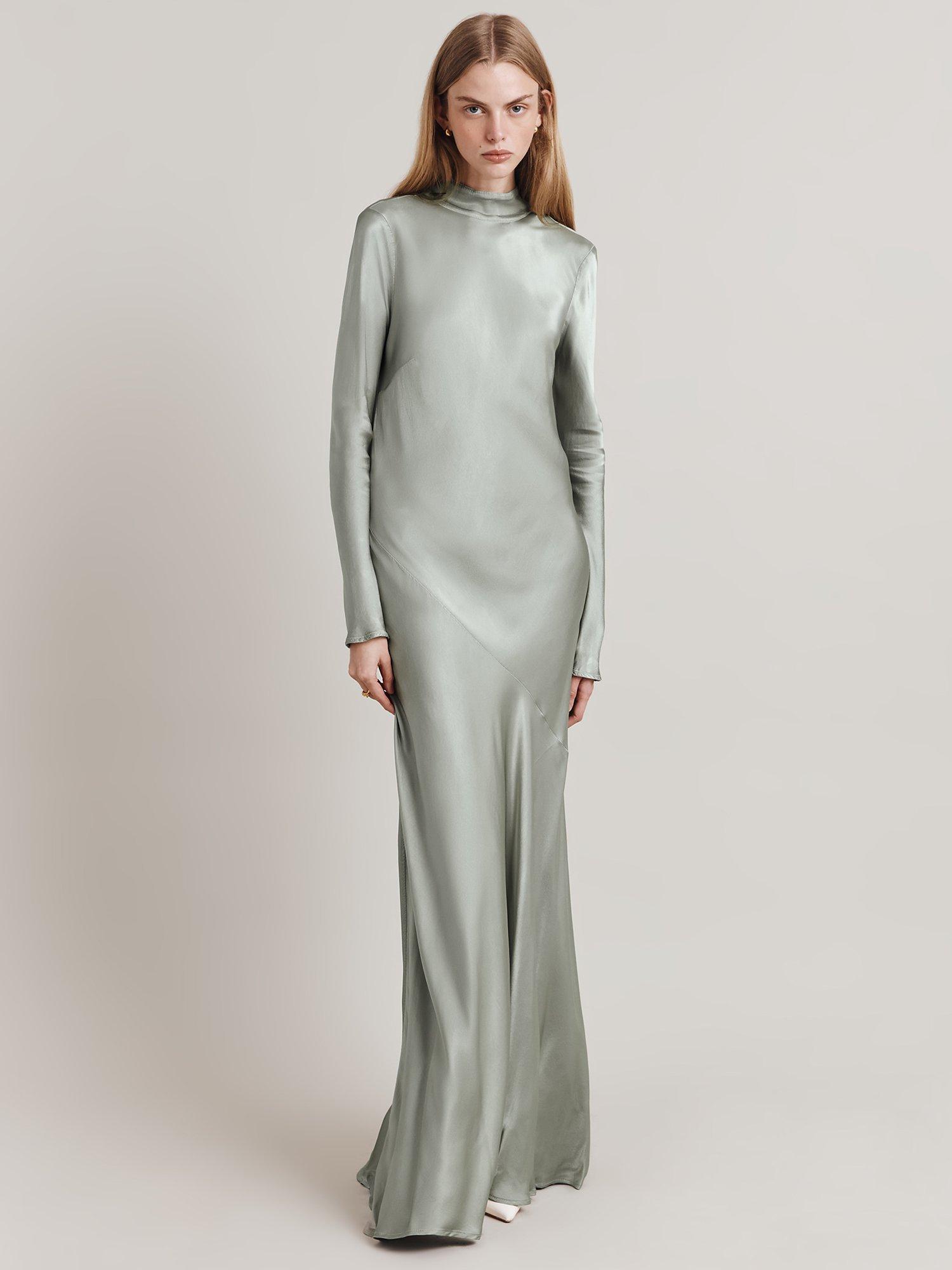 For high-octane glamour, look no further than Rayna. This beautifully dramatic floor-sweeping dress features long slim sleeves, a high-neck collar that secures at the back of the neck with two covered buttons and a sweeping low cut-out back. Bias cut with diagonal seams at the front and back of the skirt for elegant movement. A showstopper piece you ll treasure forever.