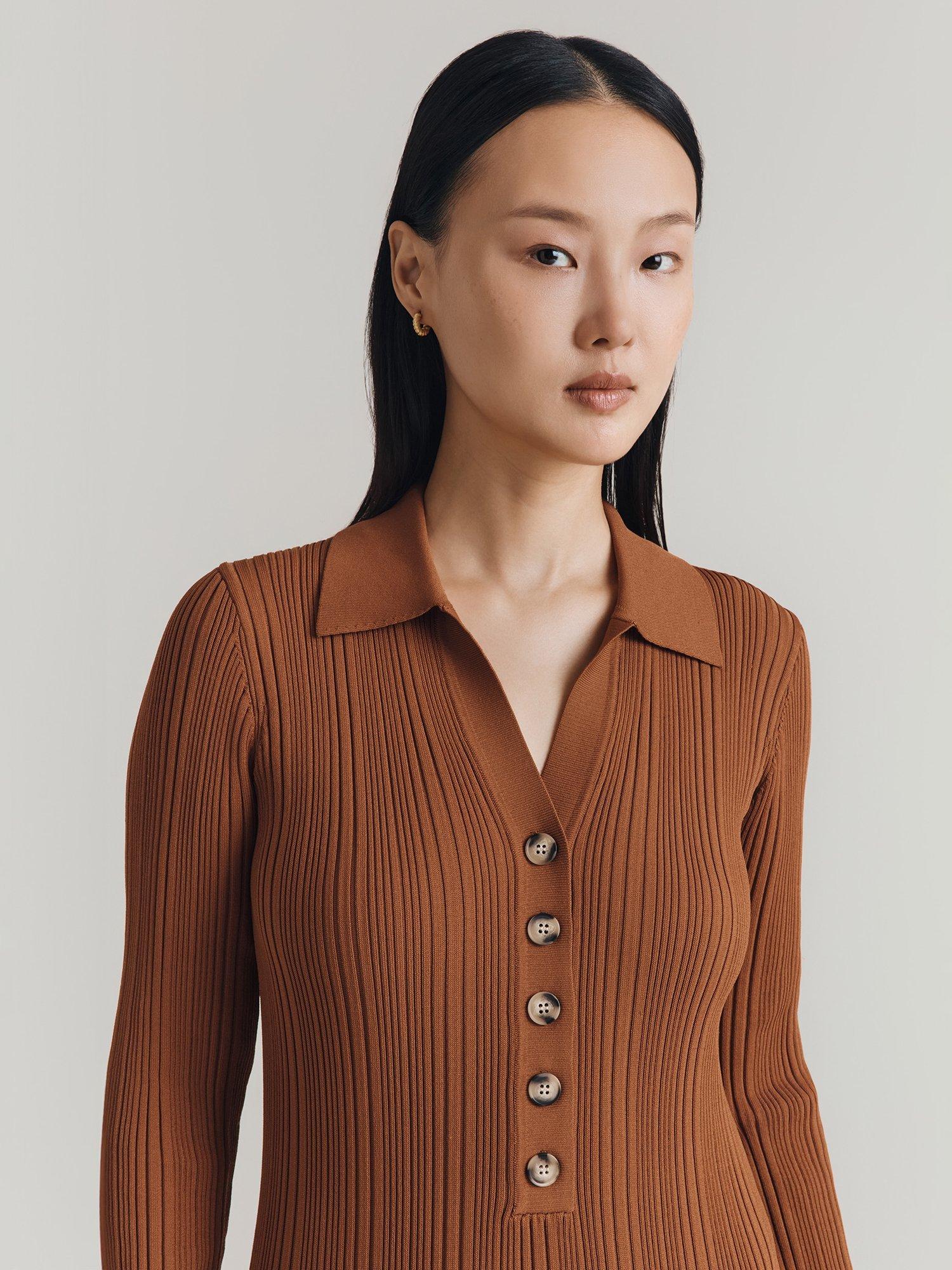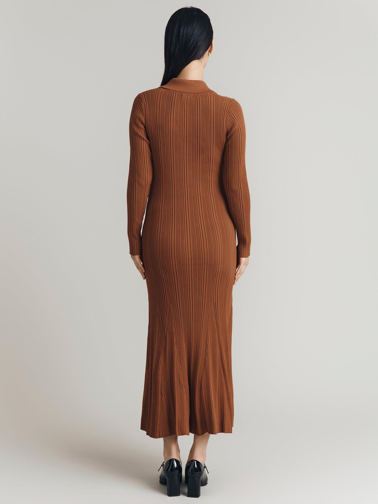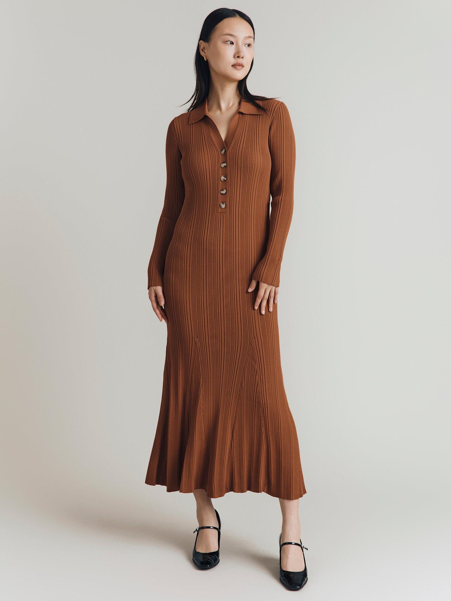 Flattering in all the right places, this ribbed midi dress from Ghost features a collar neckline with a button placket and long sleeves. Pair with boots.