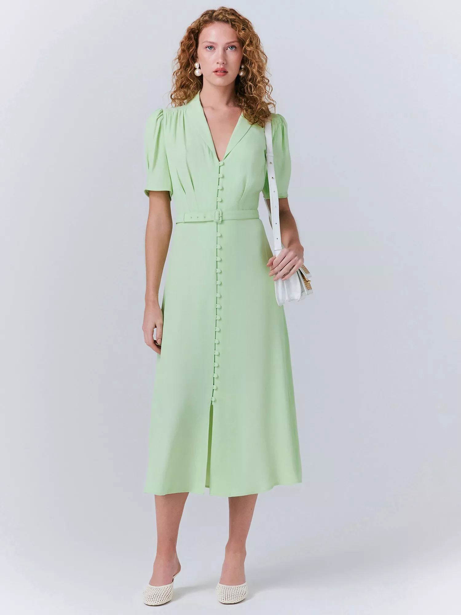With all the classic style signatures combined with Ghost's expertise in crafting timeless silhouettes, the Rowan tea dress boasts a universally flattering appeal. Featuring a button-through front, shawl collar and delicate gathering at the shoulders and bust for subtle shape, it's finished with a waist-cinching self-covered buckle belt.