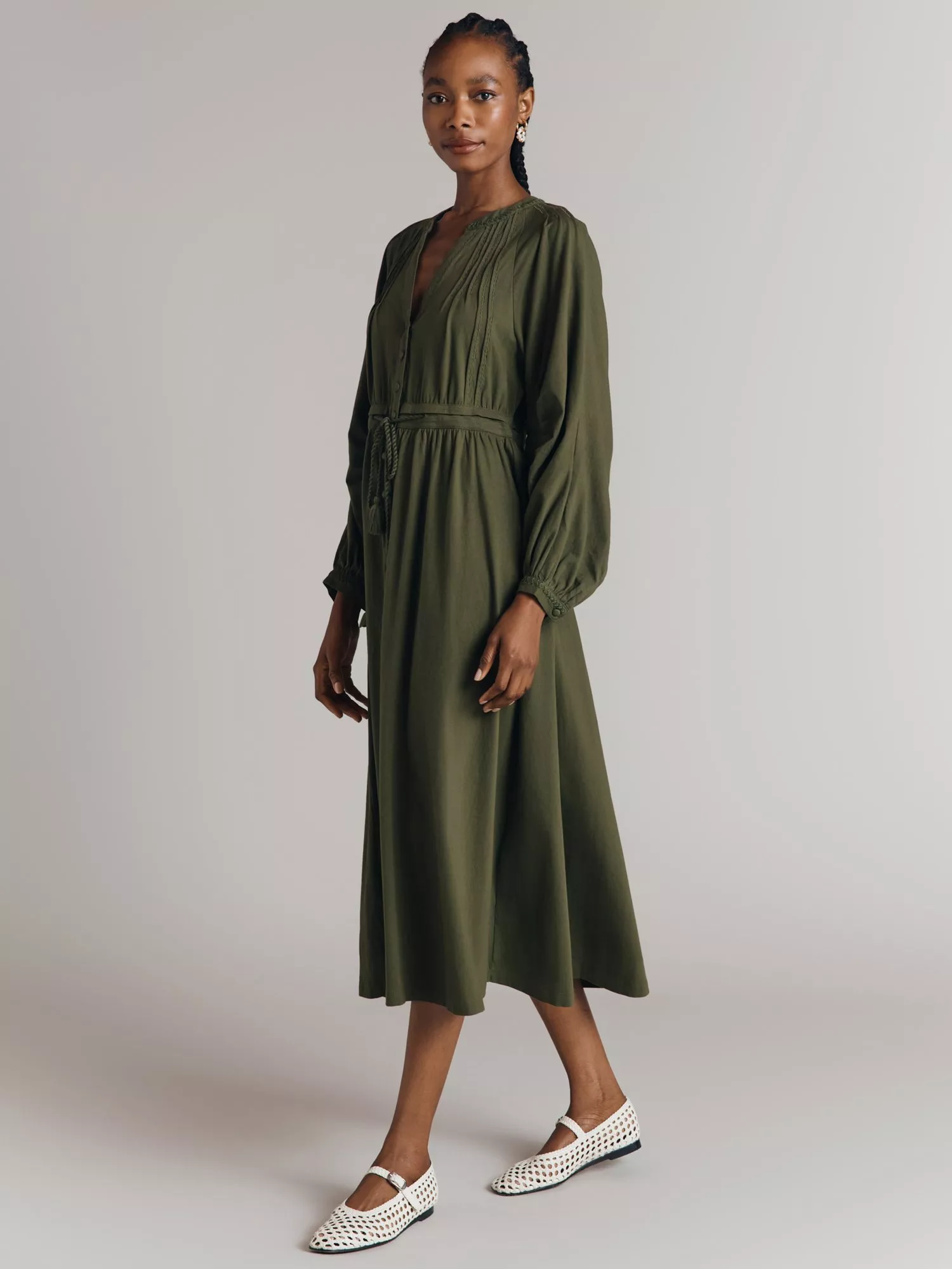 Set in a simple, A-line shape, this button detail mid-length dress from Ghost is crafted in lightweight, breathable cotton. With a universally flattering v-neckline and long balloon sleeves, it allows you to showcase its versatility.