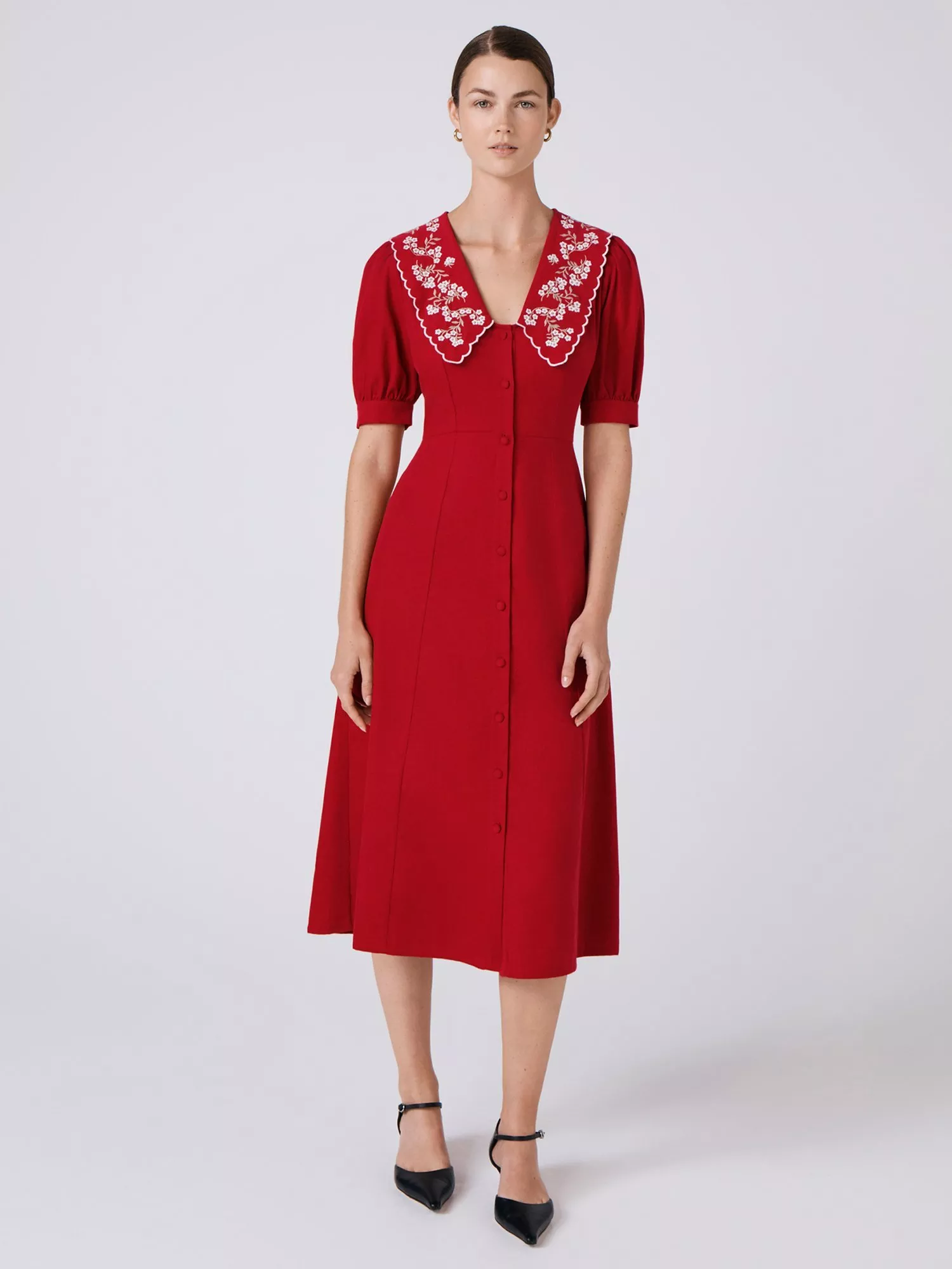 A statement collar is one of the simplest ways to turn a great dress into a really great dress. Case in point: Sloane. Ghost have used corduroy for comfort, warmth and structure, creating an A-line dress with covered buttons at the front and sweet puffed sleeves. The scalloped collar is beautifully embroidered with floral sprigs to bring a touch of spring into your autumn/winter wardrobe.