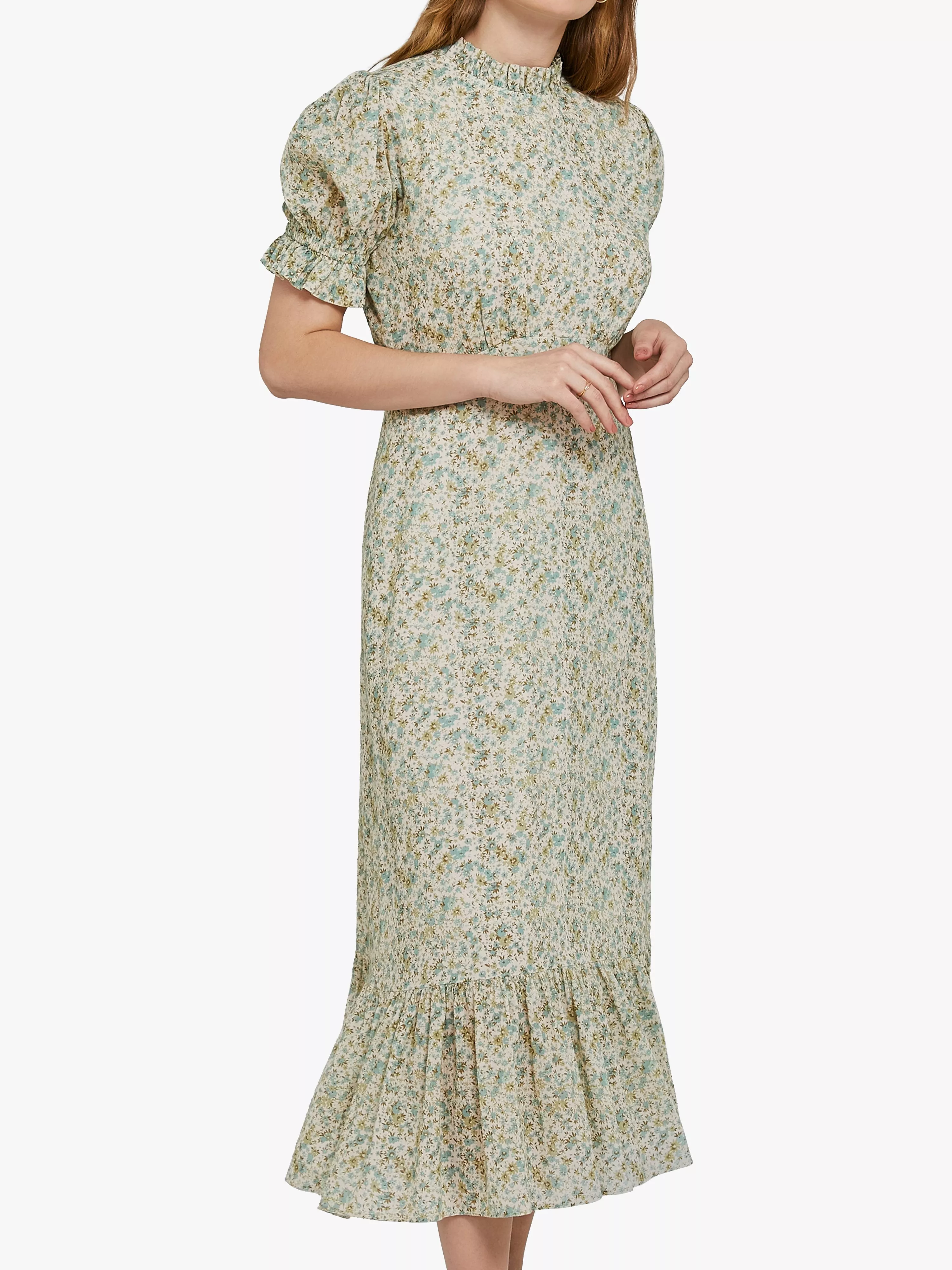 With a soft frill detail and a delicate floral pattern, the dress will make a lovely addition to your weekend and holiday outfits. Its subtle floral pattern is feminine and has a subdued grown-up feel.