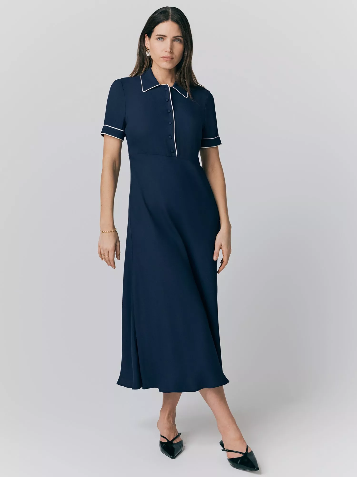 Sophia is a minimalist's dream with a preppy edge. With a beautiful bias cut midi skirt for a flattering silhouette, this adaptable style boasts subtle contrast piping along the collar, cuffs and button down placket. A demure and sophisticated option for a multitude of occasions this season and more.