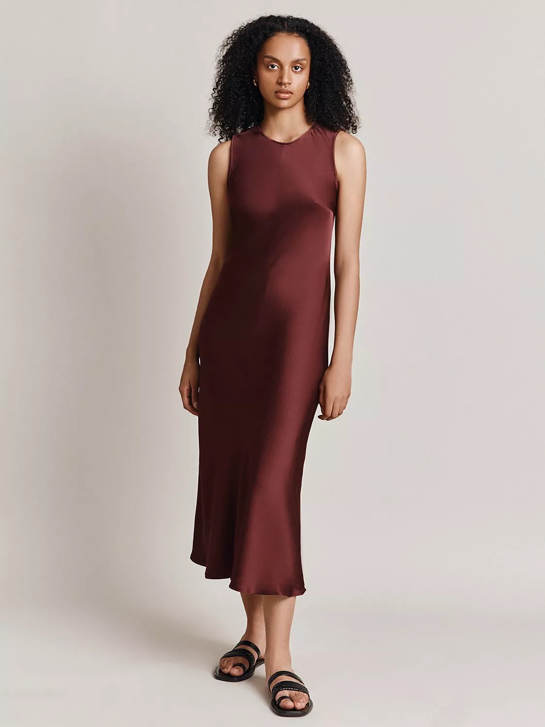 Cut on the bias and skimming the silhouette, this mid-length dress from Ghost is spun from soft luxury satin. Keeping things simple with a round neckline, this sleeveless style is kept trend-free so that it'll sit in your closet for years to come.