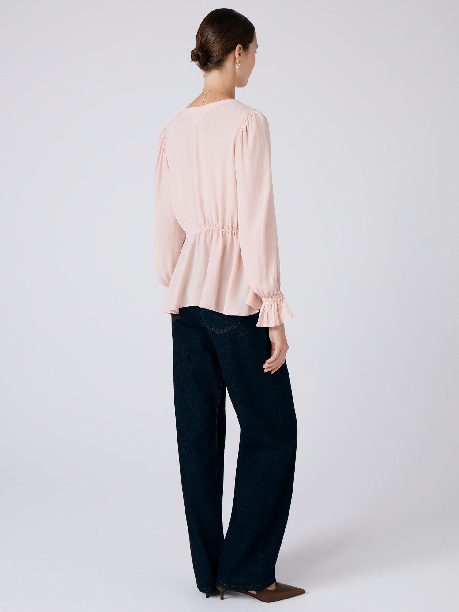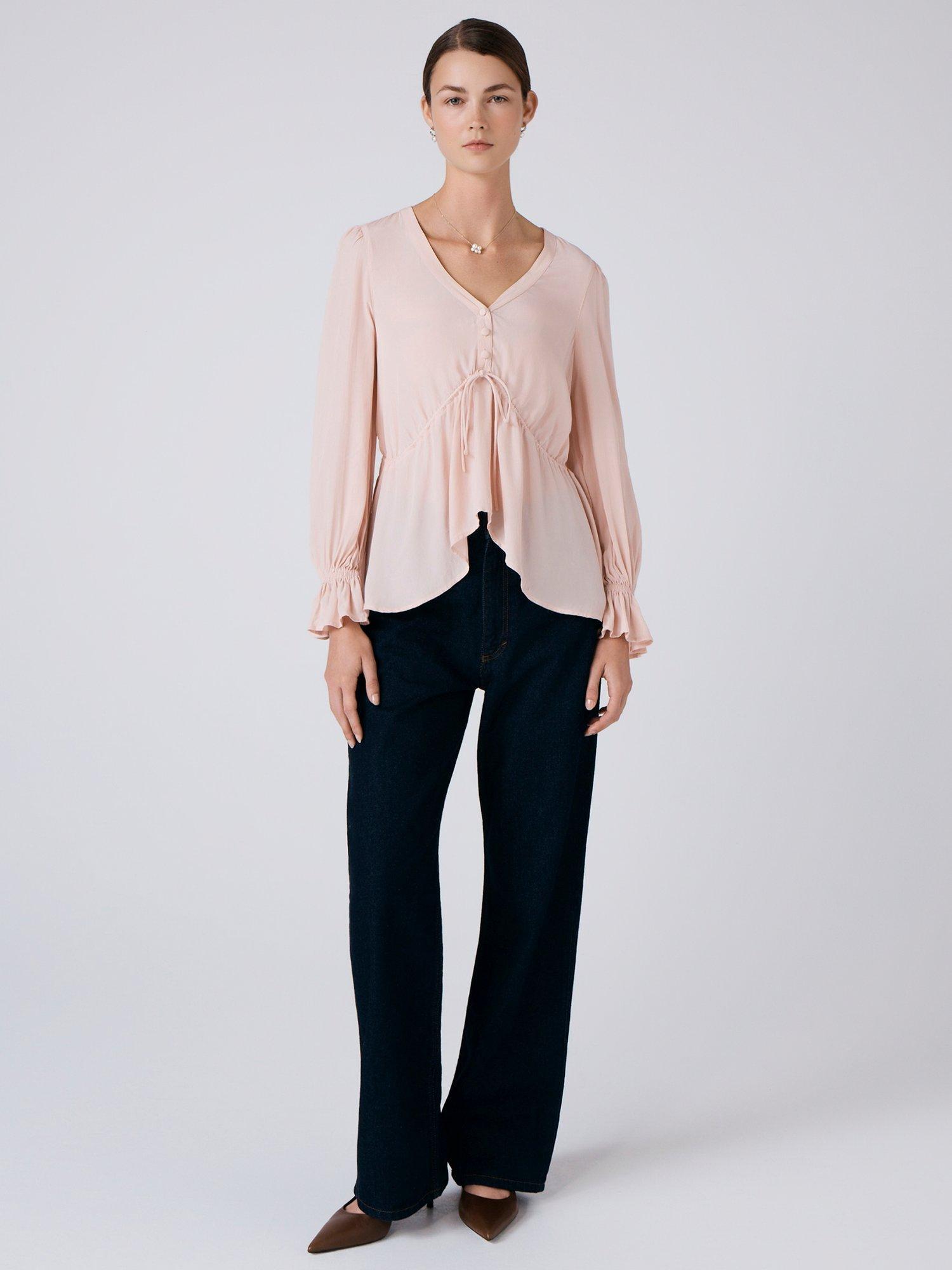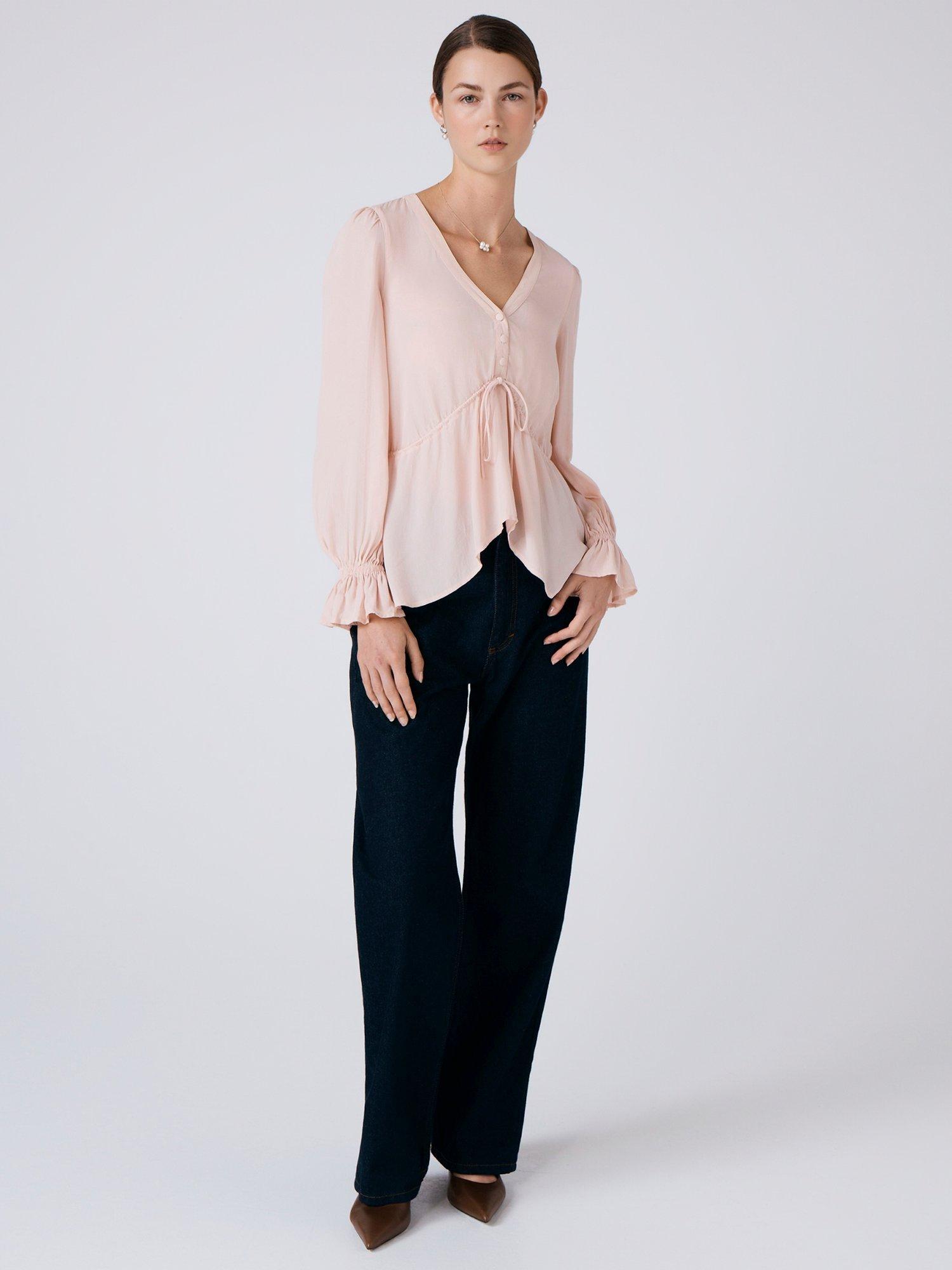 A ruffled blouse from Ghost, made from light viscose. With a V-neck and long puffy sleeves, its plain colour design goes with everything. Everyday ease with a stylish twist.