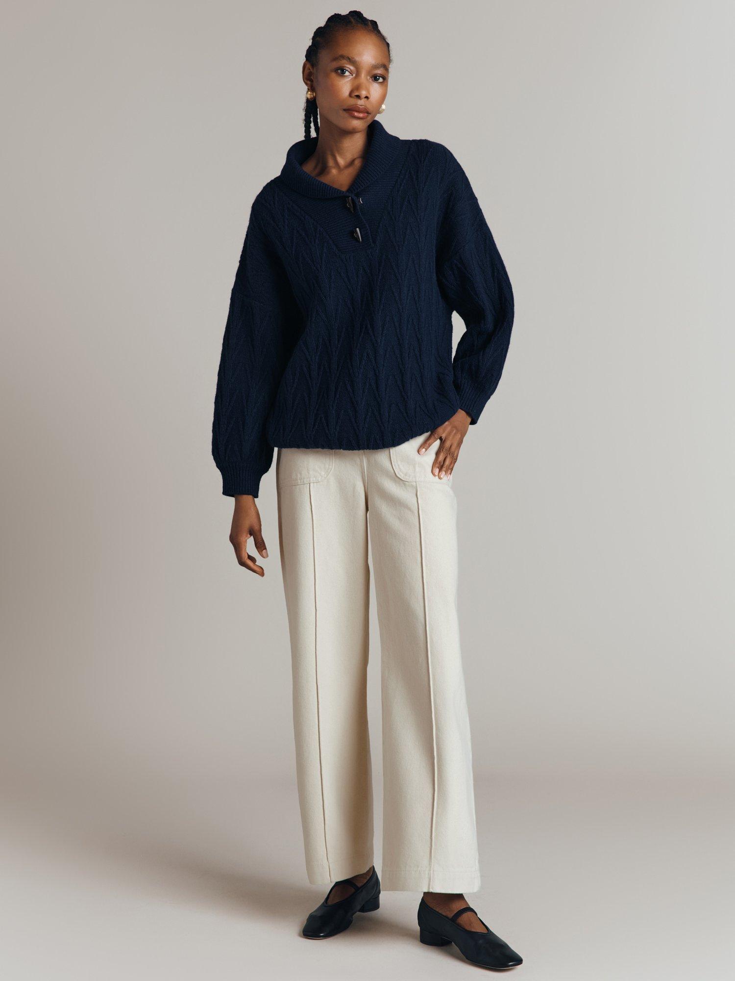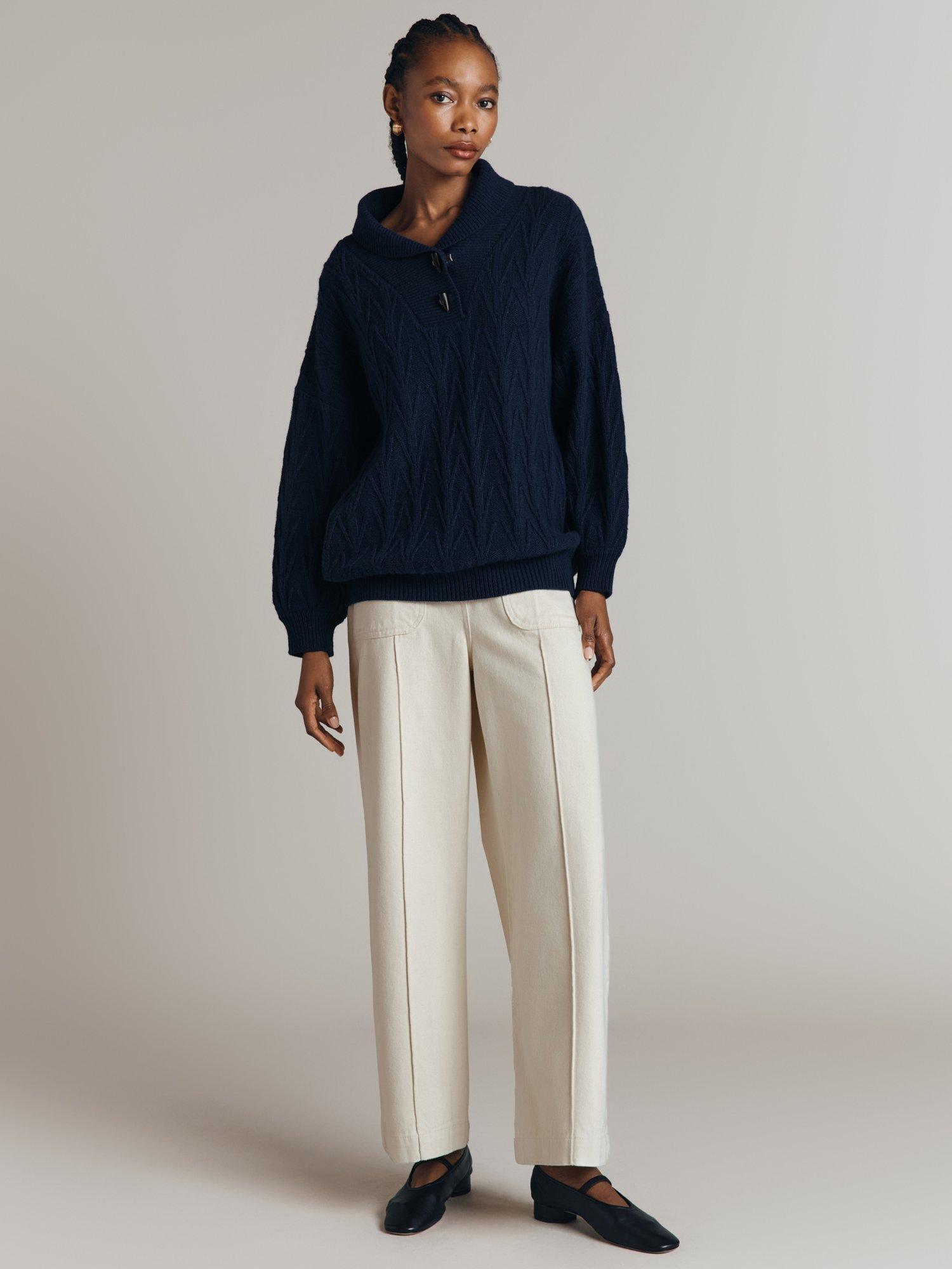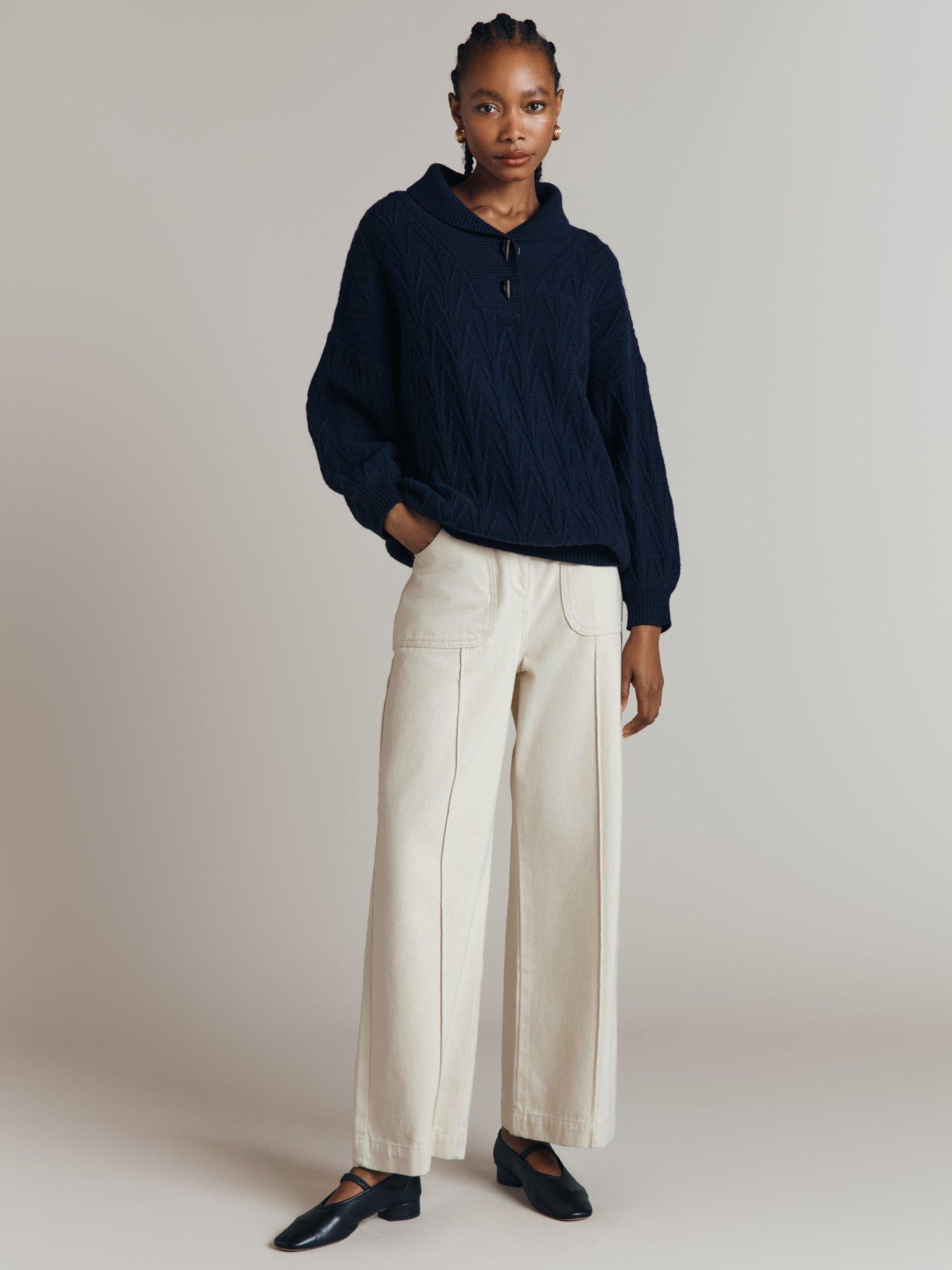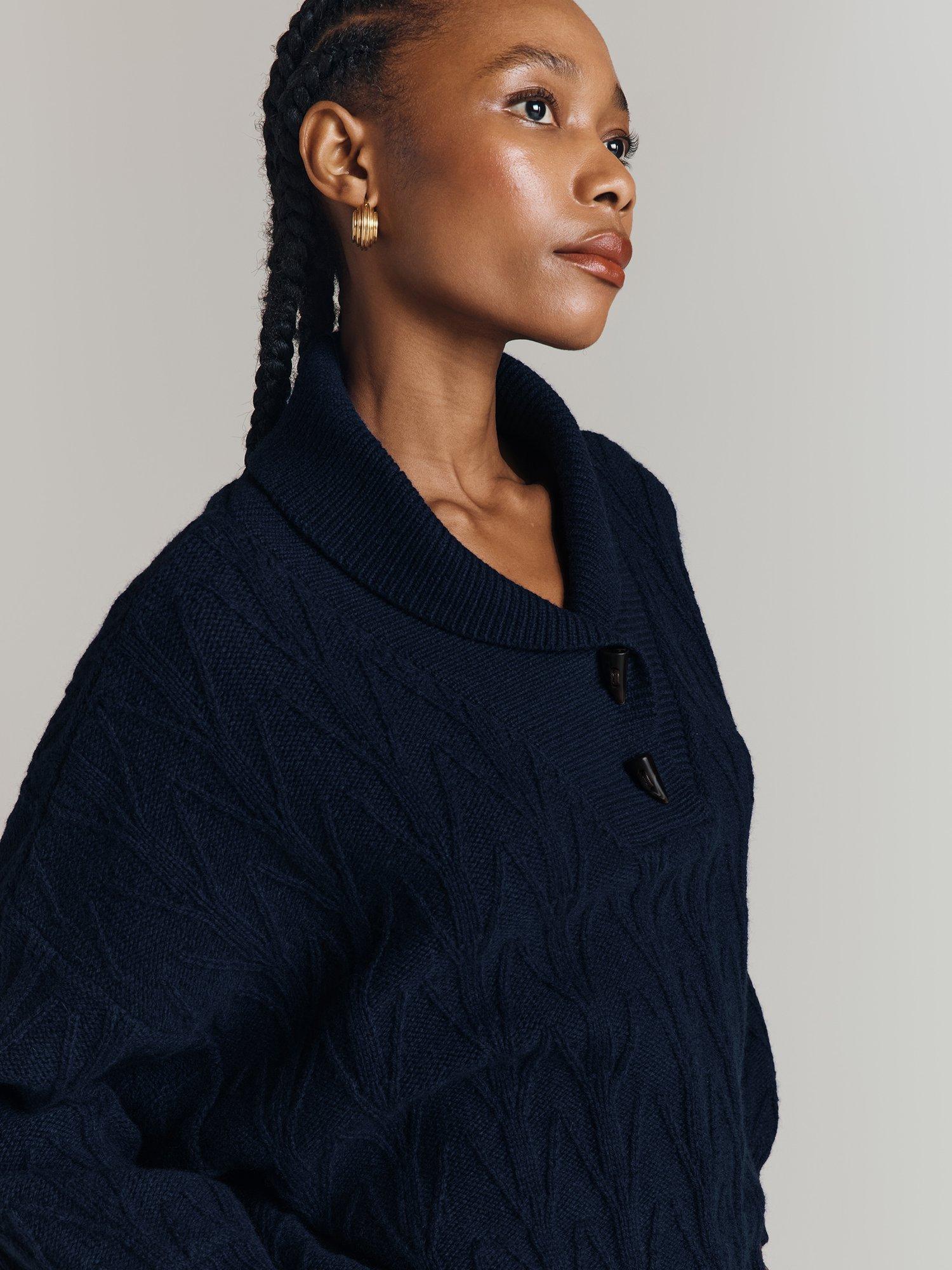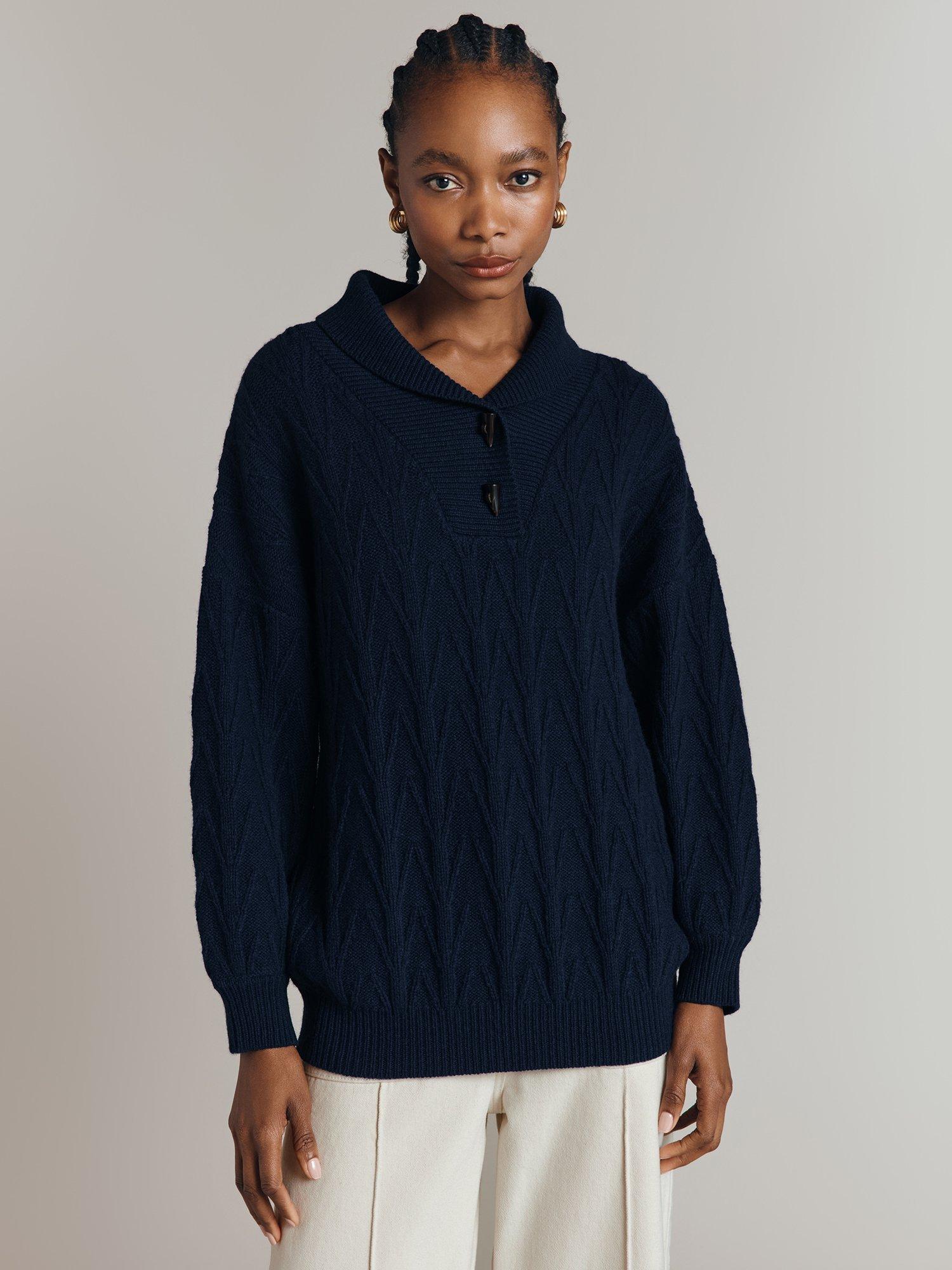 With a toggled neckline, this oversized textured jumper from Ghost is a fine match for grey skies in a warming woollen blend.