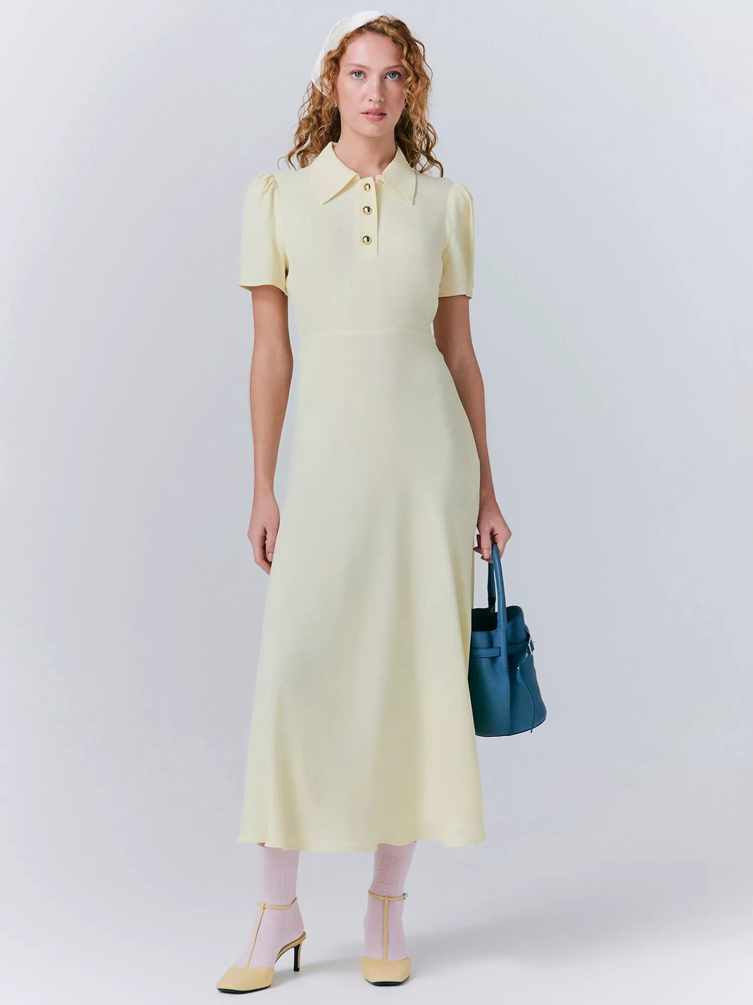 Elevate your look with this stylish dress. The short puffed sleeves and collared neck offer a classic touch, while the front button detailing adds interest. An under-bust seam ensures a beautifully defined and fitted silhouette.