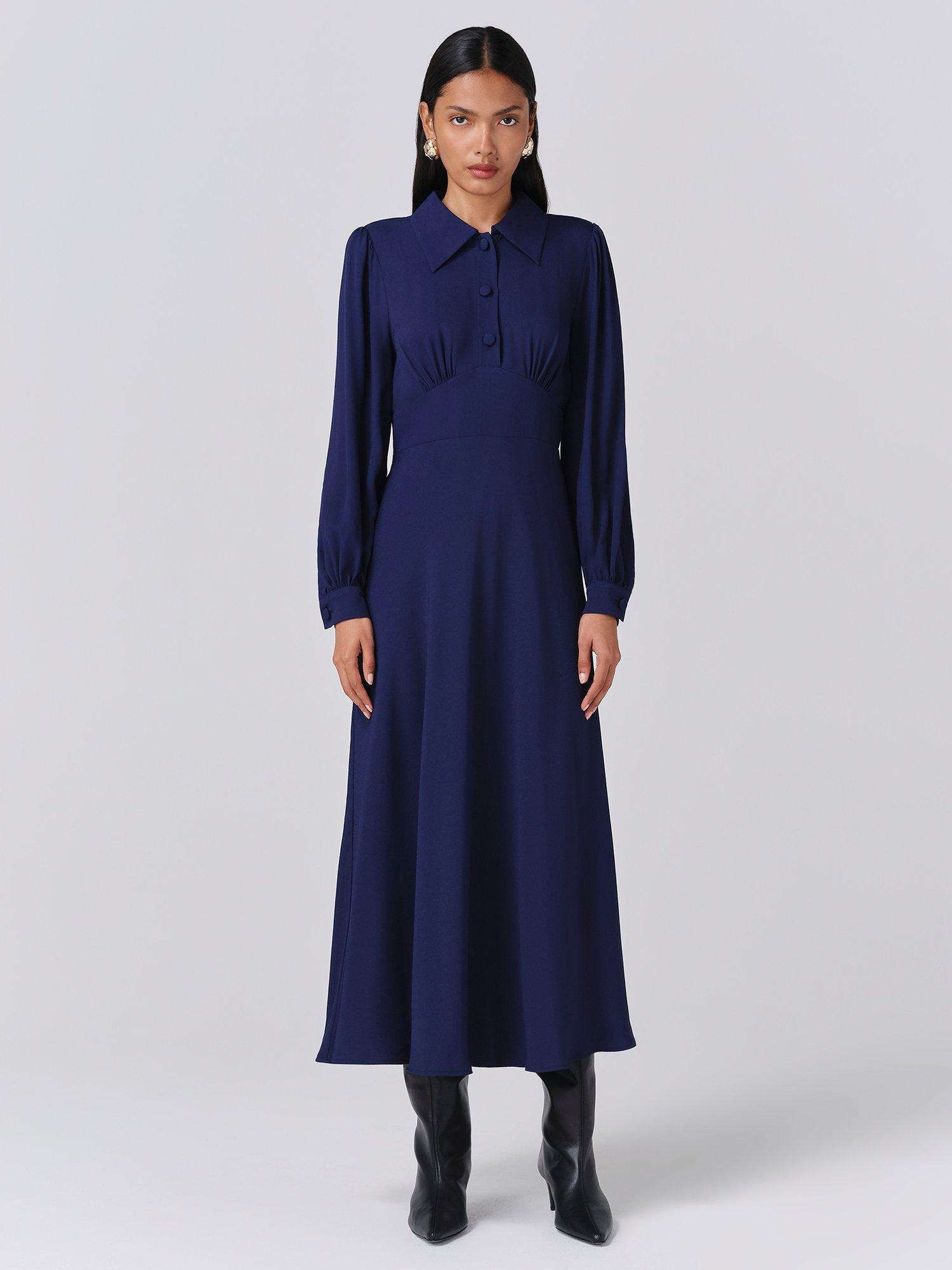 Rich in sophisticated details, this ladylike dress is a real showstopper. Cut from crepe for fluid movement, it features a collared neckline with covered buttons at the opening, full-length sleeves that gather at the cuff and flattering seaming at the waist for added definition and shape.
