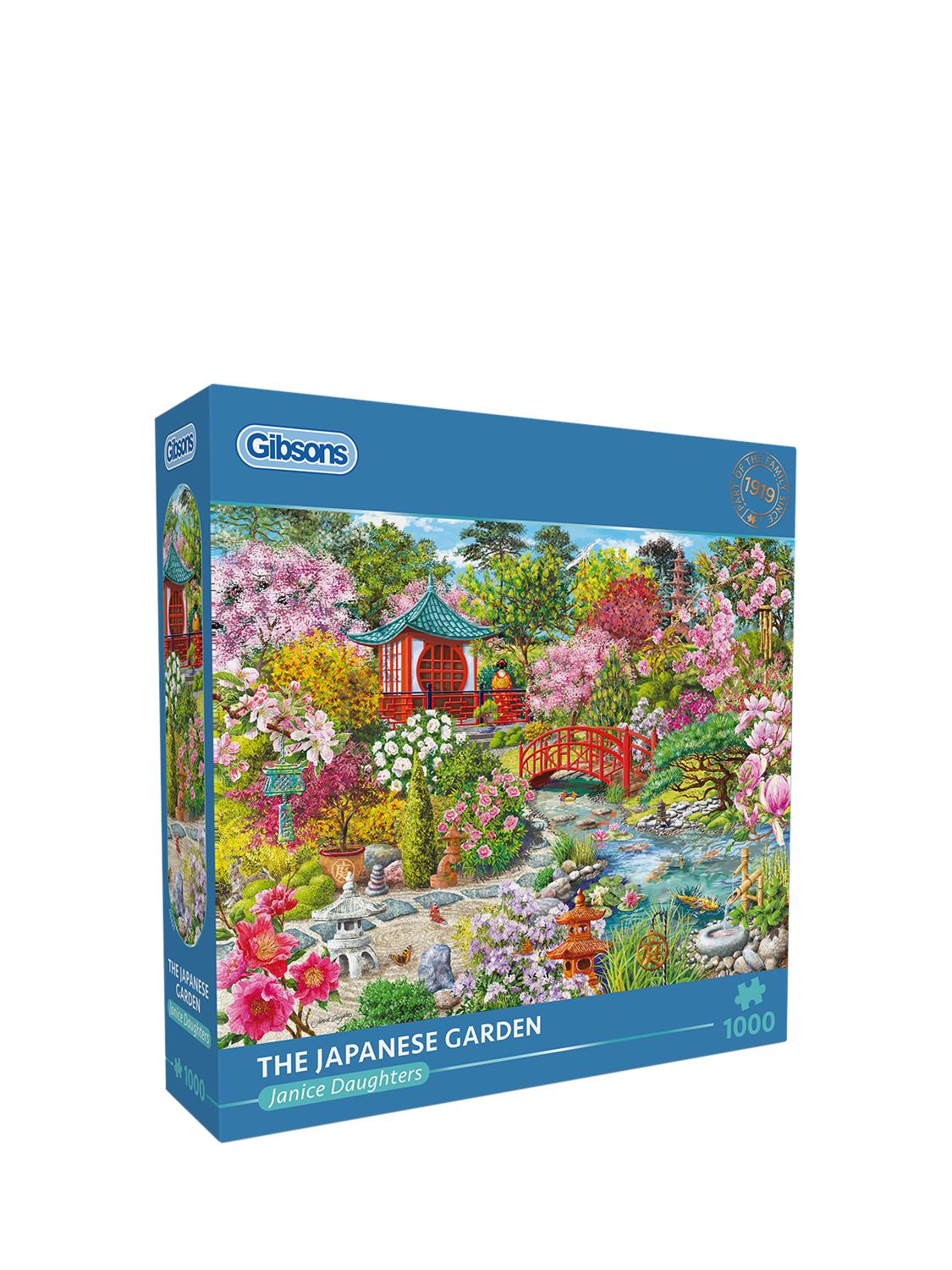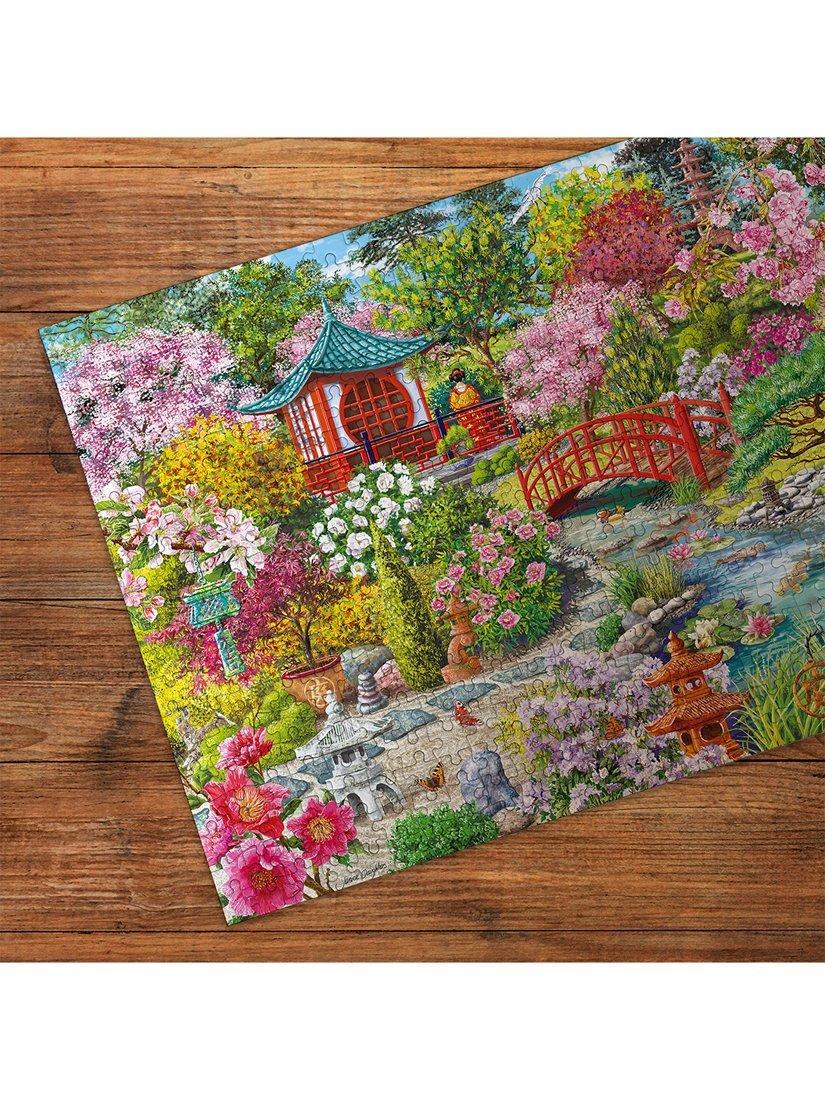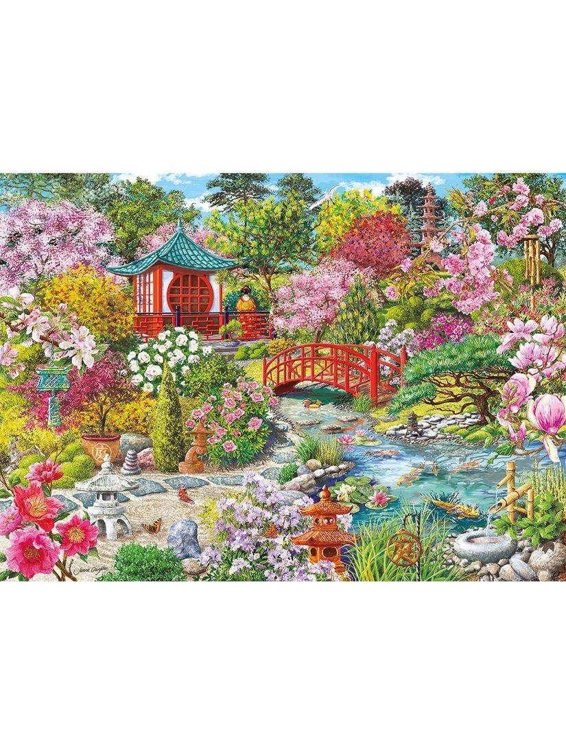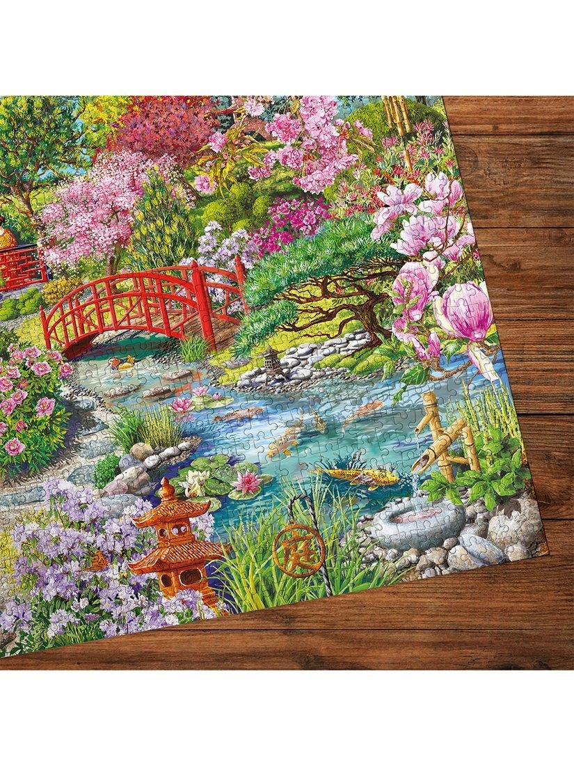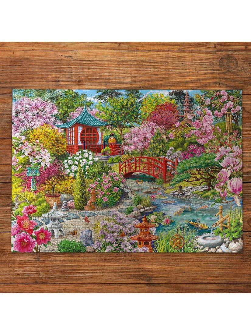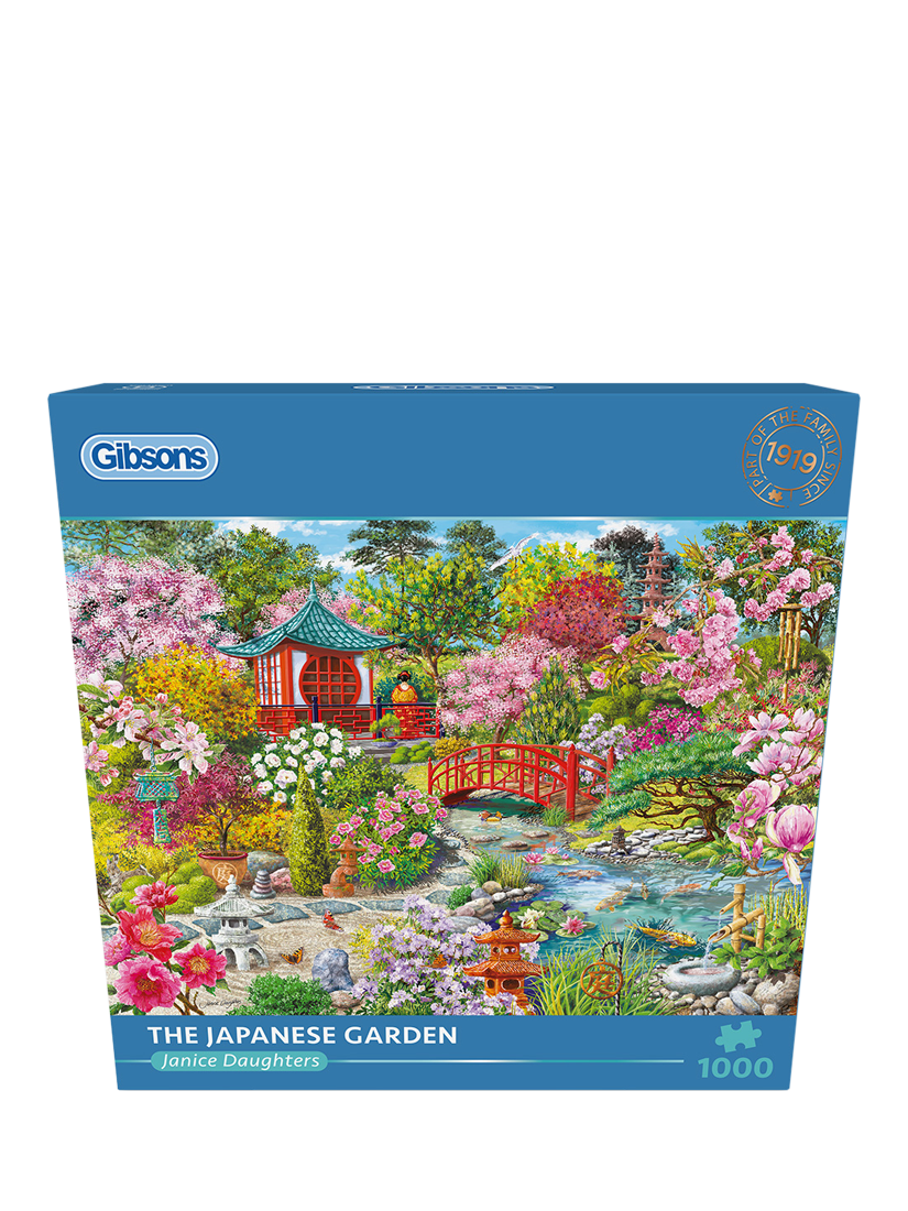 This beautifully painted 1000-piece puzzle by the talented artist Janice Daughters features a stunning Japanese Pagoda nestled within a lush Sakura garden. With flowers in full bloom, the delicate koi fish glide effortlessly through the water, as the charming stone lantern casts gentle shadows, and a quaint wooden bridge inviting you to explore further. What a perfect spot to relax in.