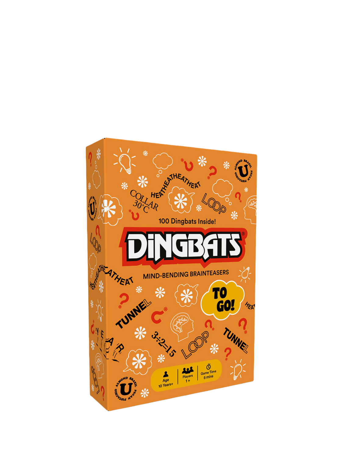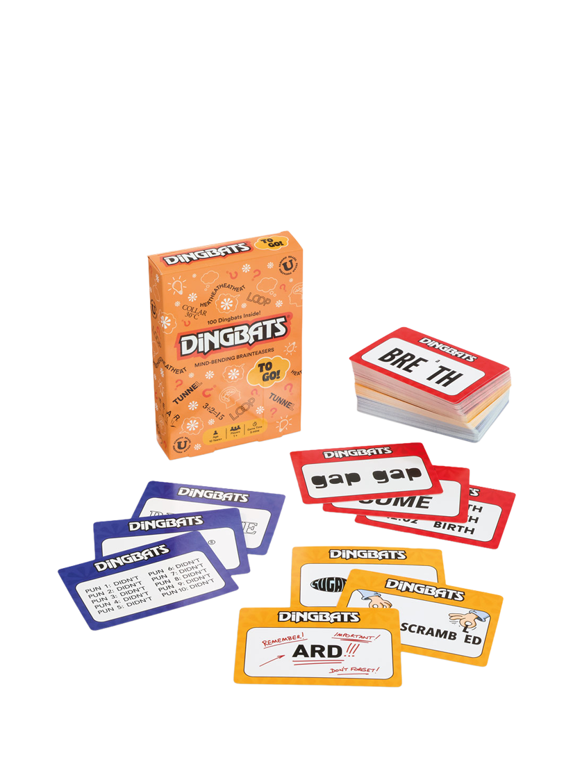 Solve Dingbats puzzles by finding a familiar phrase, name, or saying on the card. Think outside the box and test your ability to see beyond the obvious. Perfect for road trips, holidays, or your daily commute, this compact version brings all the Dingbats fun wherever you are. Challenge your mind, pass the time and keep everyone guessing! This orange box unlocks 100 brand-new Dingbats puzzles, not seen before in any other pack of Dingbats To Go. Take them on-the-go or expand your collection at home.