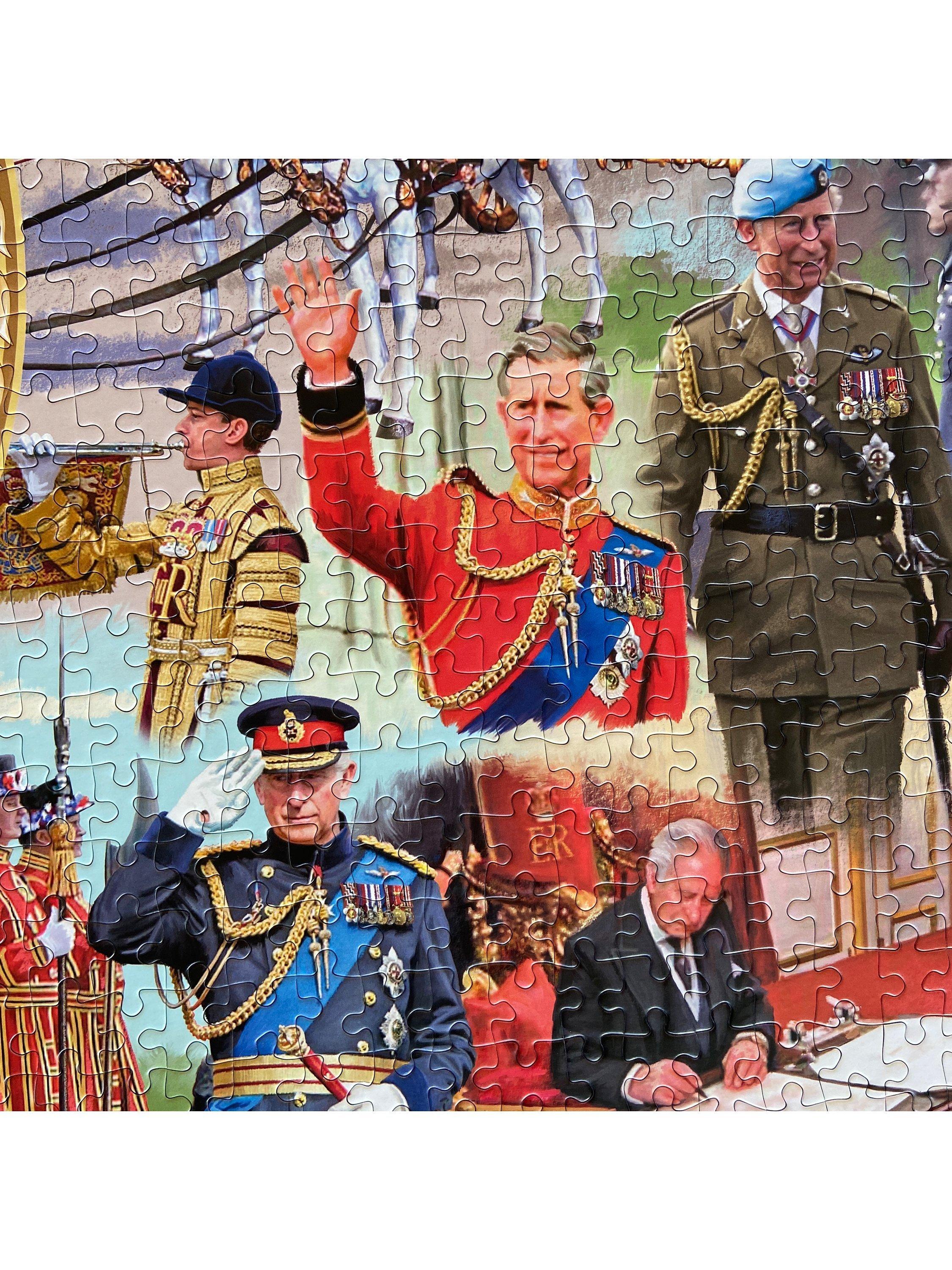 The coronation of King Charles III, on Saturday 6th May 2023, marks the start of a new era for the United Kingdom and the Commonwealth. During the ceremony, the King is anointed with holy oil, blessed and consecrated by the Archbishop of Canterbury, and receives the orb, coronation ring and sceptre. This special collector’s edition 1000 piece montage puzzle portrays the tradition and grandeur of the coronation ceremony, including the 14th-century King Edward’s Chair and King Edward’s Crown, and celebrates the beginning of His Majesty King Charles III’s reign. Made from100% recycled board.
