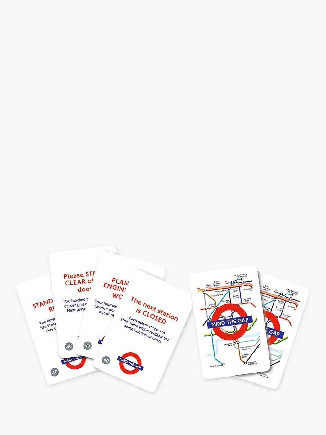 Mind the Gap is a fun card game for 2-8 players age 6+. Each player is dealt 8 cards and must match a coloured line from the previous card in order to play. However, players mustn't Bank on their opponents giving them an easy ride - as the aim is to slow rivals down with an Arsenal of special cards that can be Euston other passengers to trip them up. If a player cannot lay a card, they must pick up another and do their best to avoid falling victim to the special playing cards that demand players to 'miss a go' or 'change direction of play.
