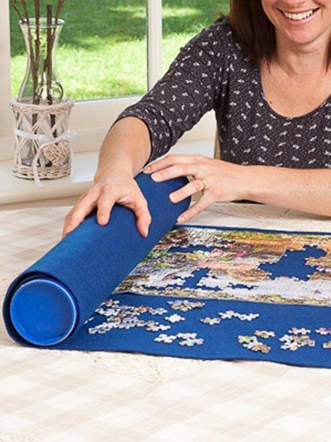The perfect puzzling mat to keep all your puzzles secure as you piece them together, suitable for all sizes up to 1000 pieces. Includes felt mat, one-piece drum with lid (for storing loose pieces) and two elastic straps with riptape to roll and secure the mat and part or fully completed puzzle around the drum. Ideal for storage and transportation.