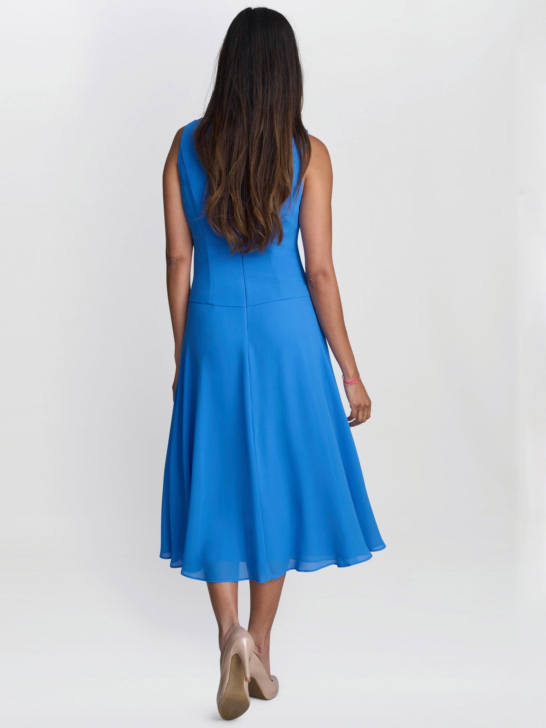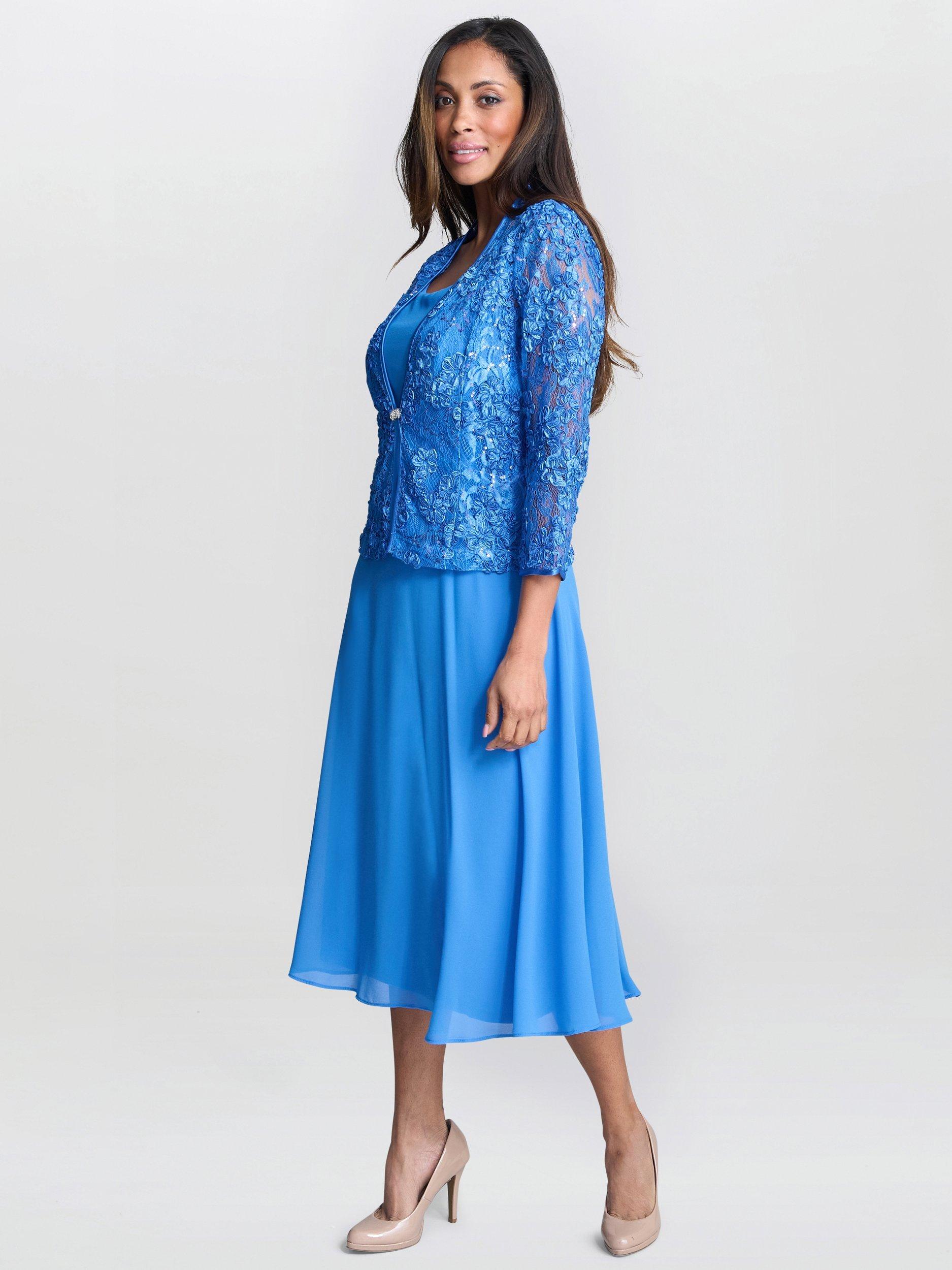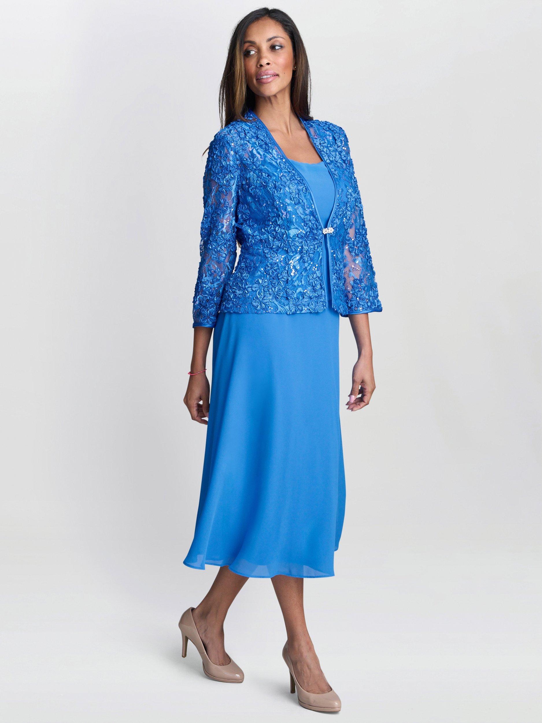This beautiful ensemble features a soft, flowing sleeveless chiffon dress in a sophisticated colour with a matching jacket. The jacket is crafted from intricate lace with delicate embroidery and subtle embellishments for some sparkle. This two-piece set is a harmonious blend of softness and sophistication. Ideal for the mother of the bride or groom, weddings, or any elegant occasion.