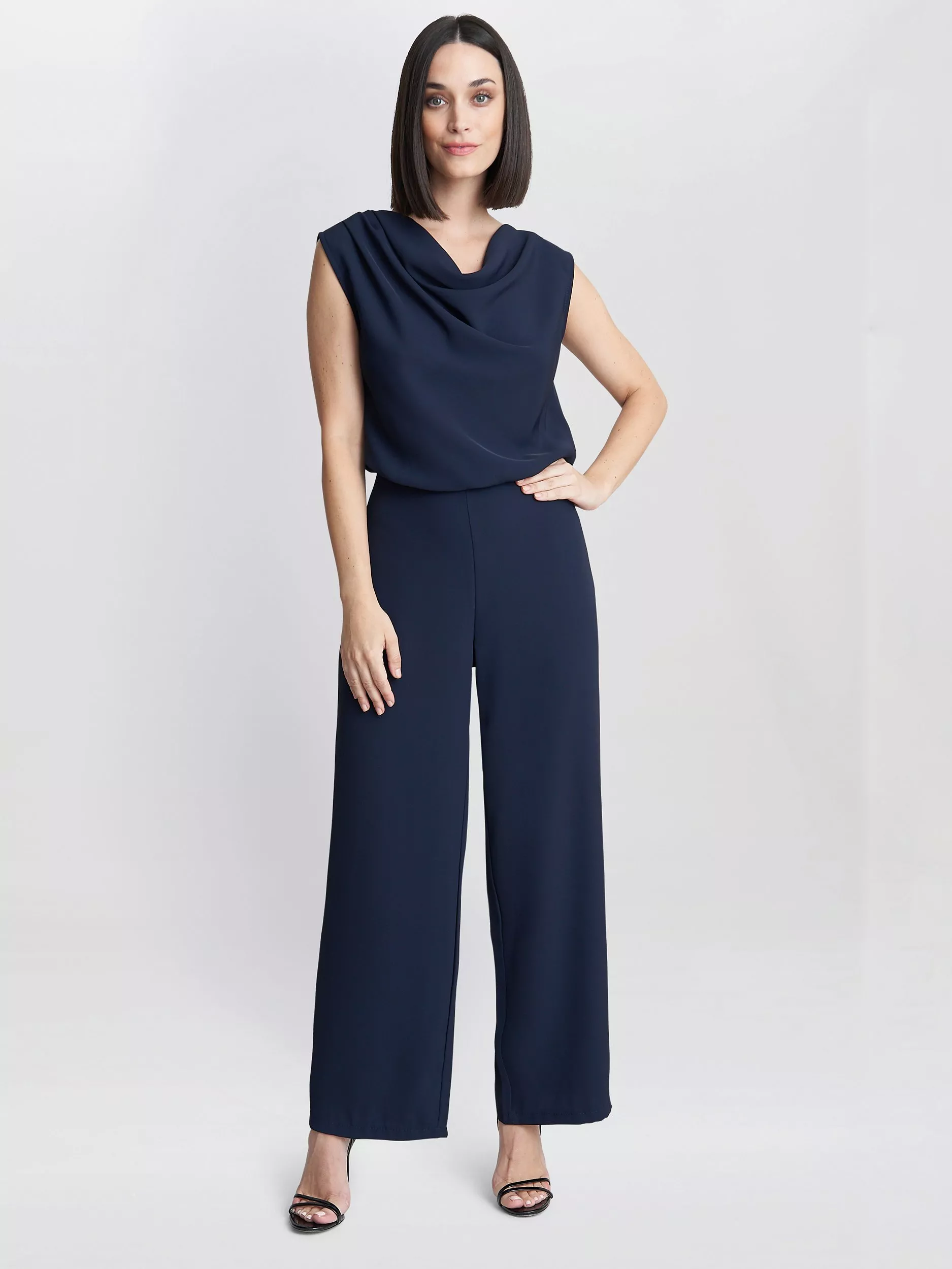 Modern and stylish this crepe unlined jumpsuit features a fitted waist and blouson top. It has a grown on shoulder with a delicate cowl neck. The back features a button closing and zip.