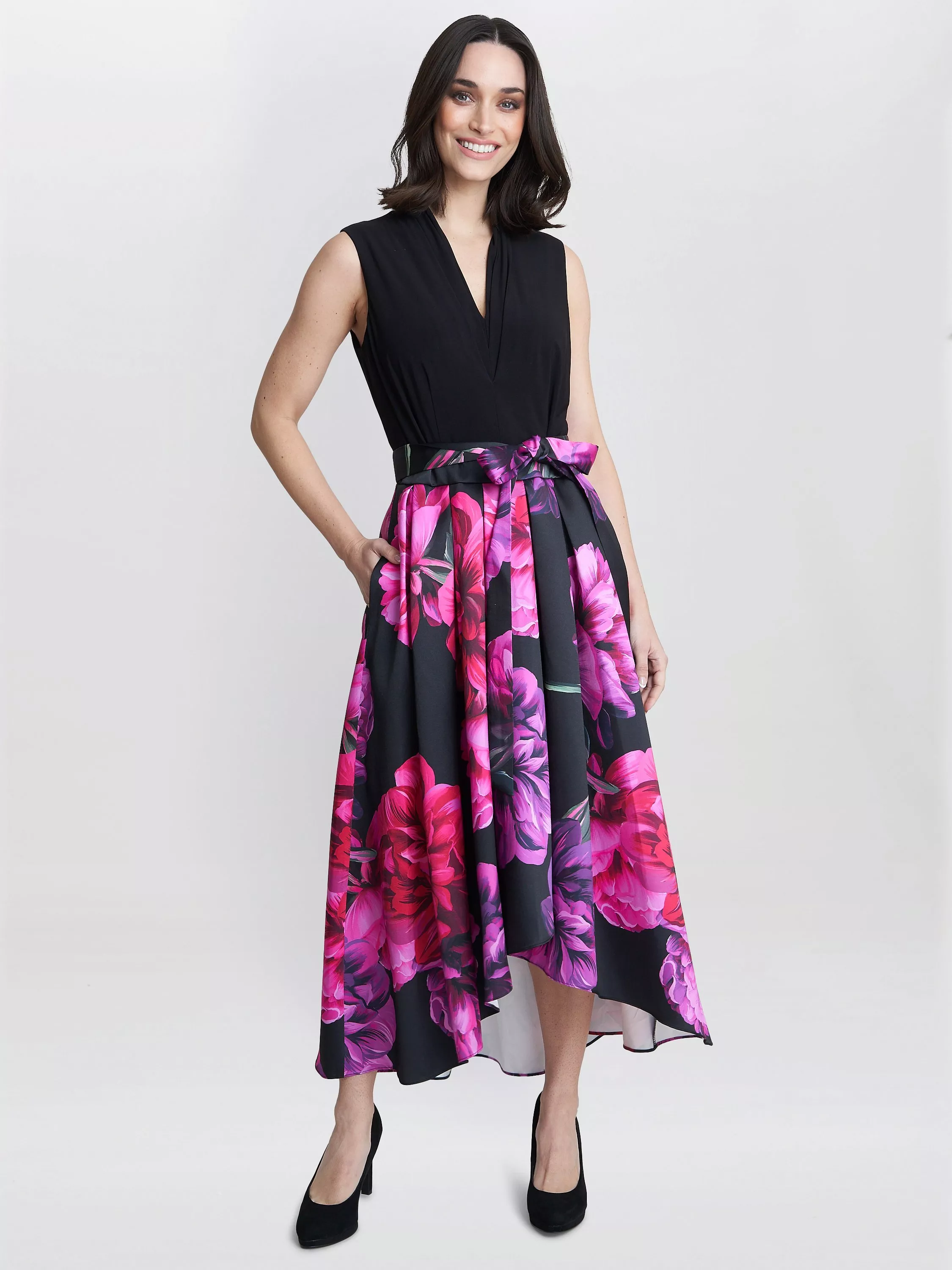 cut to a modern asymmetrical silhouette, this mid-length dress from Gina Bacconi is crafted from a blend of fabrics. With a universally flattering v-neckline, this sleeveless style charms with ease thanks to the floral print.
