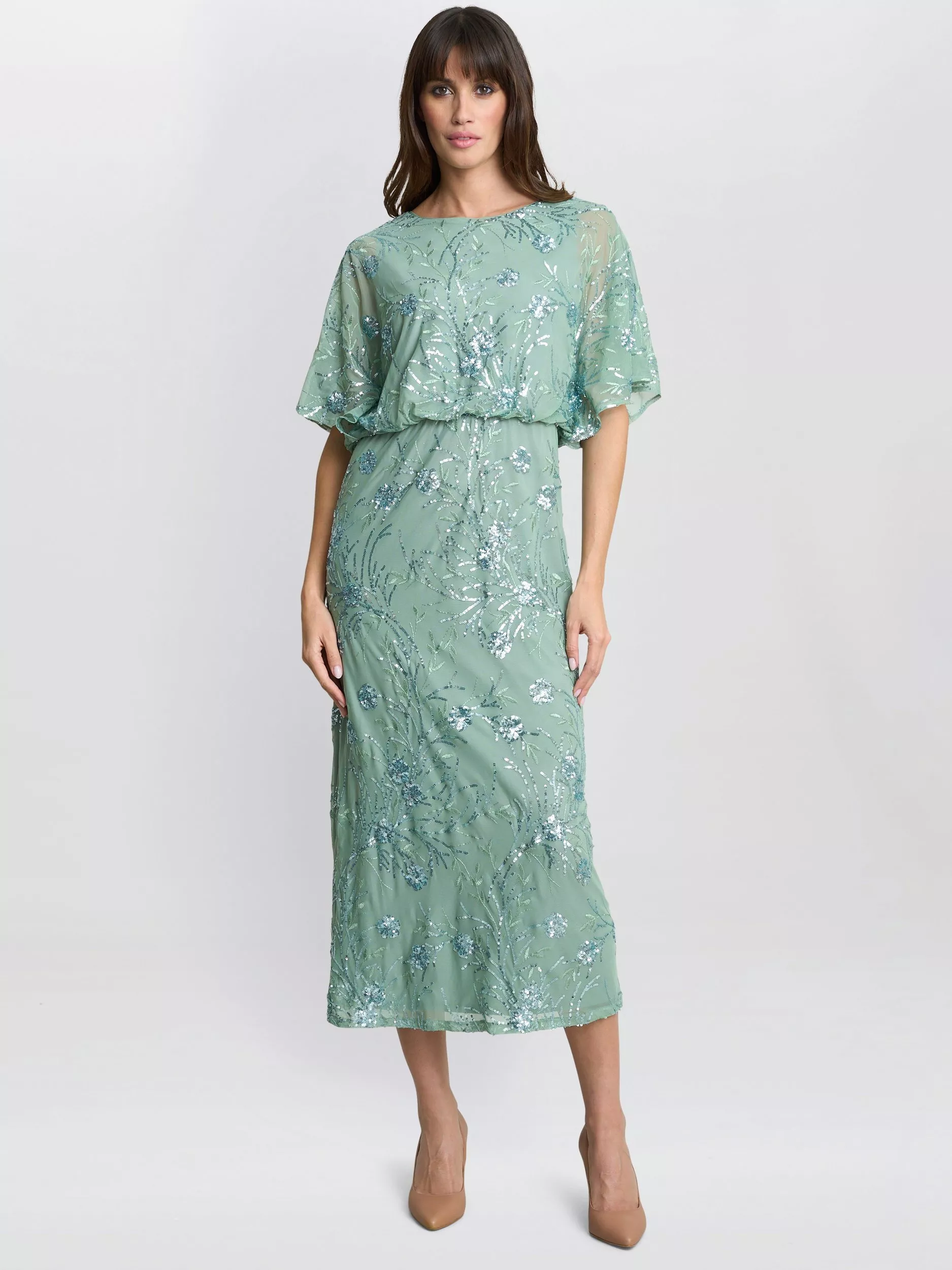Turn heads and dazzle everyone at your next evening occasion with this sequin Ava maxi dress. This dress exudes elegance and sophistication, perfect for special occasions. It features short, flowy sleeves that add a soft touch, while the cinched waistline enhances the feminine silhouette for a more flattering fit. The dress features a delicate sequin floral pattern that adds a touch of intricate detail and sparkle throughout the fabric. The dress is fully lined, with sleeves unlined.