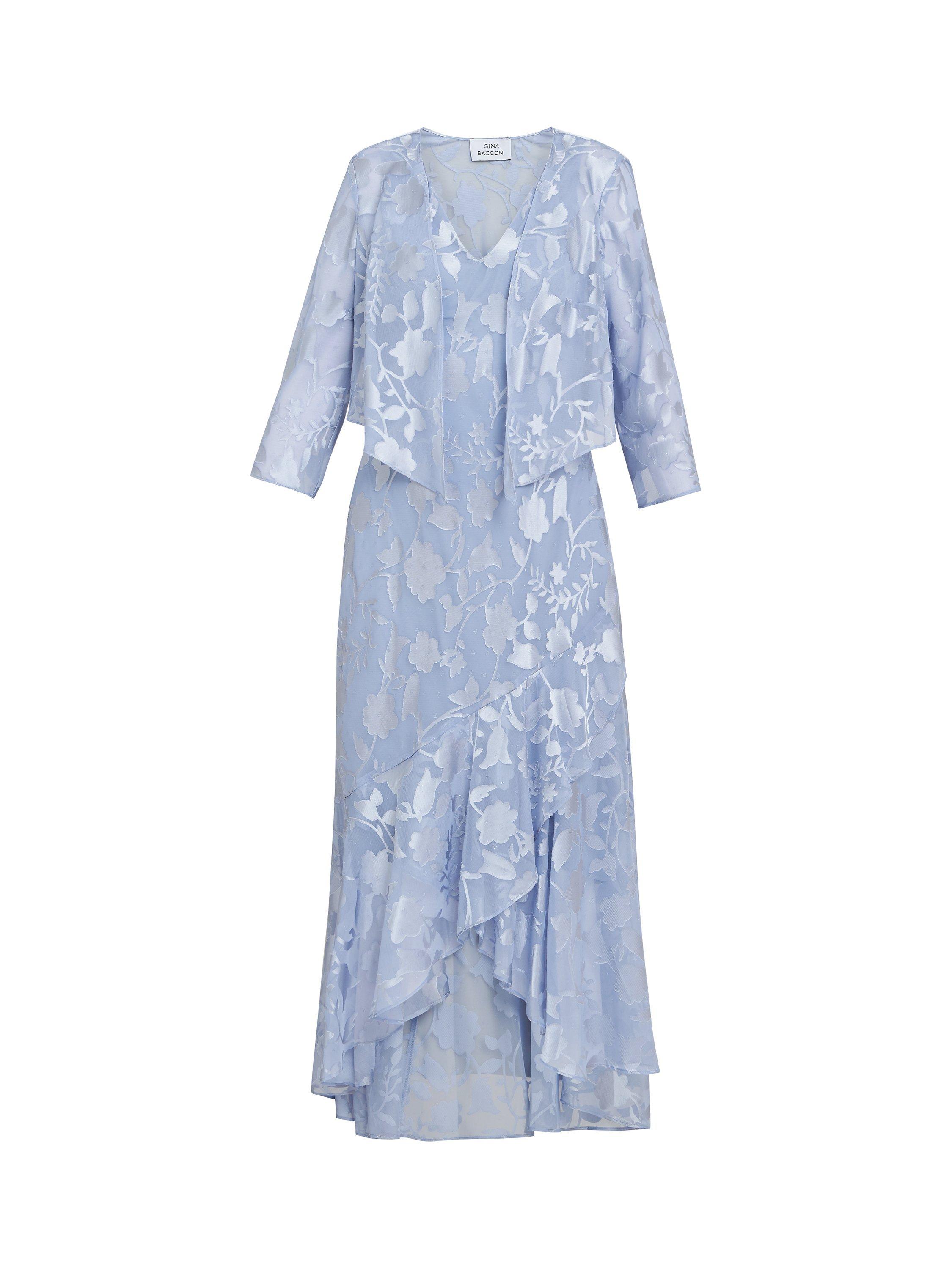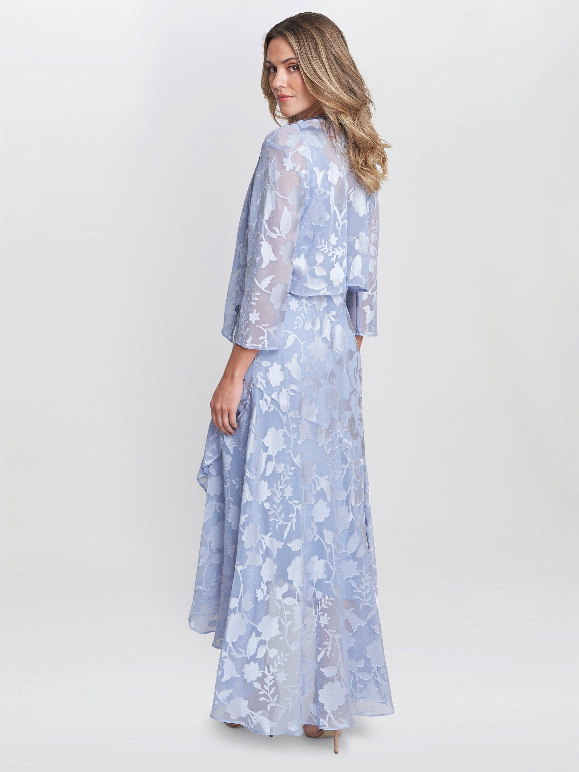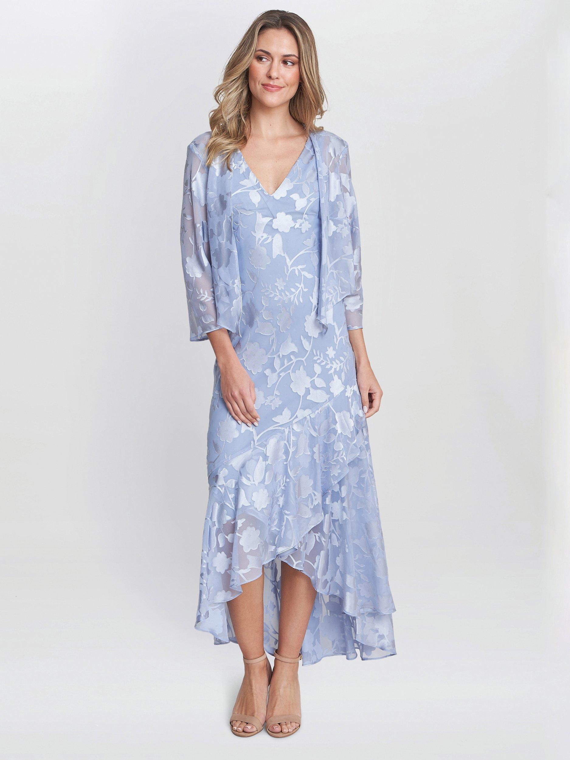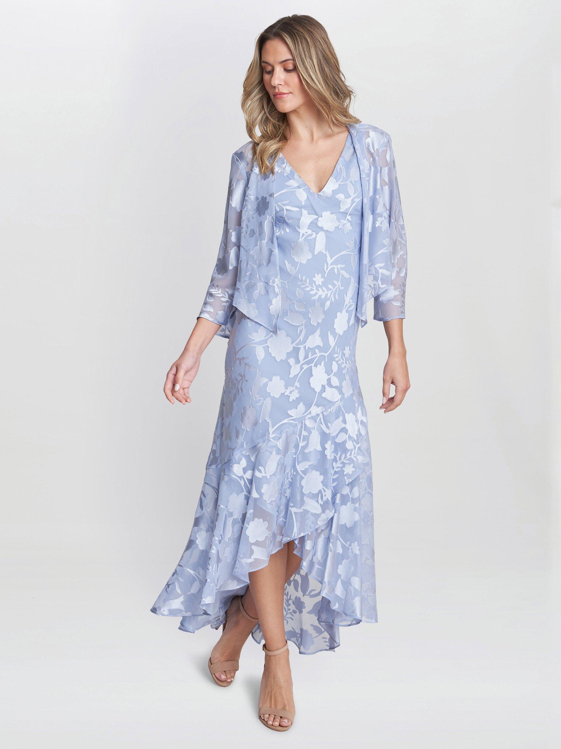 With a hanky hem for freedom of movement, this midi dress from Gina Bacconi comes with a cascading matching jacket. Adorned with a blooming flower print, it's a beautiful choice for special occasions.
