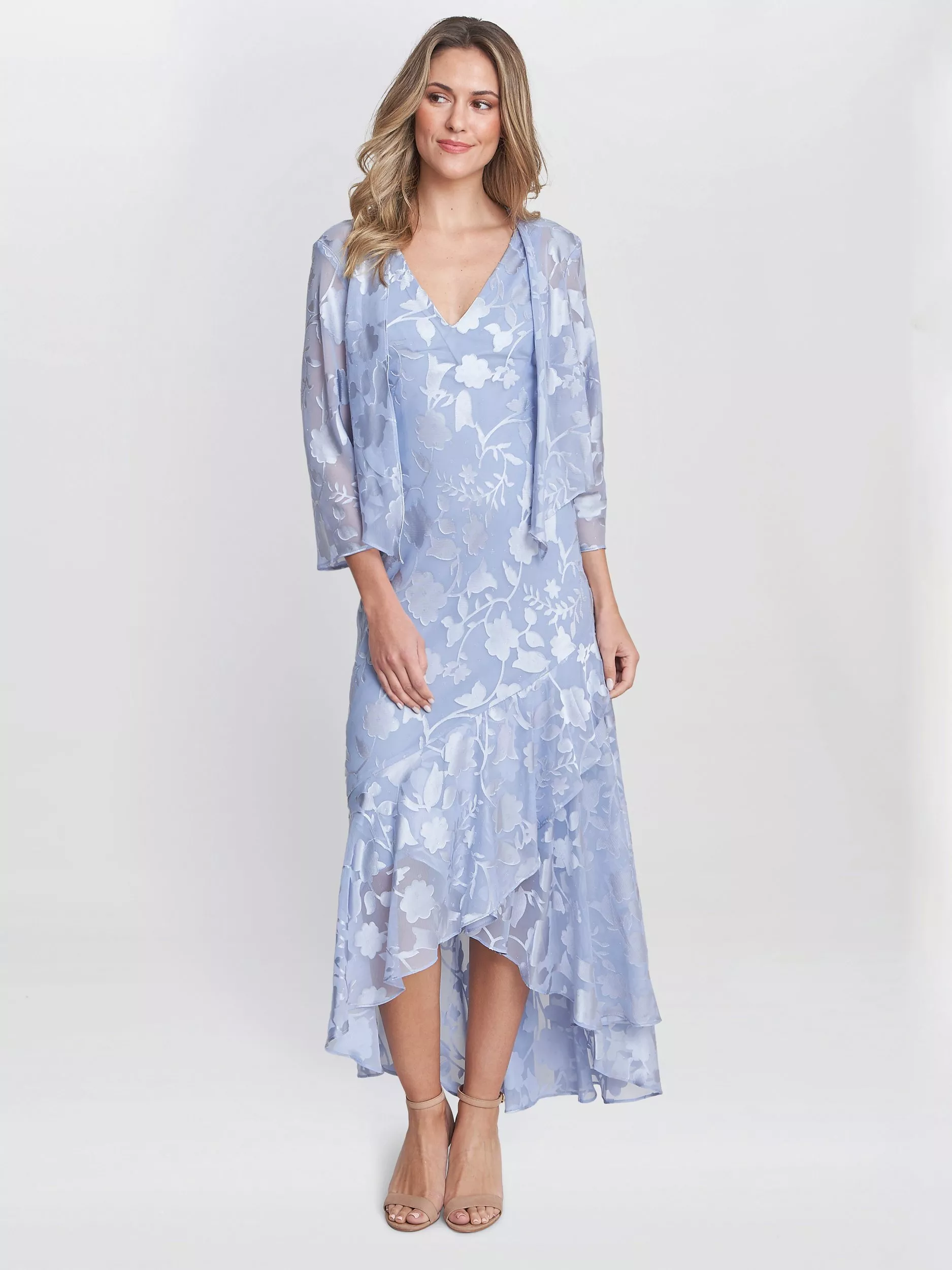 With a hanky hem for freedom of movement, this midi dress from Gina Bacconi comes with a cascading matching jacket. Adorned with a blooming flower print, it's a beautiful choice for special occasions.