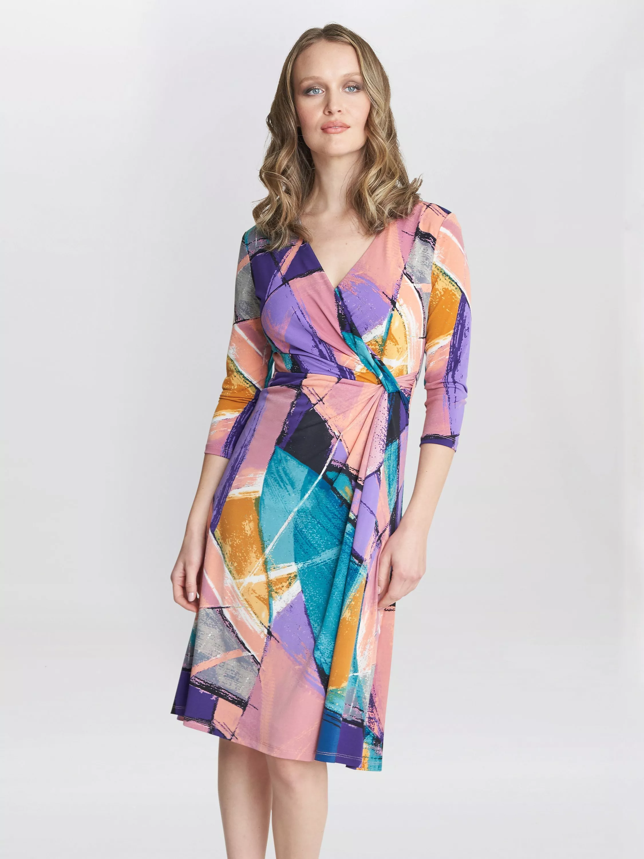 In a flattering A-line shape, this knee length dress from Gina Bacconi is crafted from a blend of fabrics. Effortlessly flattering thanks to a fuss-free v-neckline and three quarter length sleeves, it is topped with a statement abstract print.