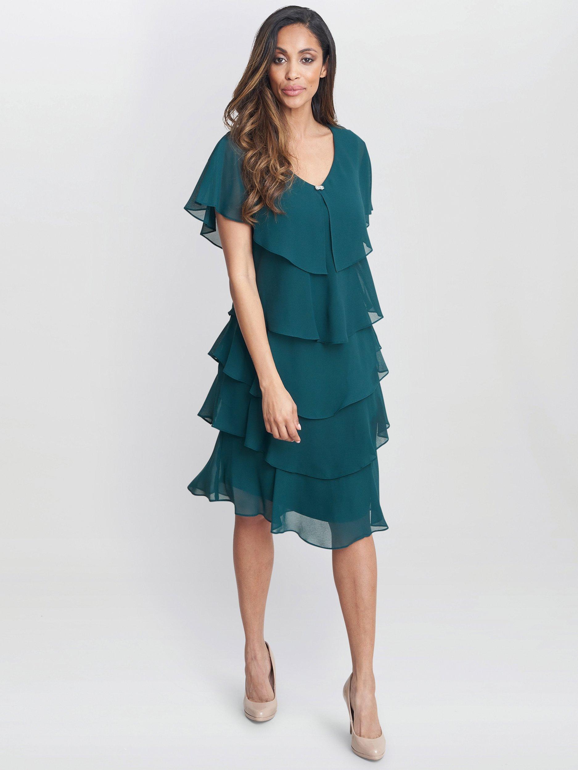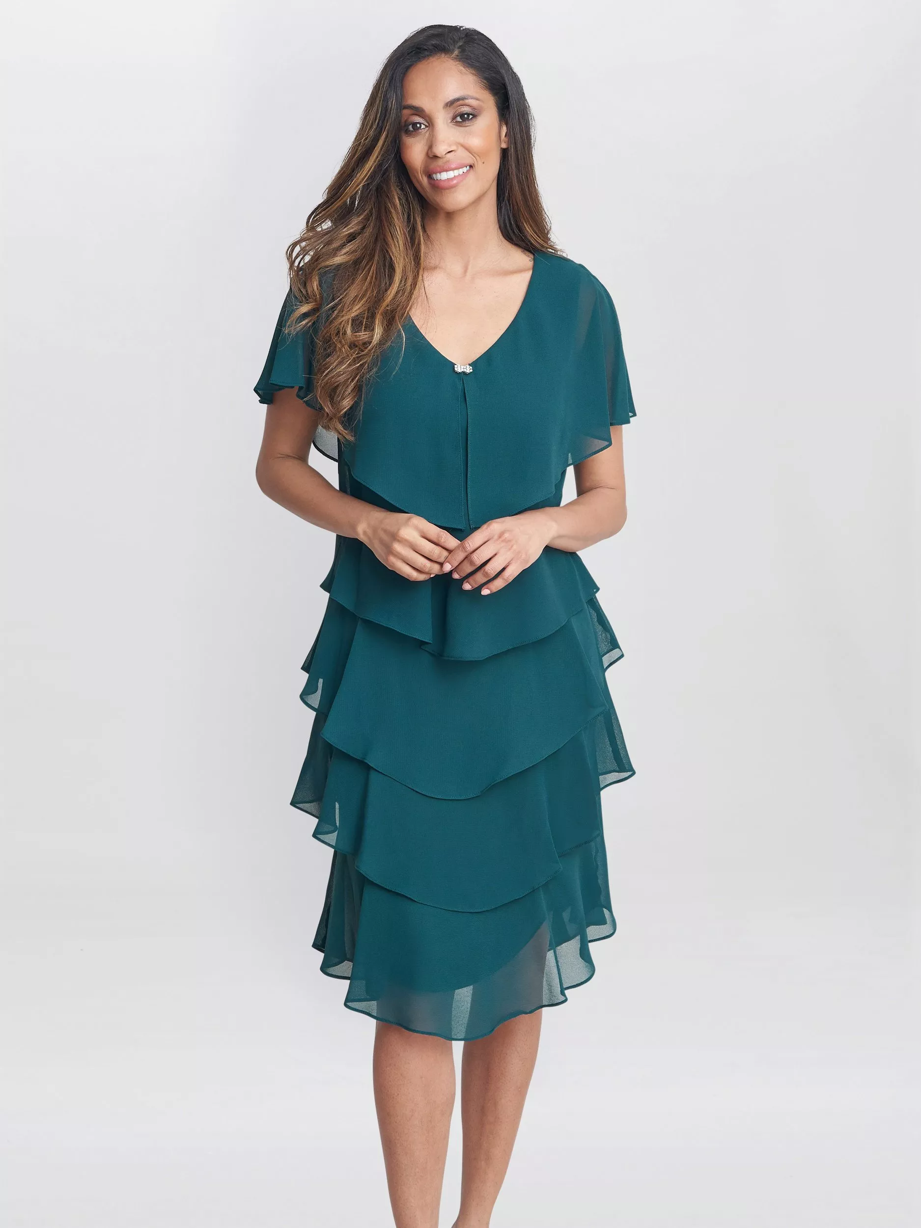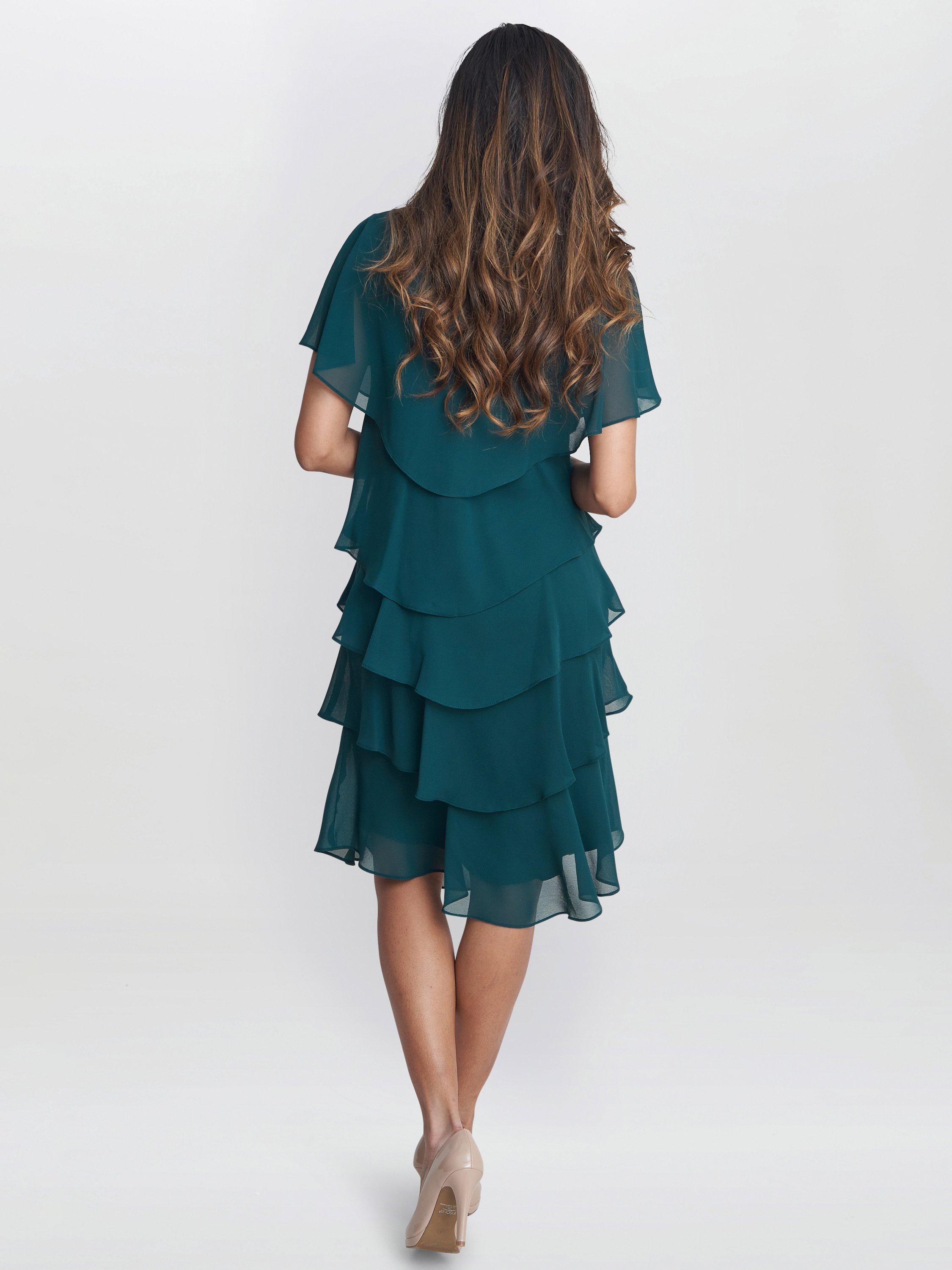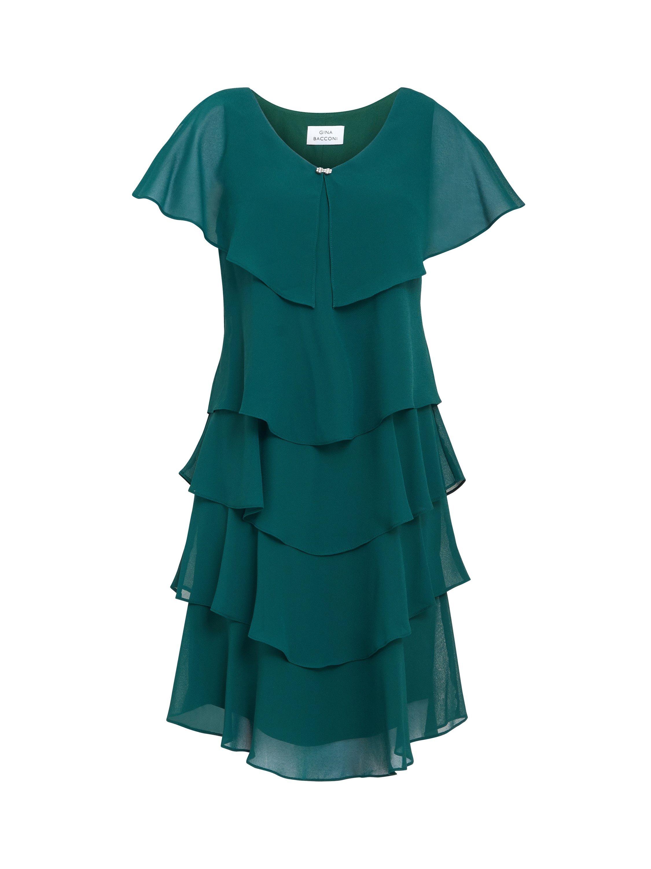 With a tiered design for added movement, this knee-length dress by Gina Bacconi boasts embellished detailing.