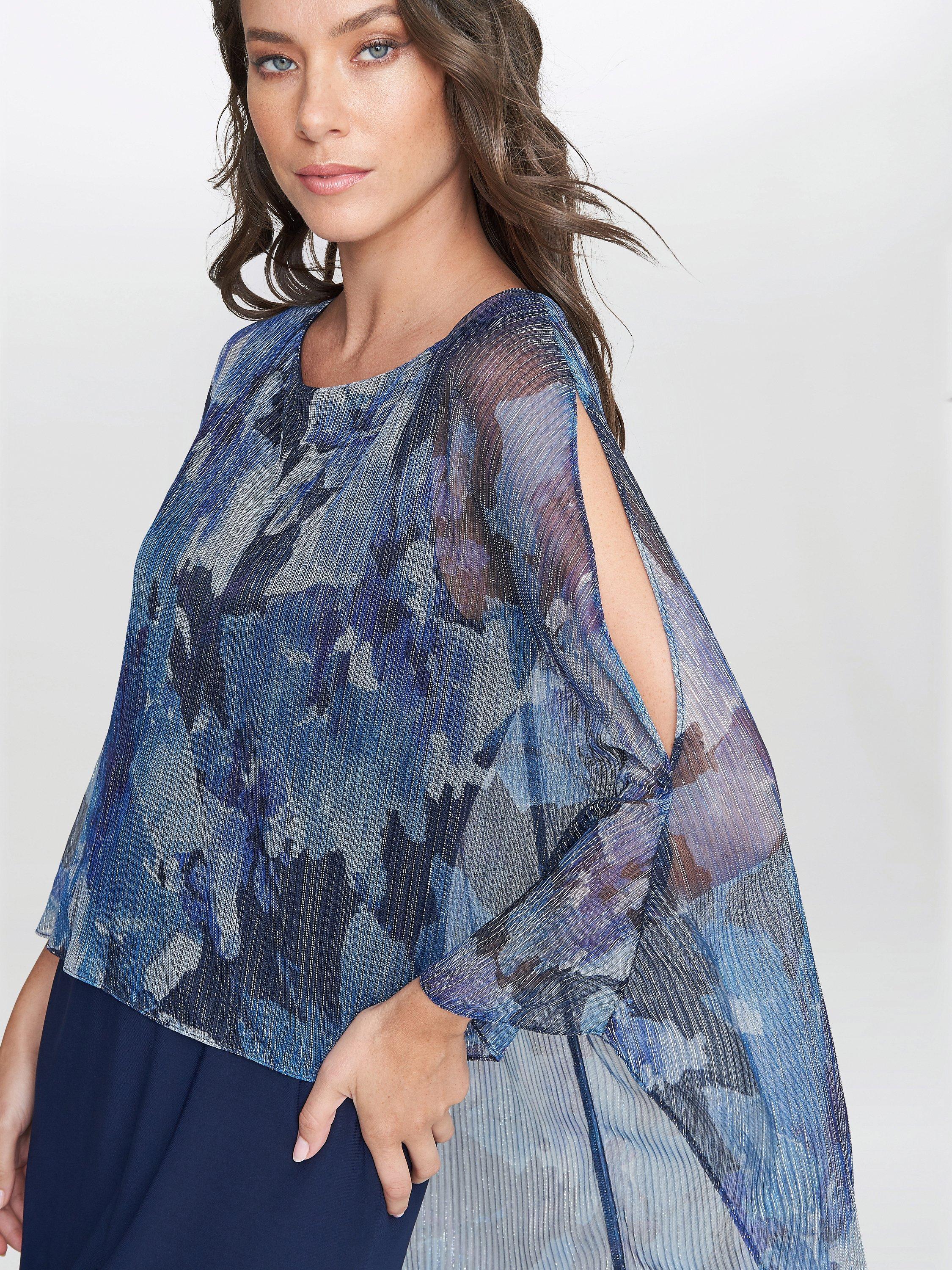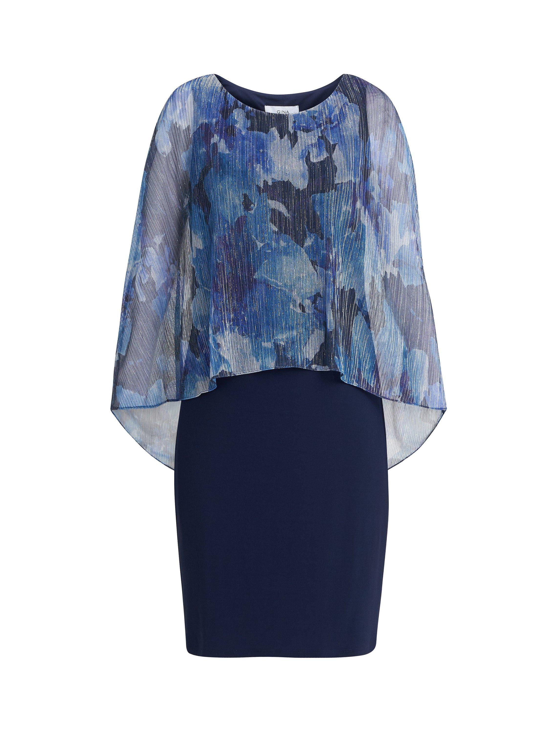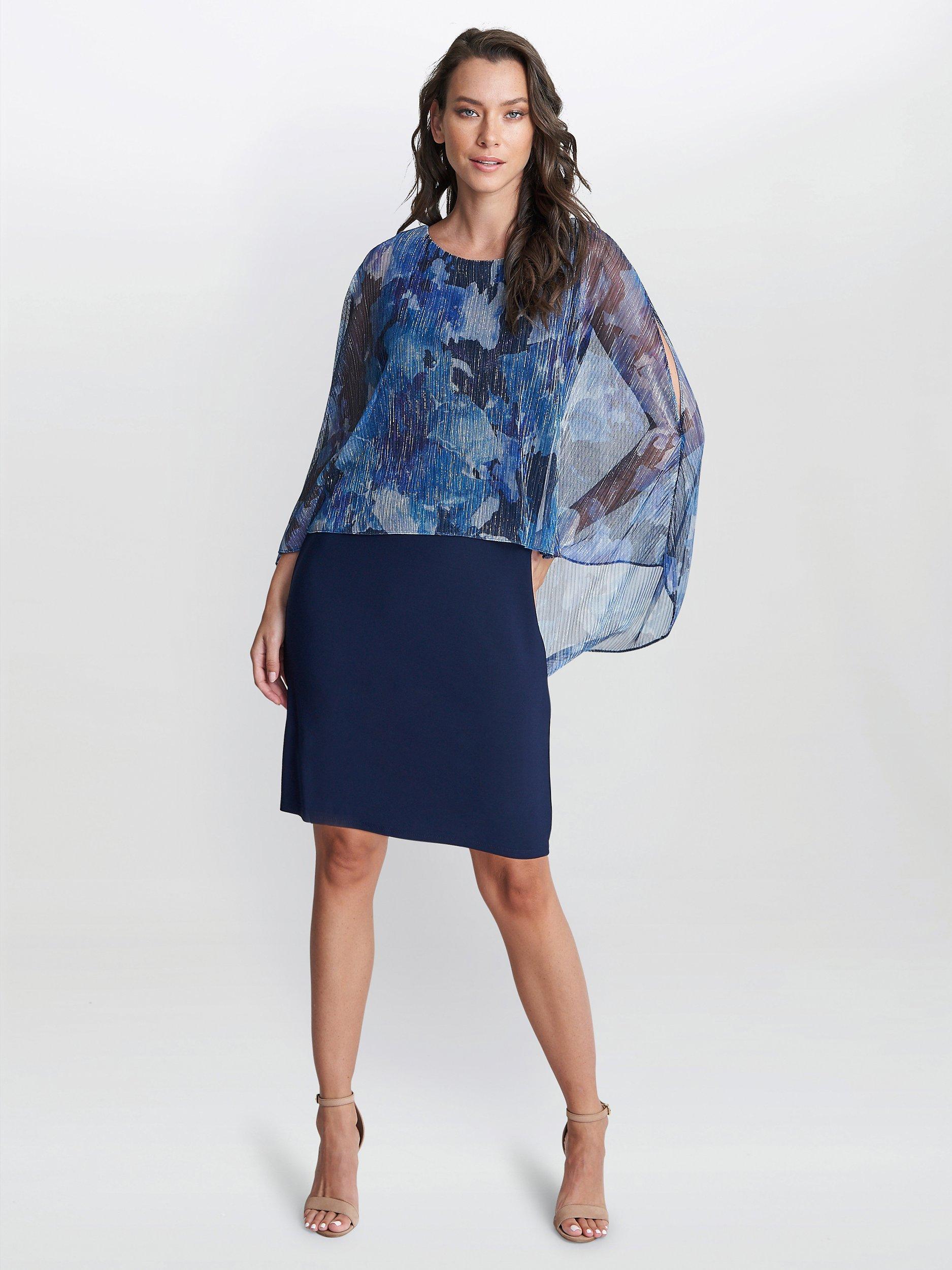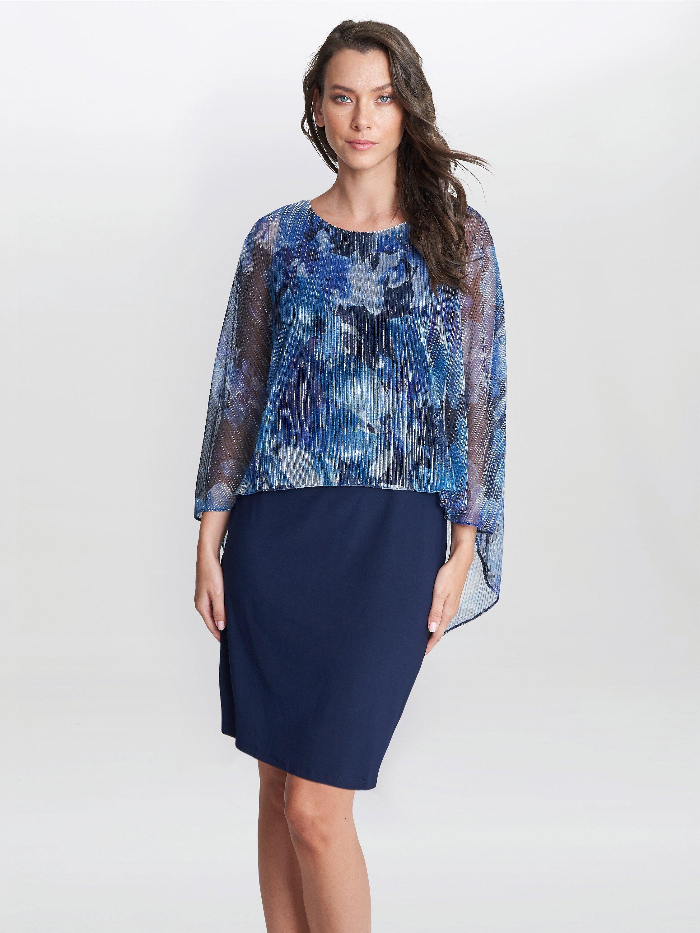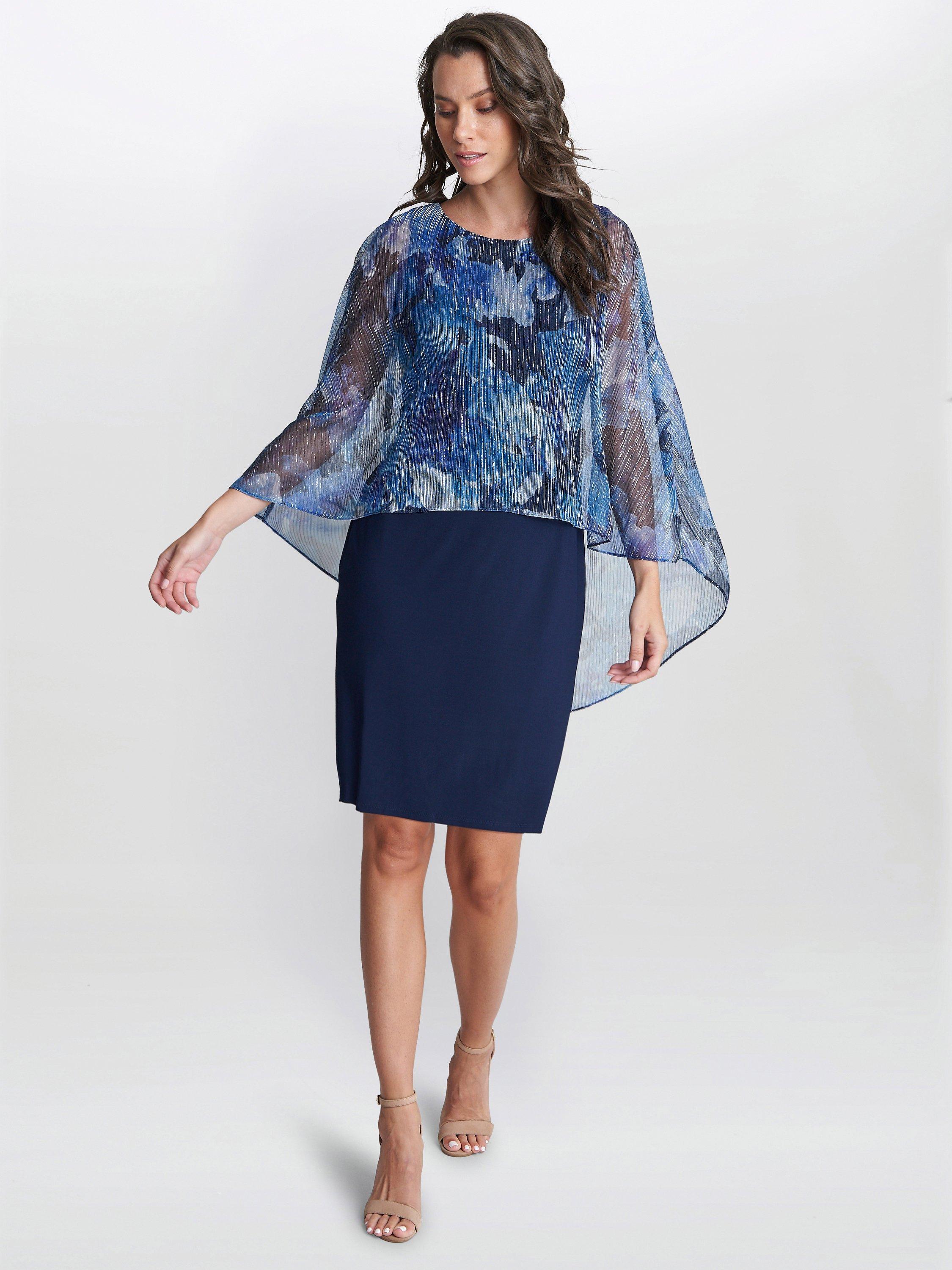 Entirely flattering with its A-line shape, this knee length dress from Gina Bacconi is made from a stretch jersey. Versatile with its scoop neckline and three quarter length sleeves, this style is illustrated with forever covetable metallic blooms on a cape-style bodice.