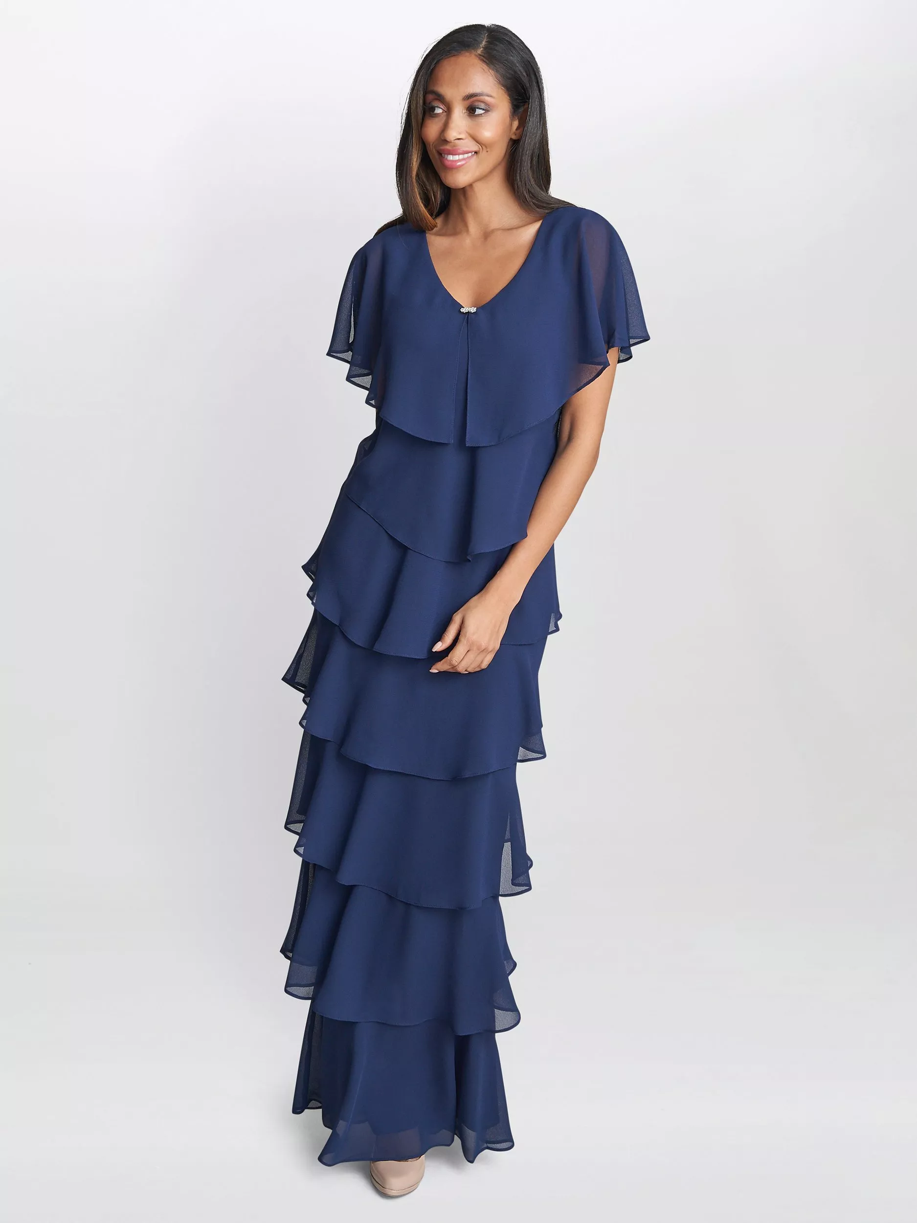 Feel wonderful in this maxi floaty tiered cape dress by Gina Bacconi. This dress takes a modern and flattering shape in layered pebble georgette with diamante detailing at the neck. Perfect for an event, this piece offers both comfort and elegance.