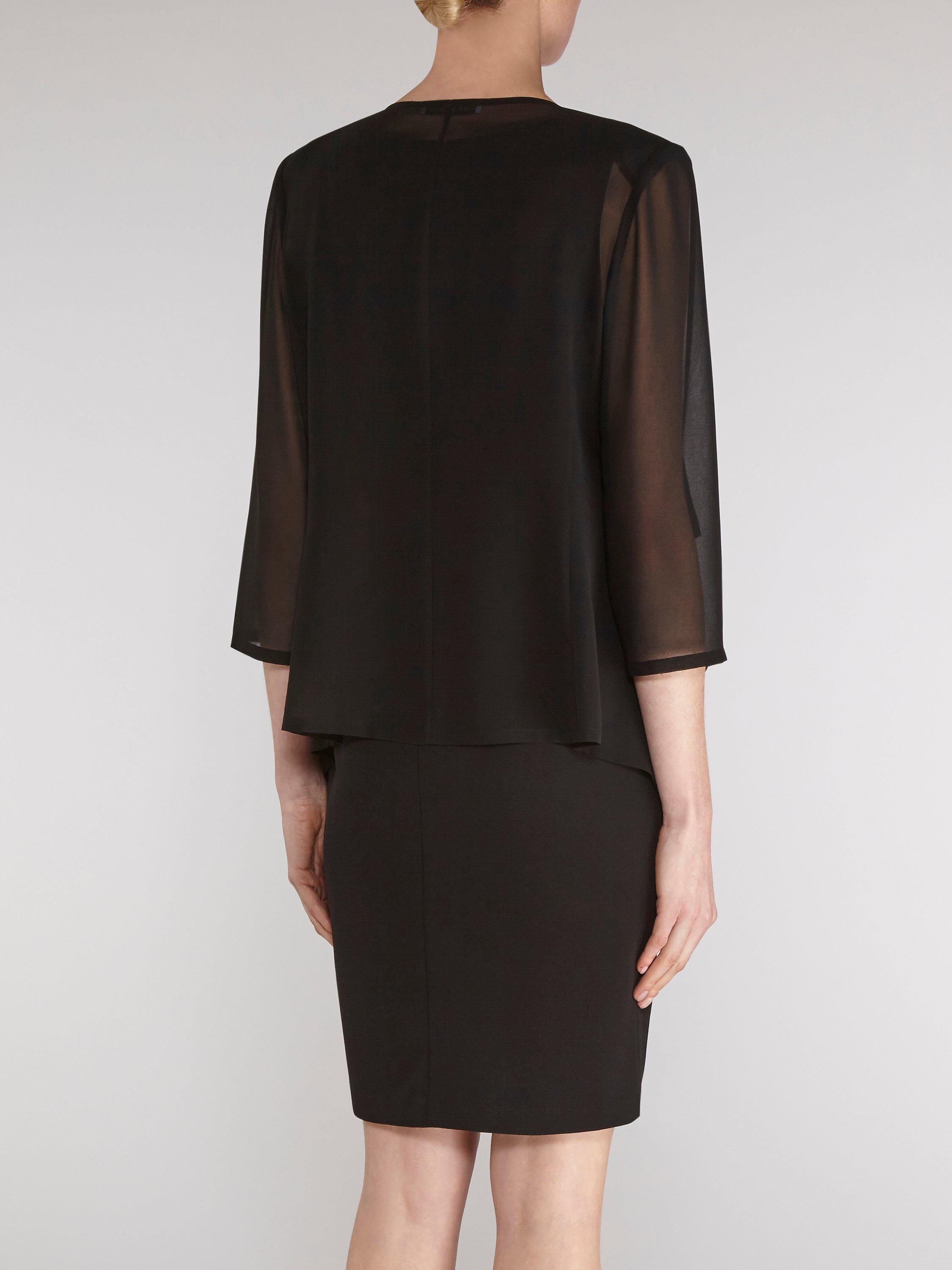Crafted from a lightweight chiffon fabric, it features three-quarter length sheer sleeves and shoulder pads for a structured silhouette.
