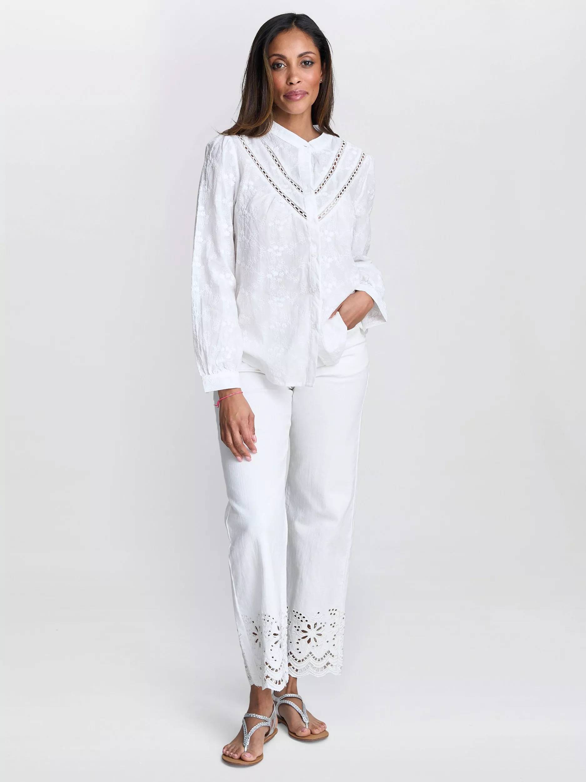 In a breathable cotton, this delicately embroidered, button down shirt is beautiful. A simple, classic style, elevated with its intricate floral pattern. Perfect for day or dress up for a warm evening.