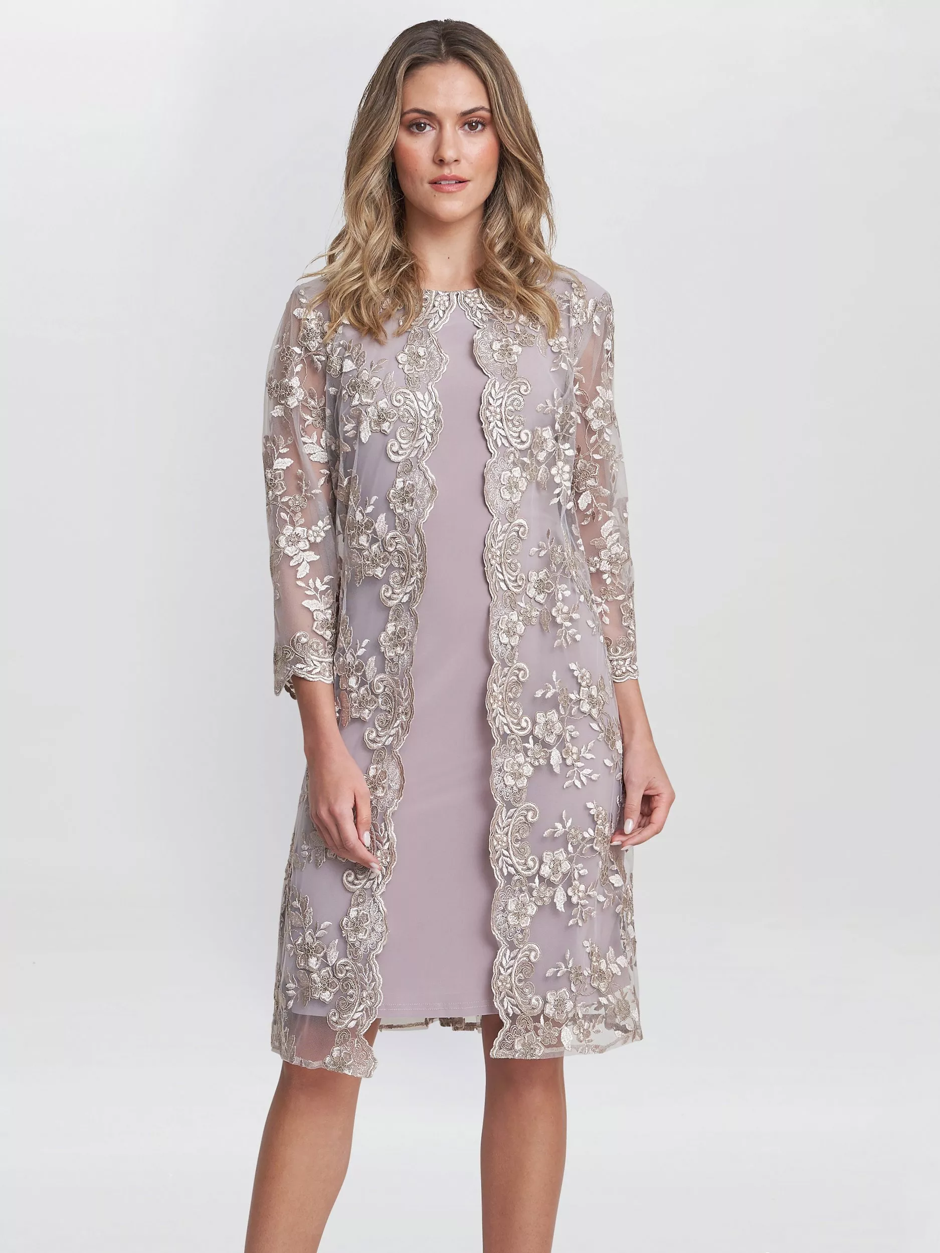 Flowing down the body in a columnar style, this knee length dress from Gina Bacconi is made using a blend of fabrics. With a simple round neck and three quarter length sleeves, this style is elevated with intricate embroidery.